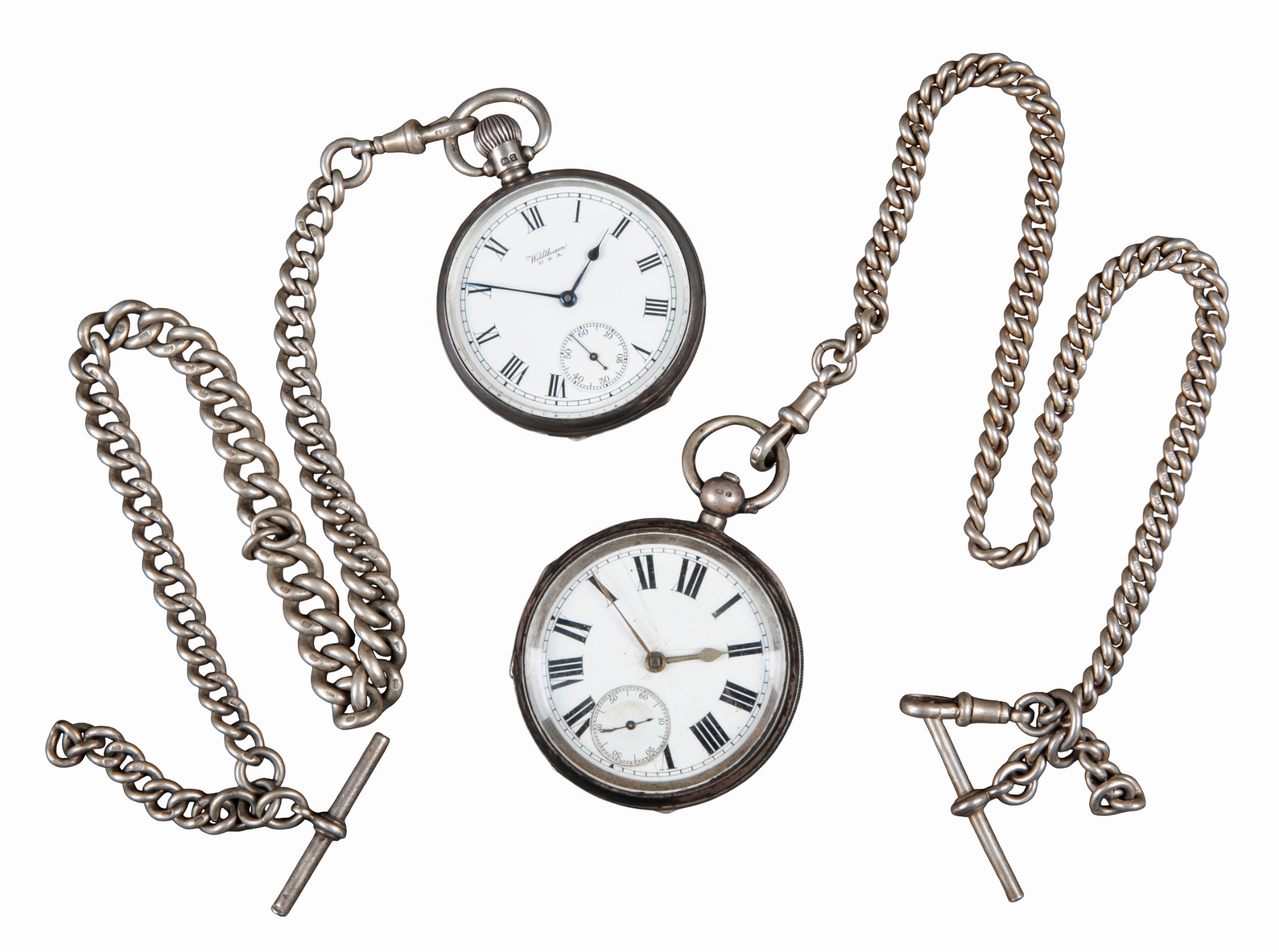 with keyless wind movement, white enamel dial, subsidiary seconds dial, black Roman numerals, dark blue steel hands, case diameter approx. 45mm, on a silver hallmark pocket watch chain; together with another silver hallmark pocket watch with silver pocket watch chain (2)