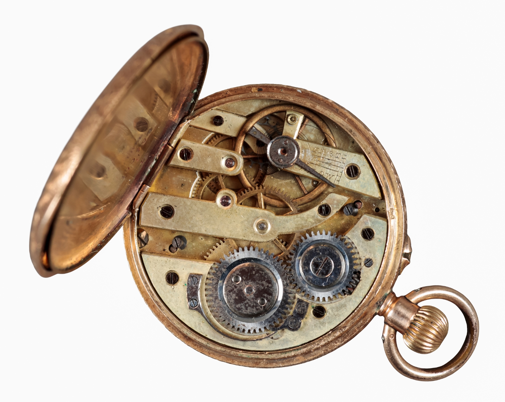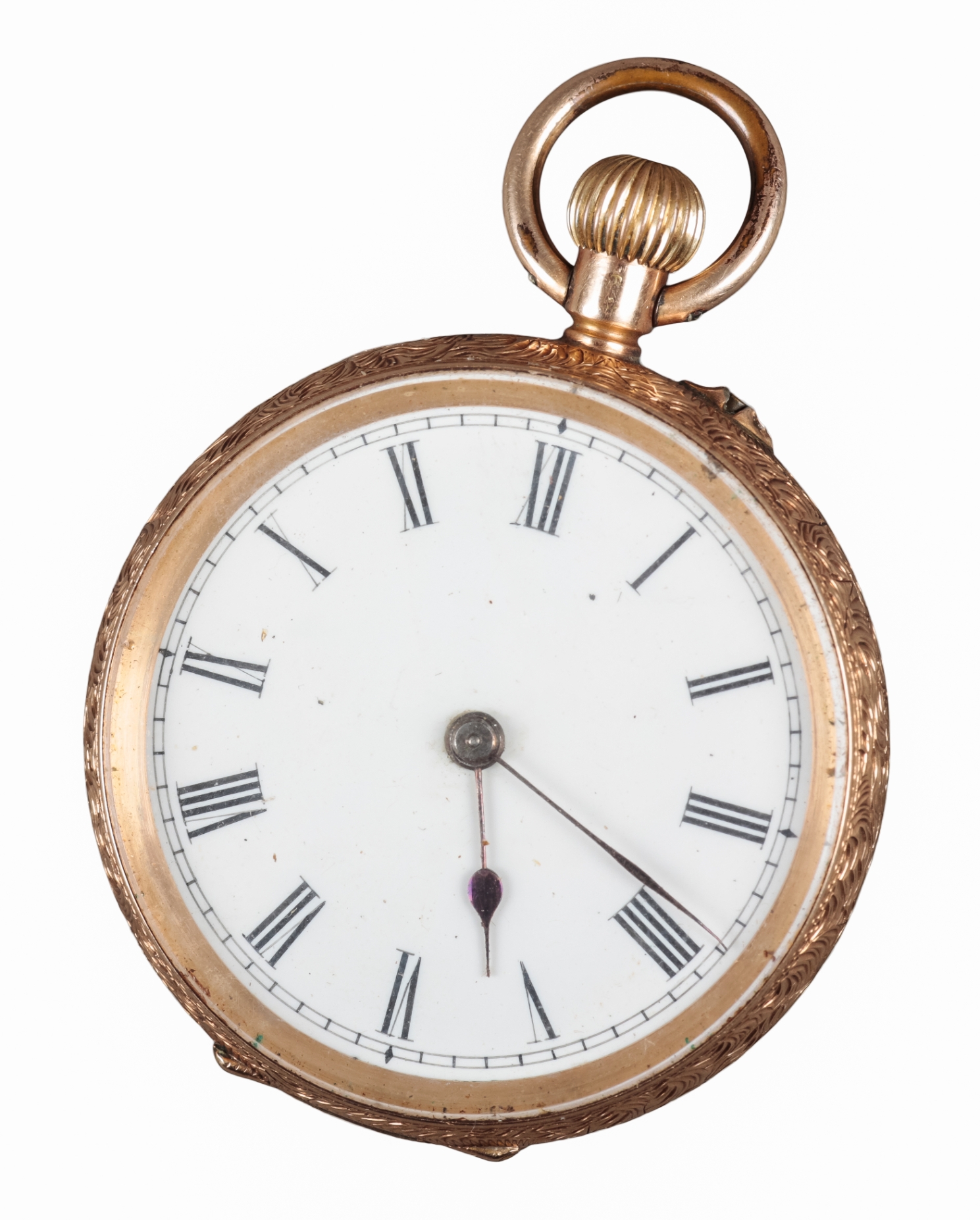 with keyless wind movement, white enamel dial, black Roman numerals, dark blue steel hands, floral engraved decoration case, case diameter approx. 34mm, c. 34.78 grams gross weight