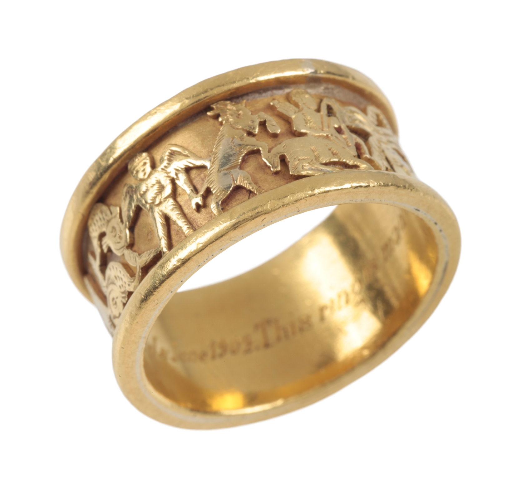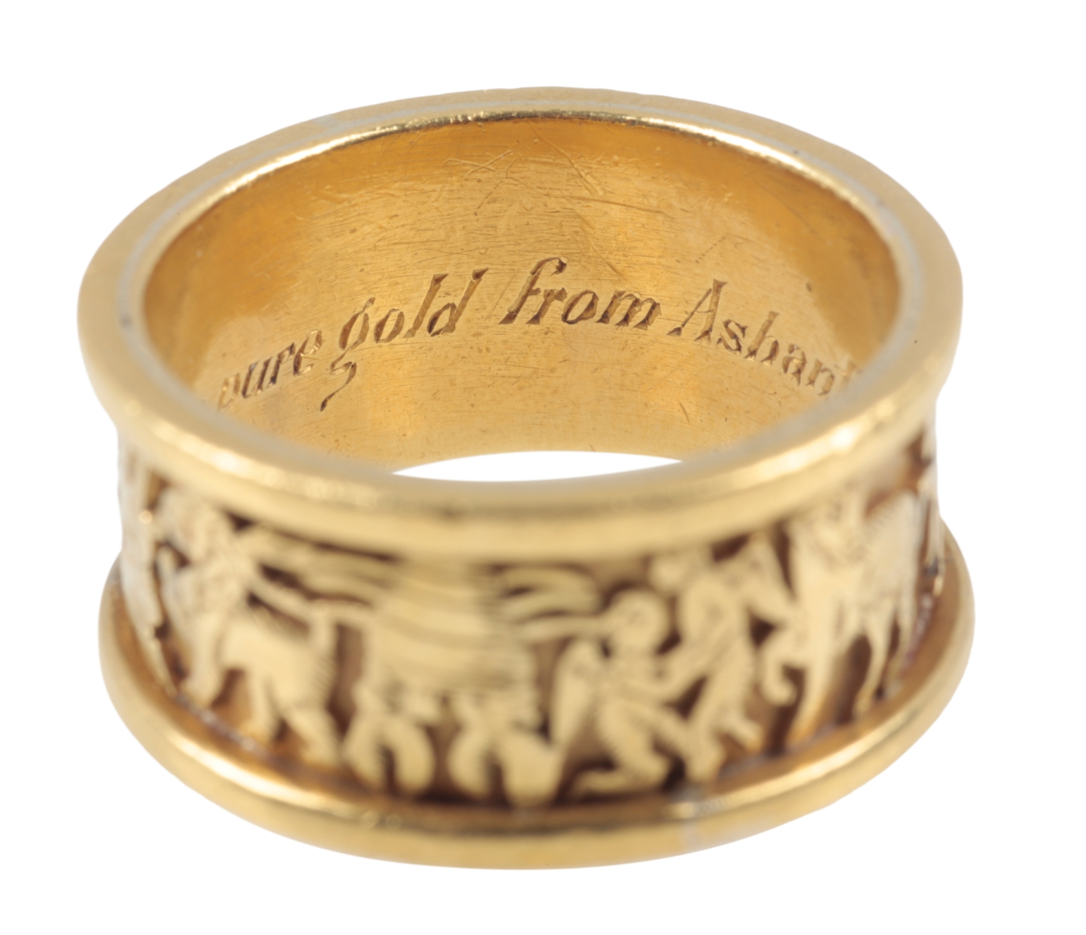 the band decorated with figures and beasts, the interior inscribed " This ring from pure gold from Ashanti gold fields June 1902", surface testing as high ct, ring size N, c. 9.5 grams