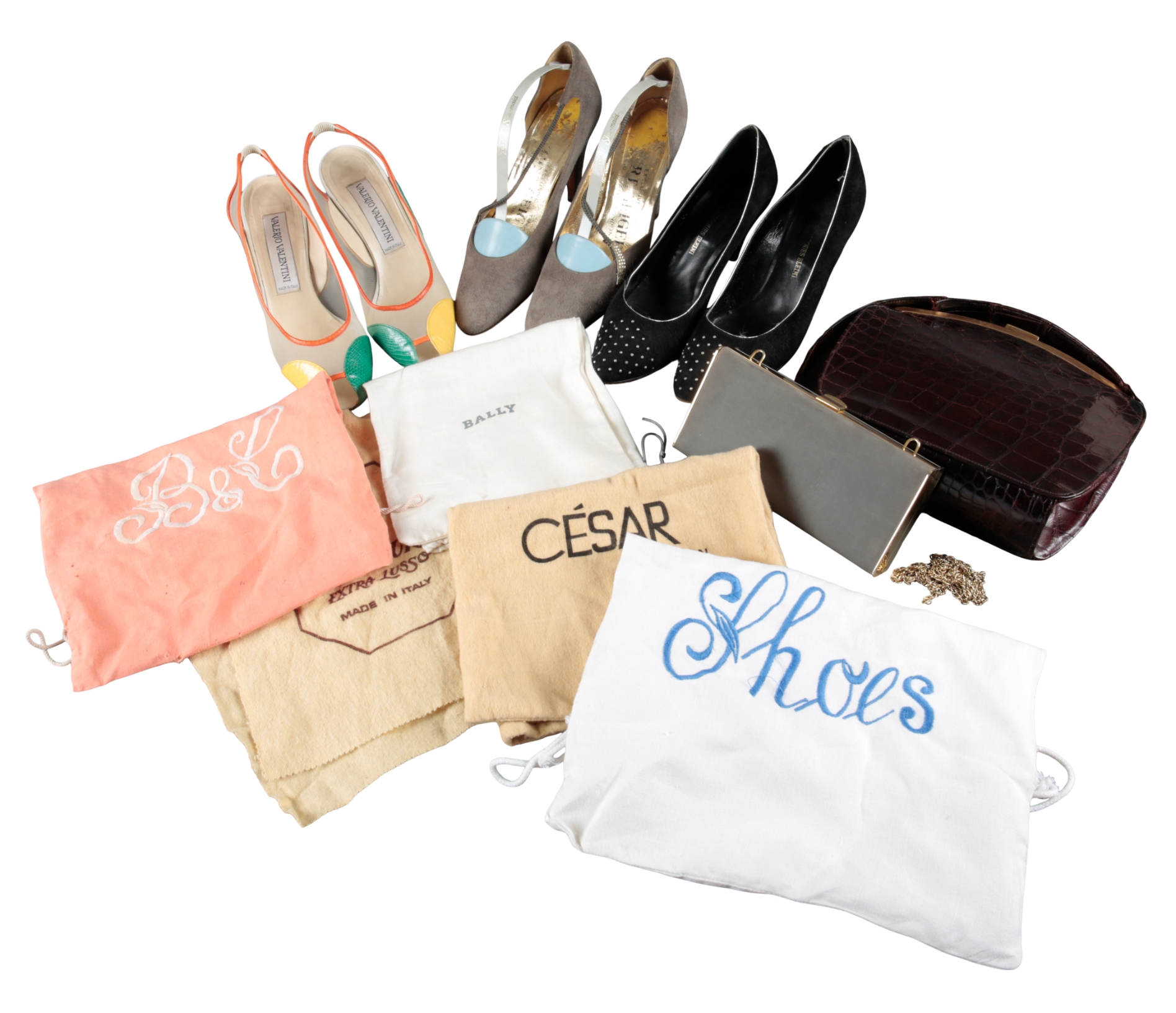 comprising a pair of Valerio Valentini green, yellow and orange high heeled shoes, size 38, a pair of Jacques Eleini studded black suede high heeled shoes, a pair of Kurt Geiger grey suede high heeled shoes, a Boutique Bally grey leather and gilt metal clutch bag, a brown crocodile leather handbag, and embroidered black shawl and a pair of green paste earrings (10)