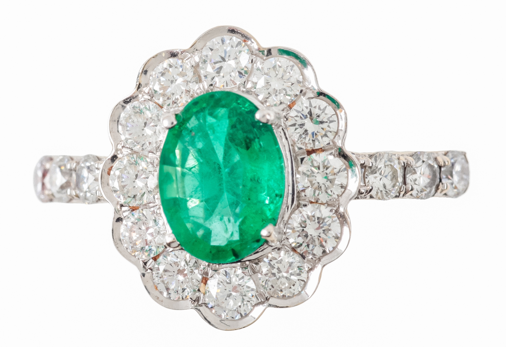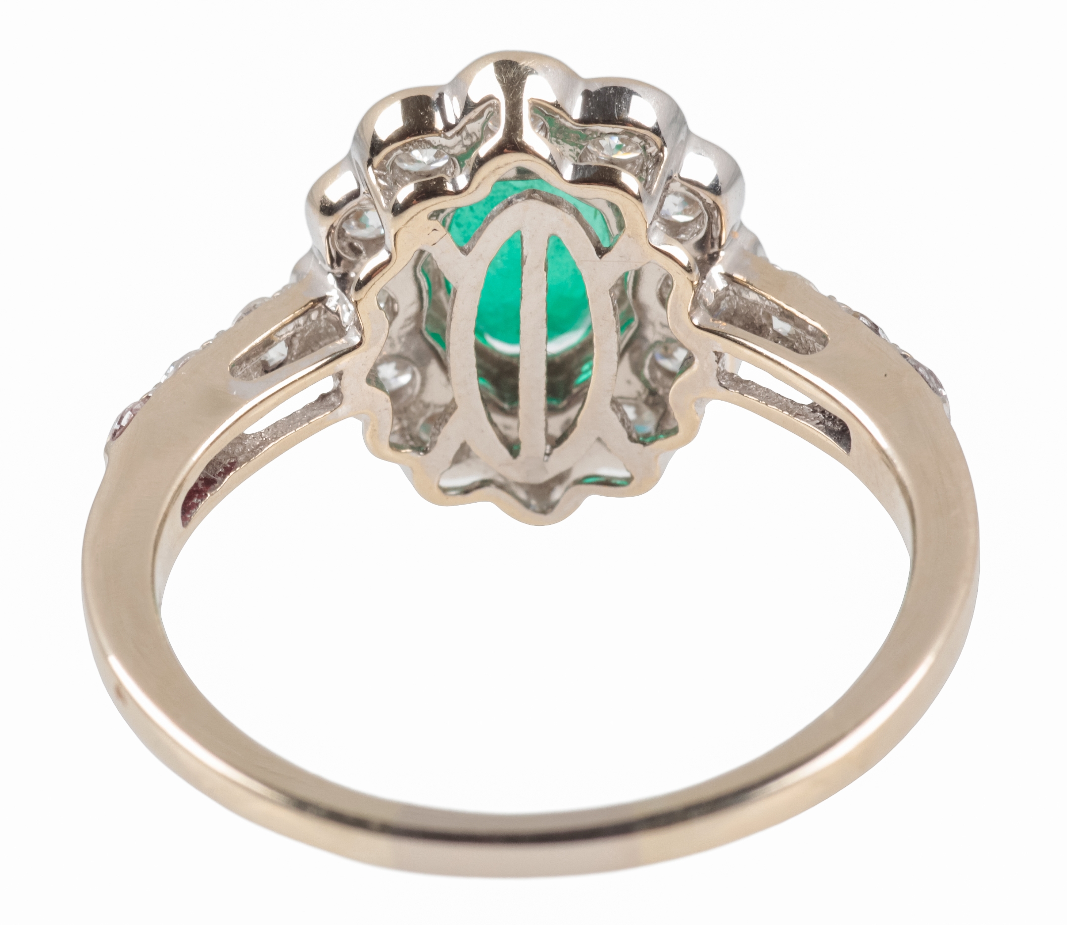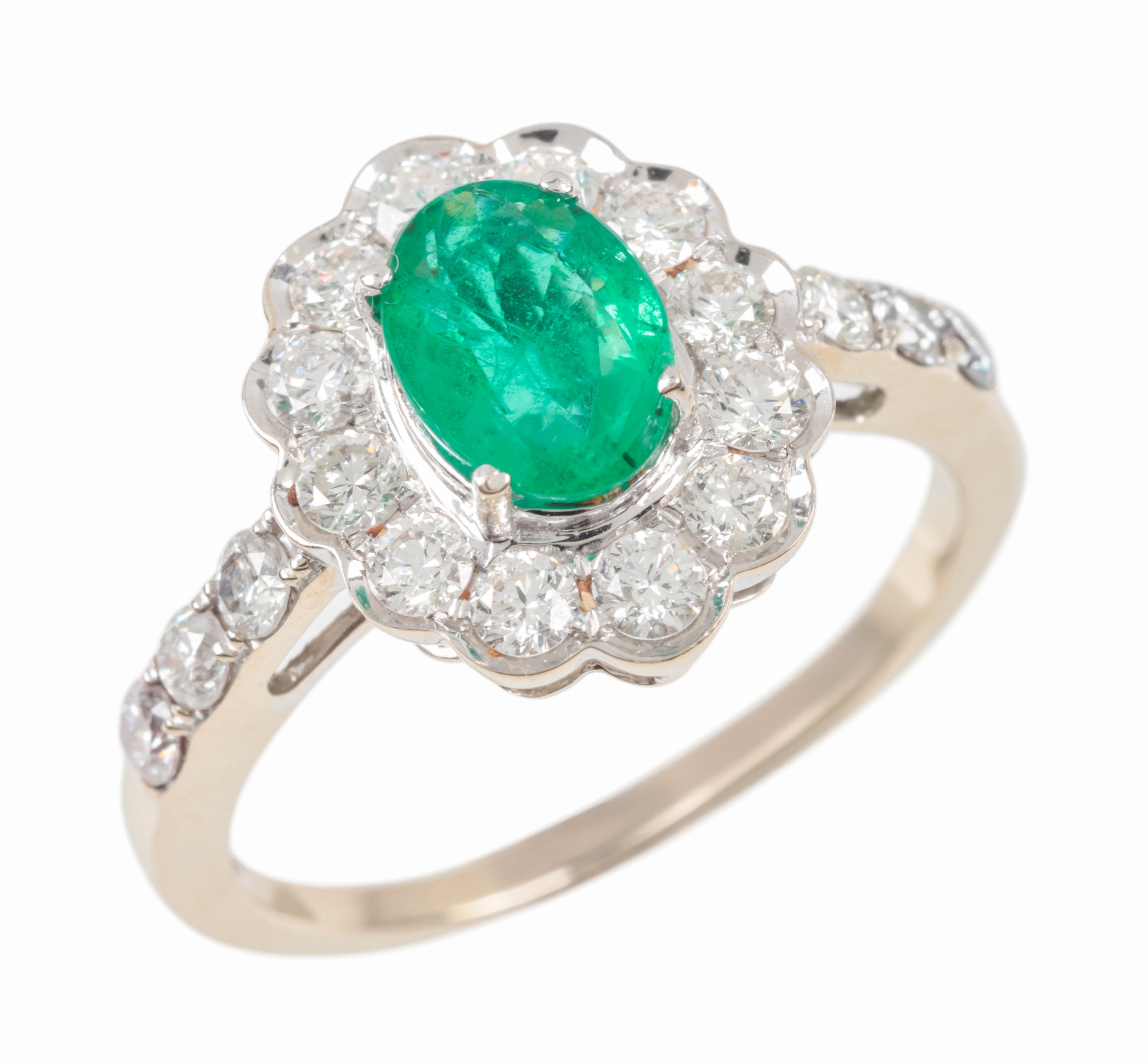 the oval mixed cut emerald c. 7.8mm x 6.1 mm (unable to measure depth due to setting) surrounded by twelve round brilliant cut diamonds in shaped 18ct gold mount with a further three round brilliant cut diamonds to each shoulder, combined diamond weight c. 1.14 carats, the shank hallmarked, ring size Q, c. 4.6 grams