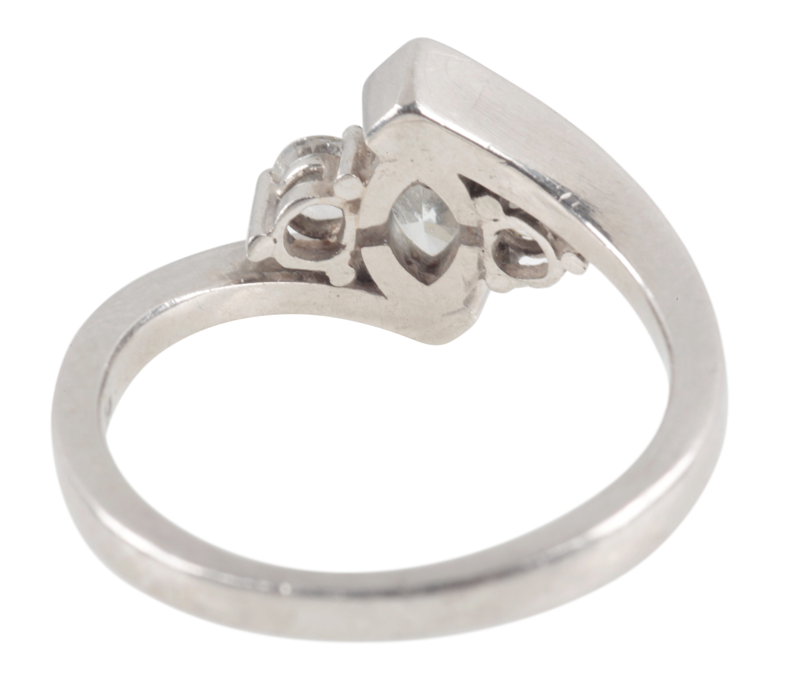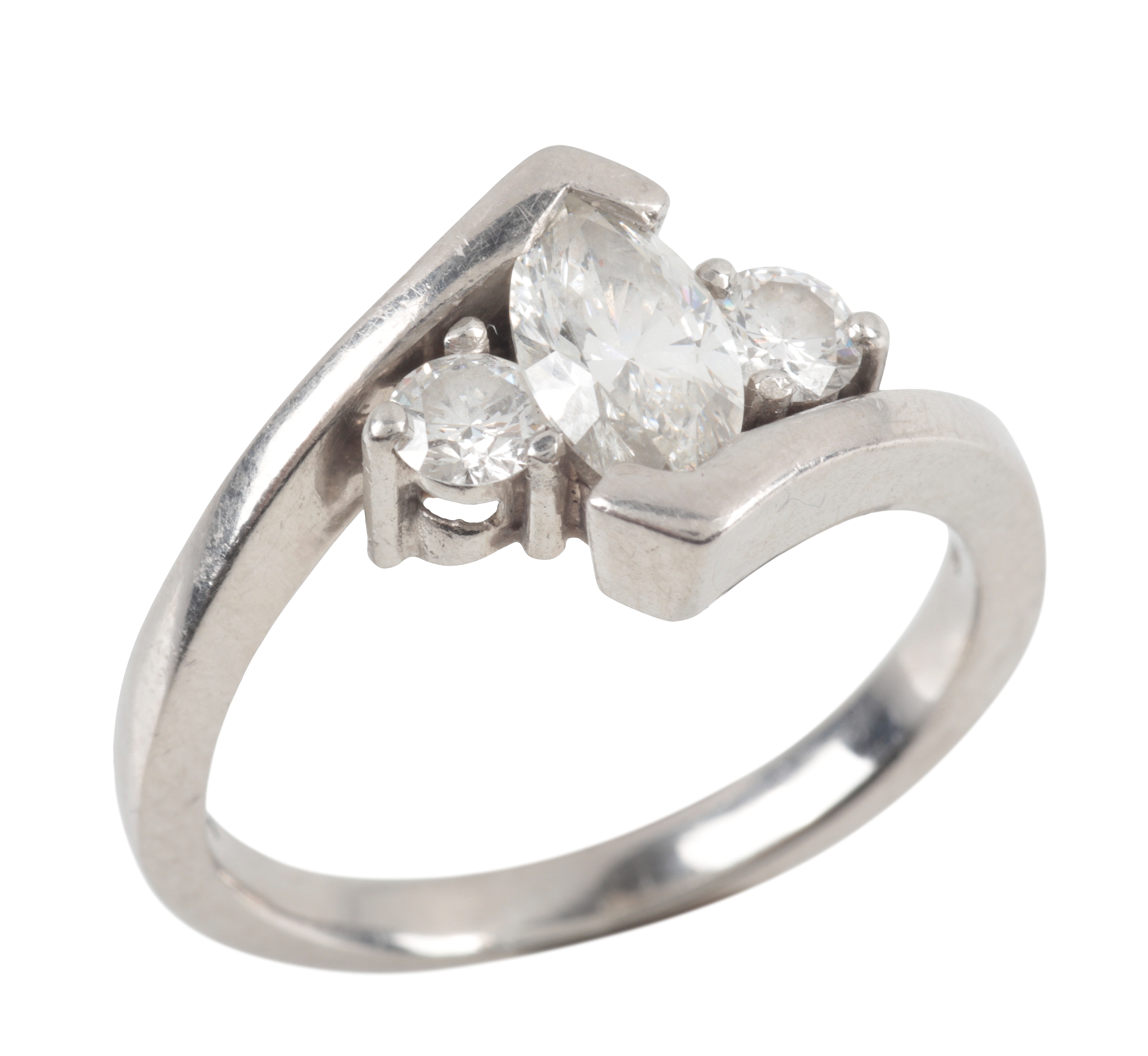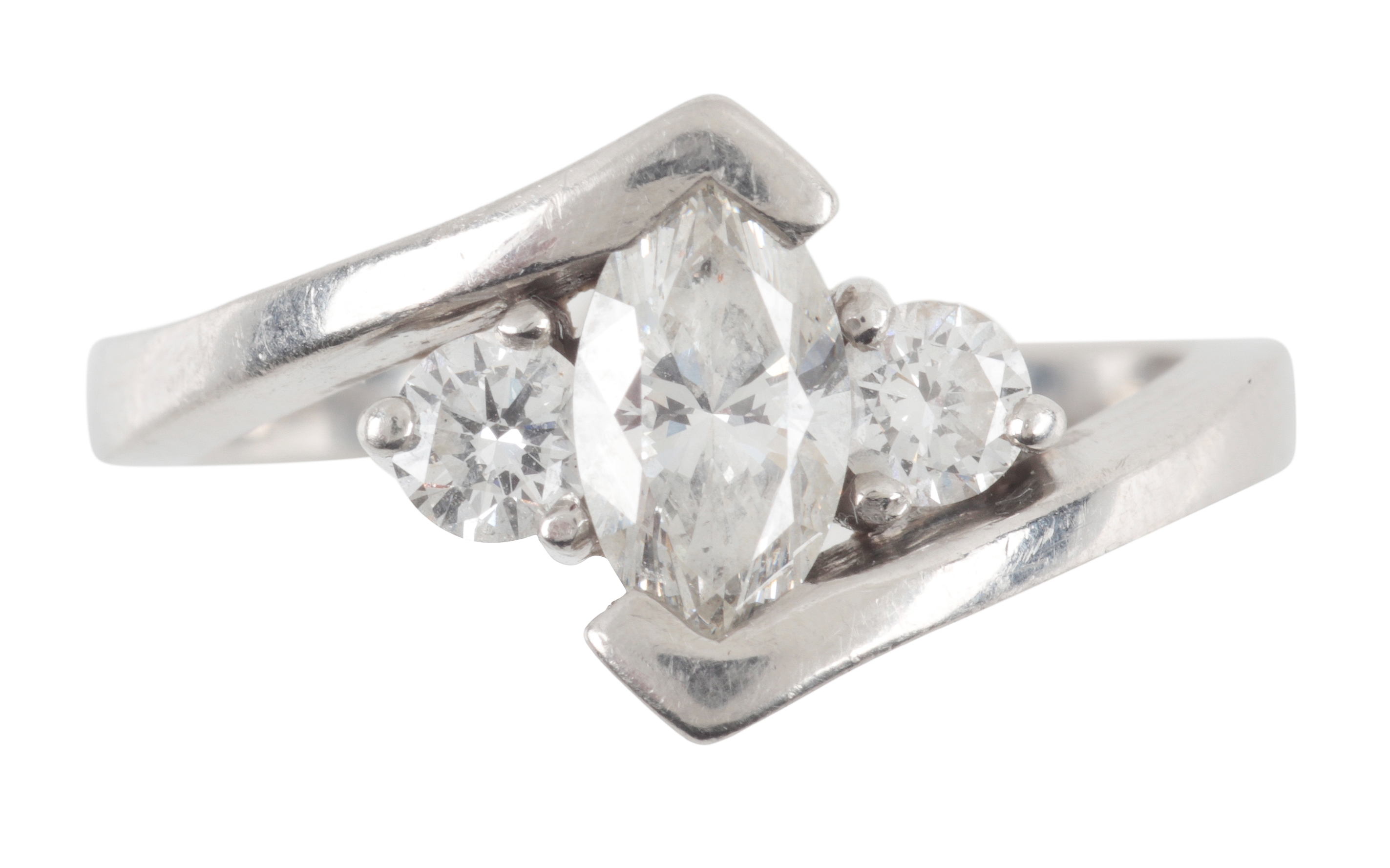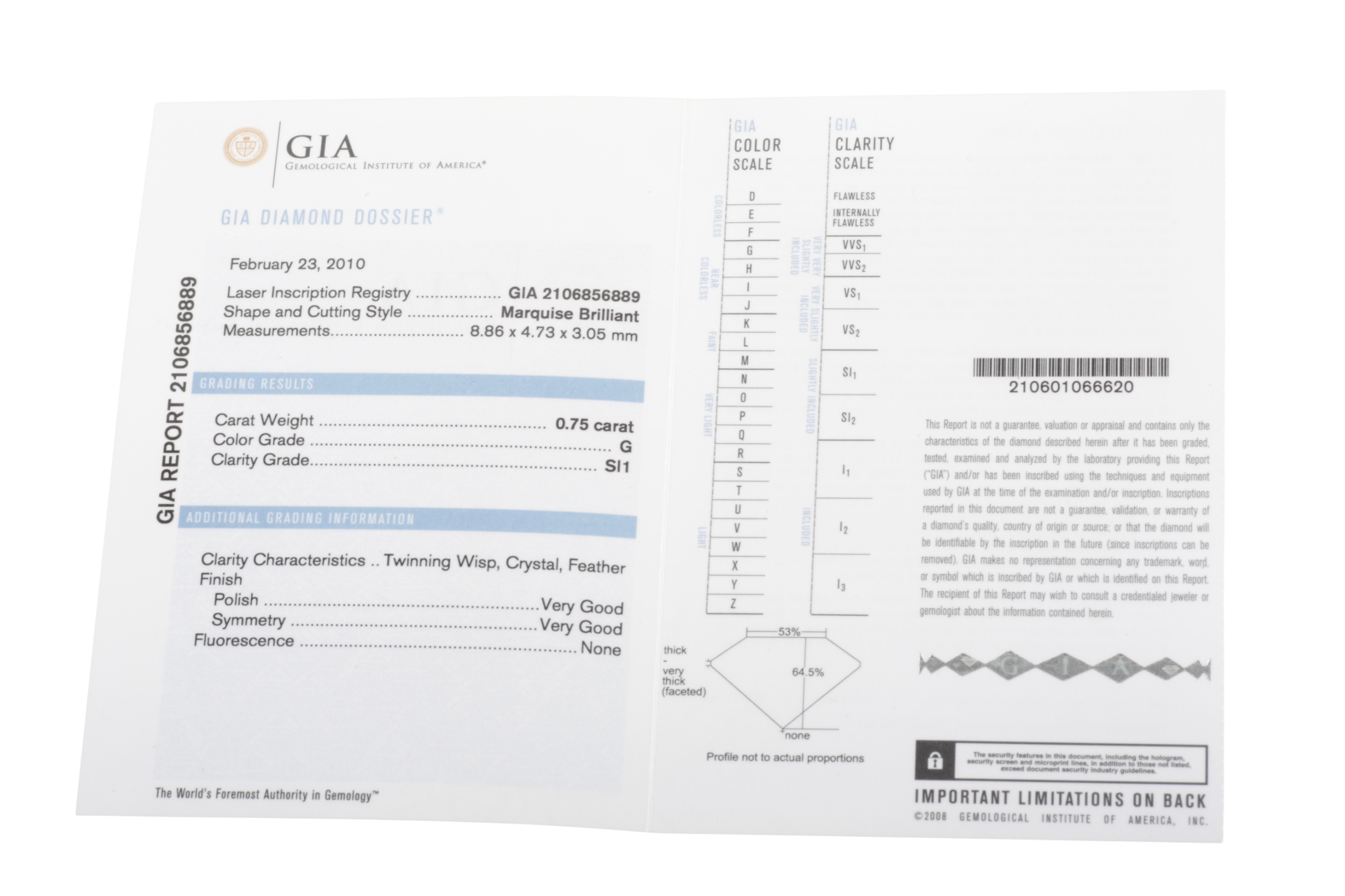 the central marquise cut diamond 0.75 carats, flanked by round brilliant cut diamonds (c. 0.37 carats combined) set in hallmarked platinum, size Q, c. 5 grams, with GIA Certificate stating Marquise Brilliant, 0.75, G, SI1, dated February 23 2010