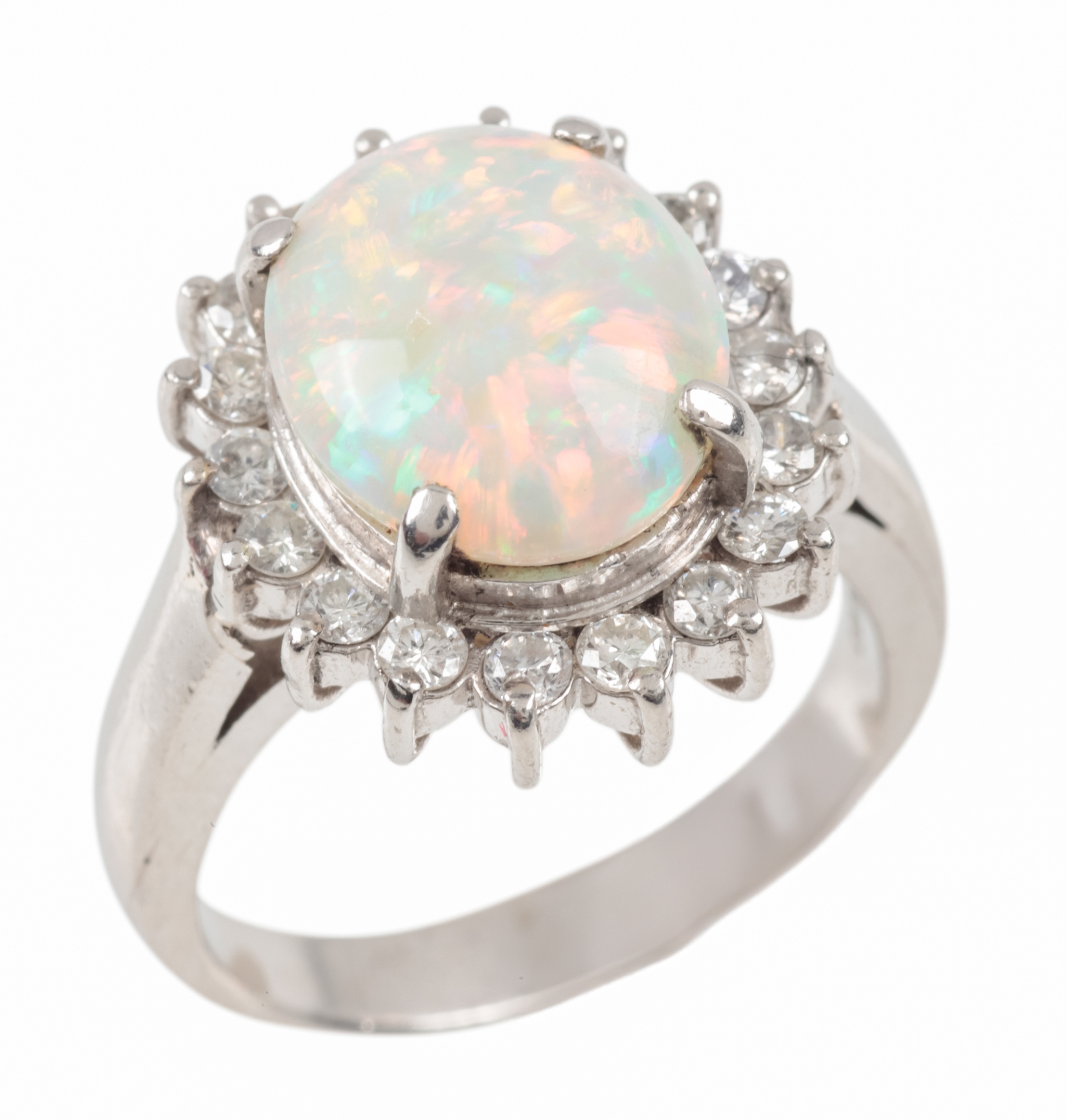 the oval cabochon opal c. 11mm x 9.6mm, surrounded by round brilliant cut diamonds, c. 0.54 carats combined, the shank stamped P900, ring size c. J, c. 9.4 grams