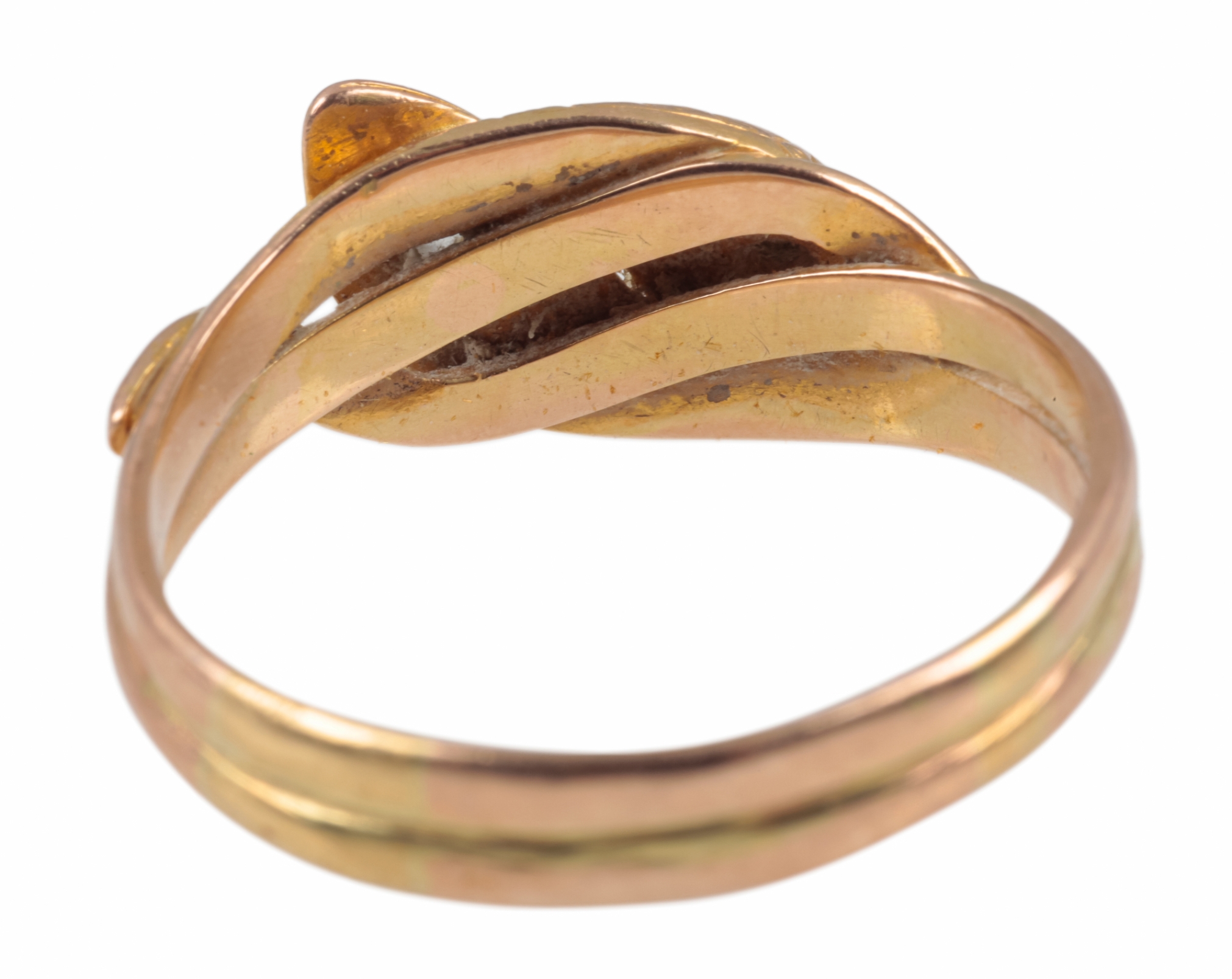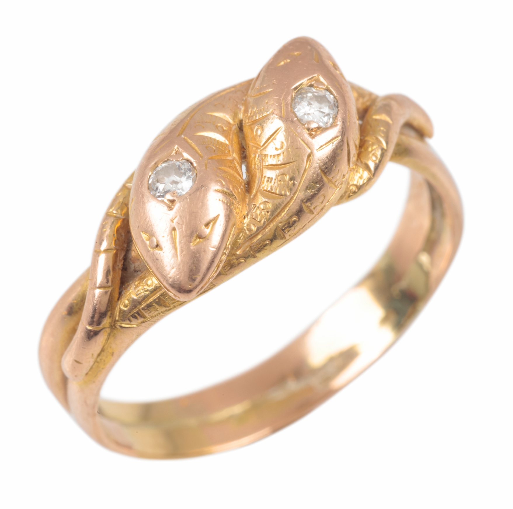 the double headed snake closed back set with two old cut diamonds, unmarked, surface testing as 14ct, ring size S, c. 4.8 grams