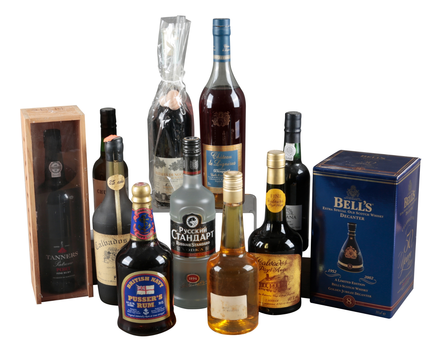 one 70cl bottle; together with Tanner’s Patrono Ruby Port, one 75cl bottle, cased; two half bottles of Churchill’s Port, Bell’s Queen Elizabeth II commemorative Scotch Whisky decanter, 70cl, boxed; and six other mixed bottles (11)