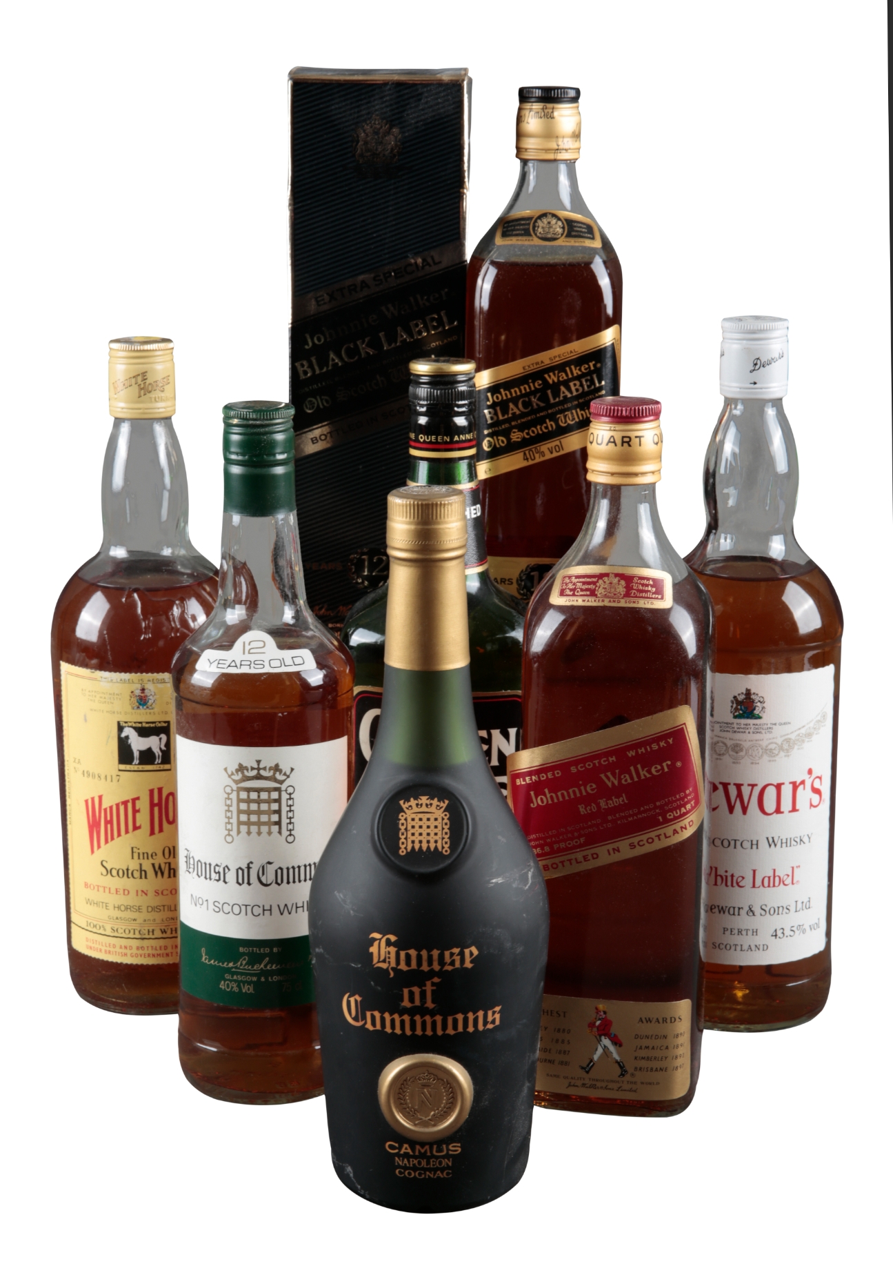 one 75cl bottle; together with a vintage bottle of Johnnie Walker Red Label whisky, 1 quart size; three other bottles of blended Scotch whisky; a bottle of ‘House of Commons’ Scotch; and a bottle of Camus ‘House of Commons’ Napoleon Cognac (7)