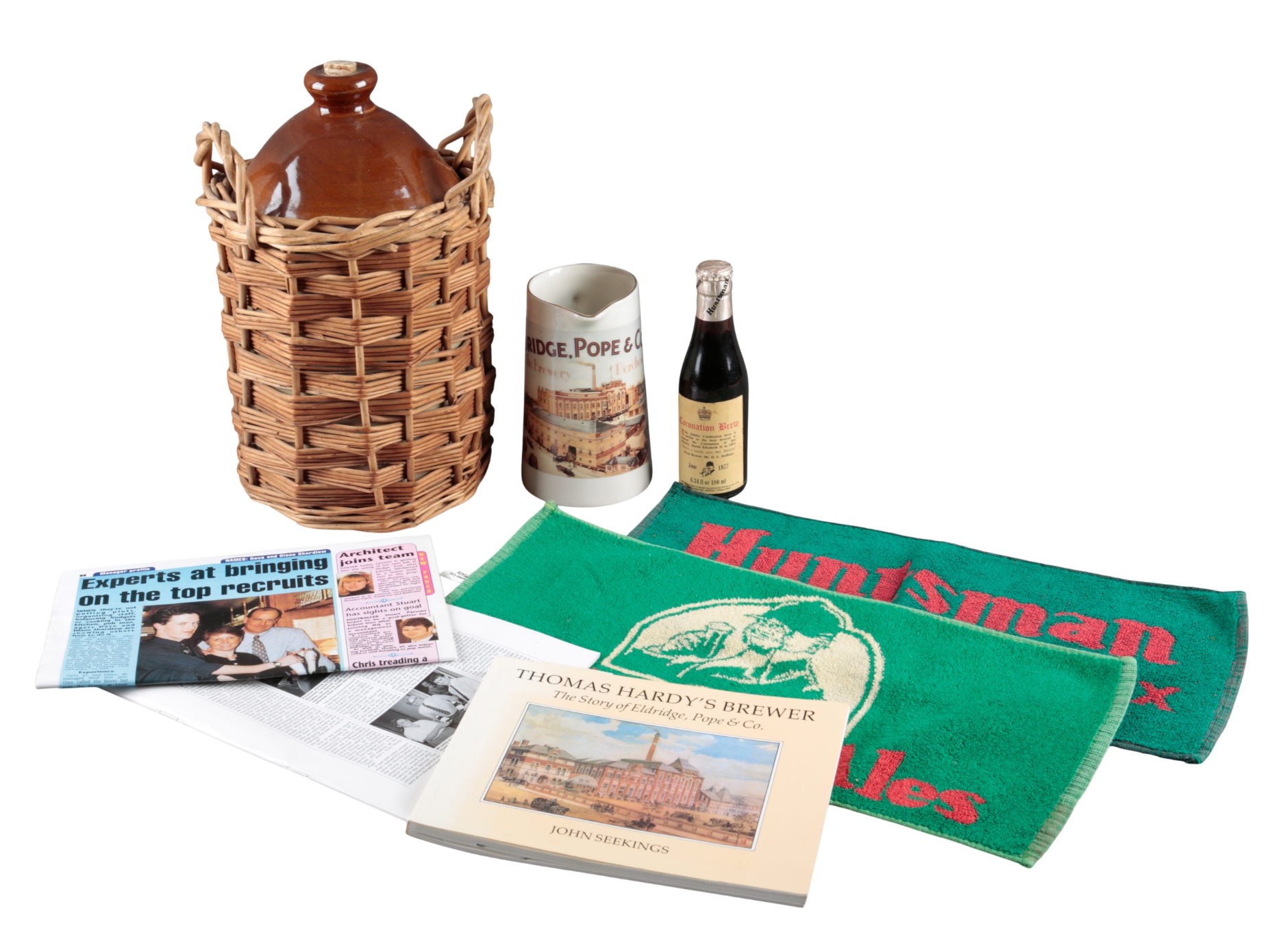 comprising stoneware flagon in wicker holder, advertising jug, 18cl bottle Coronation Brew, ‘Thomas Hardy’s Brewer’ book, two leaflets and two bar mats (8)