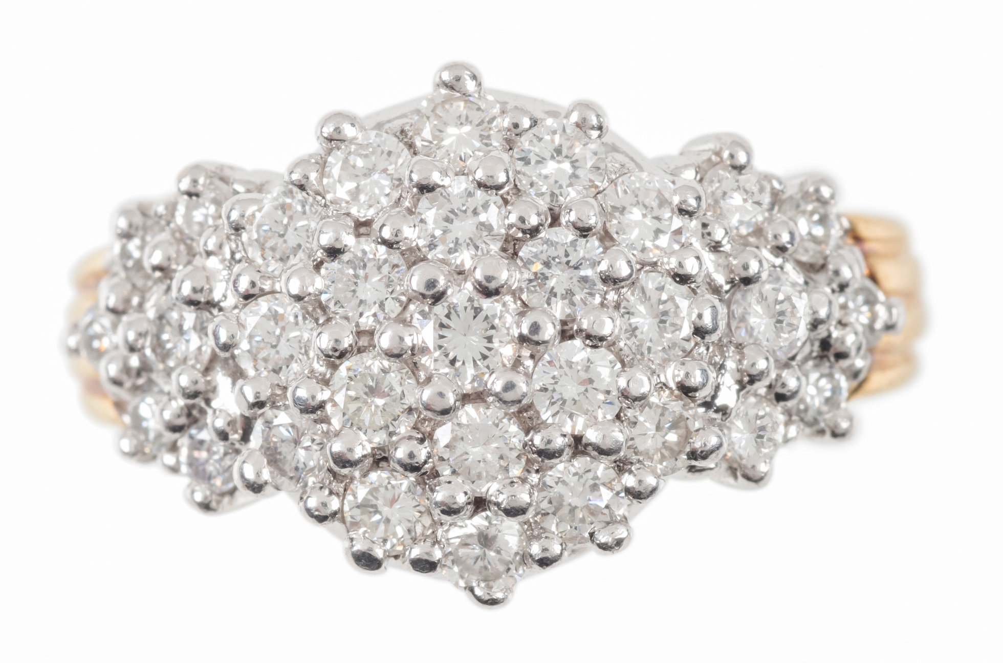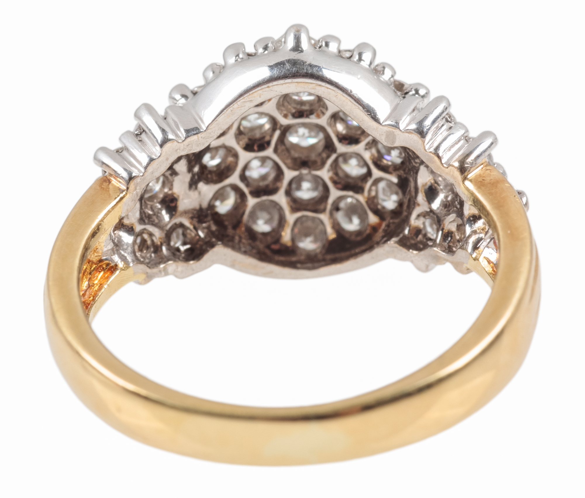 of overlapping triple circle design multi set with round brilliant cut diamond, the shank hallmarked, ring size M, c. 6.5 grams