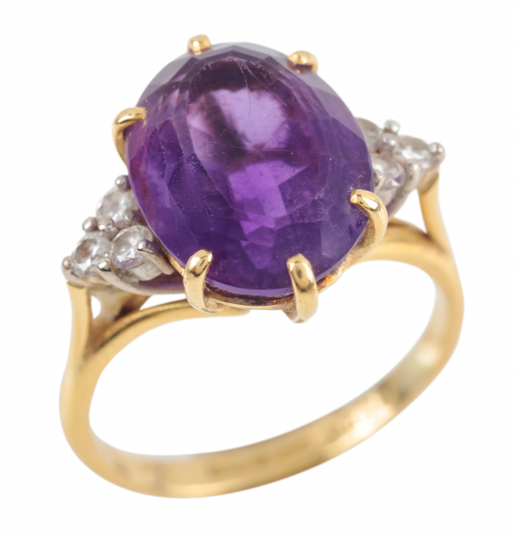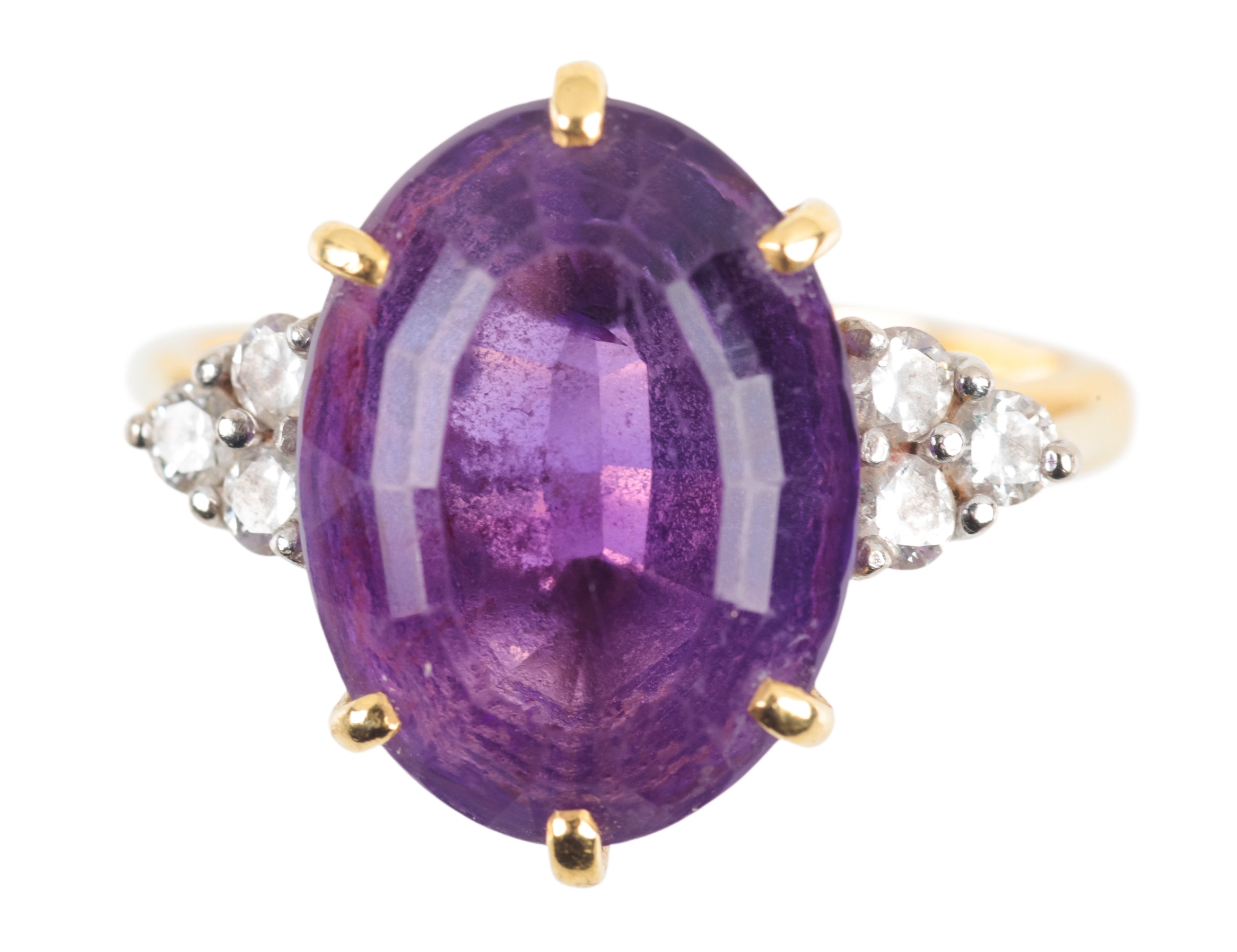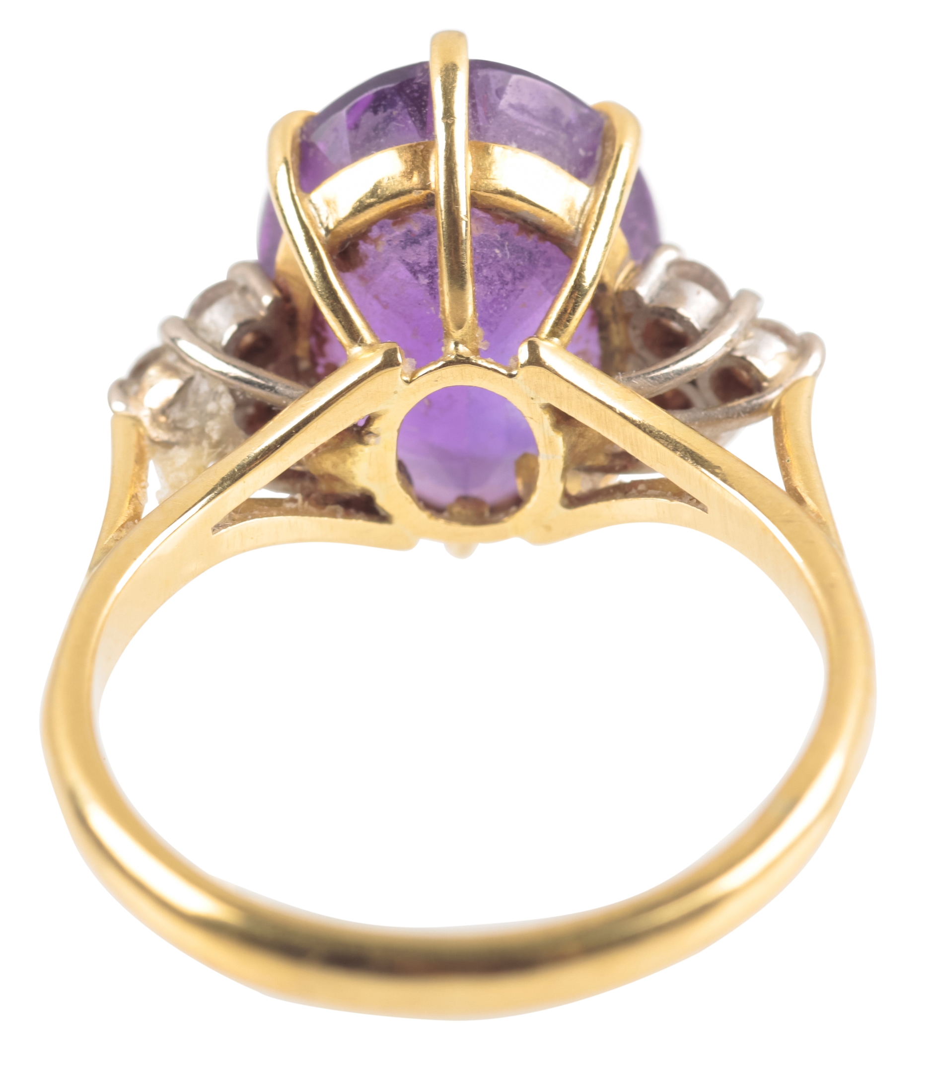 the oval-cut amethyst flanked by trefoils of brilliant-cut diamonds, to an 18ct gold shank with openwork shoulders, ring size L, c. 4.6 grams