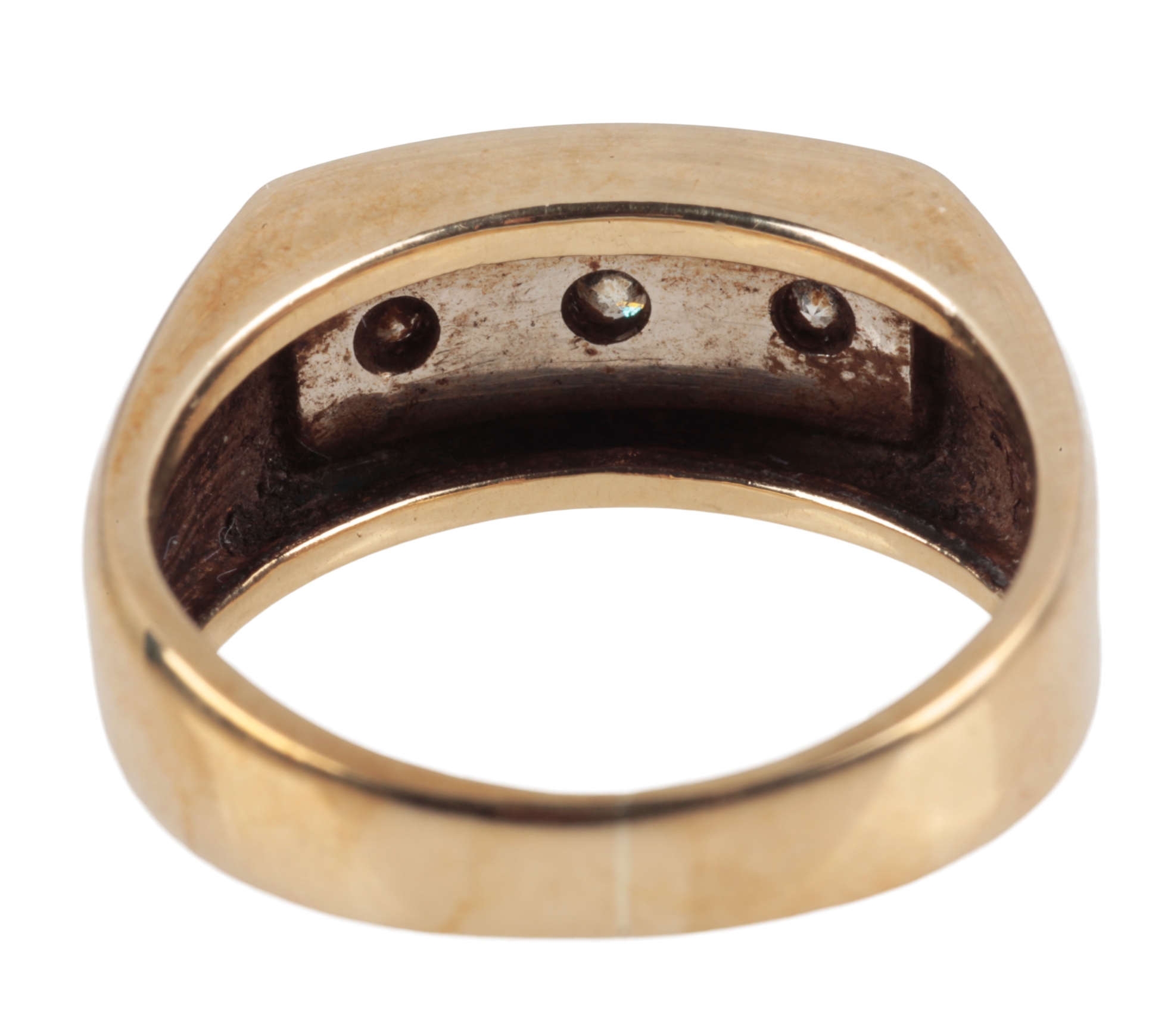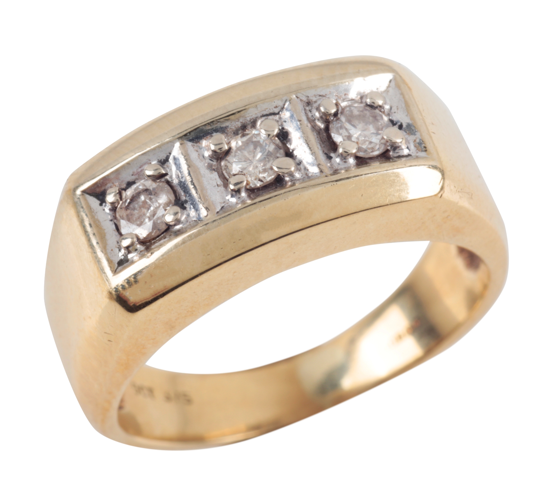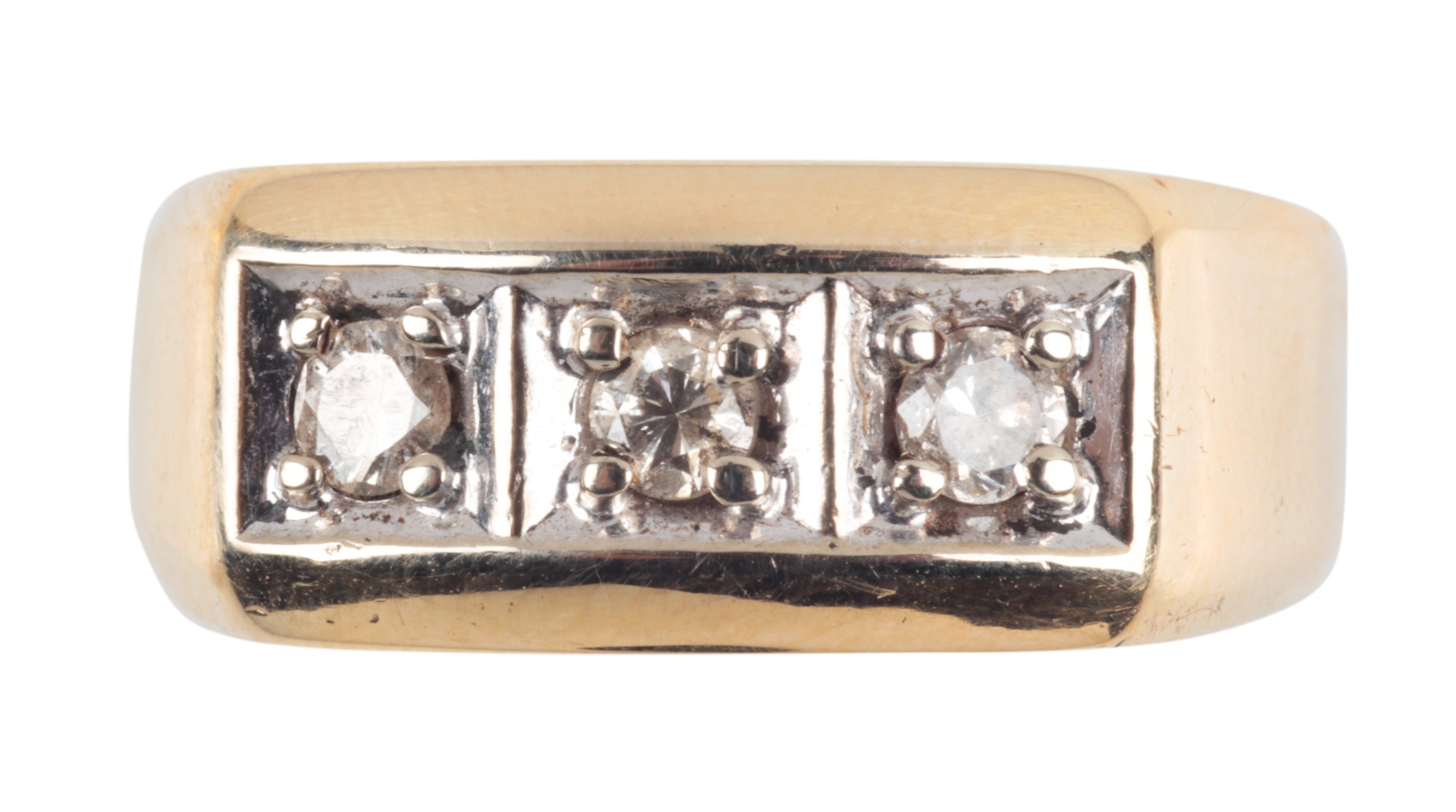 three brilliant-cut diamonds, c. 0.30 carat total diamond weight, mounted in white and yellow 9ct hallmarked gold, ring size P, c. 6.4 grams