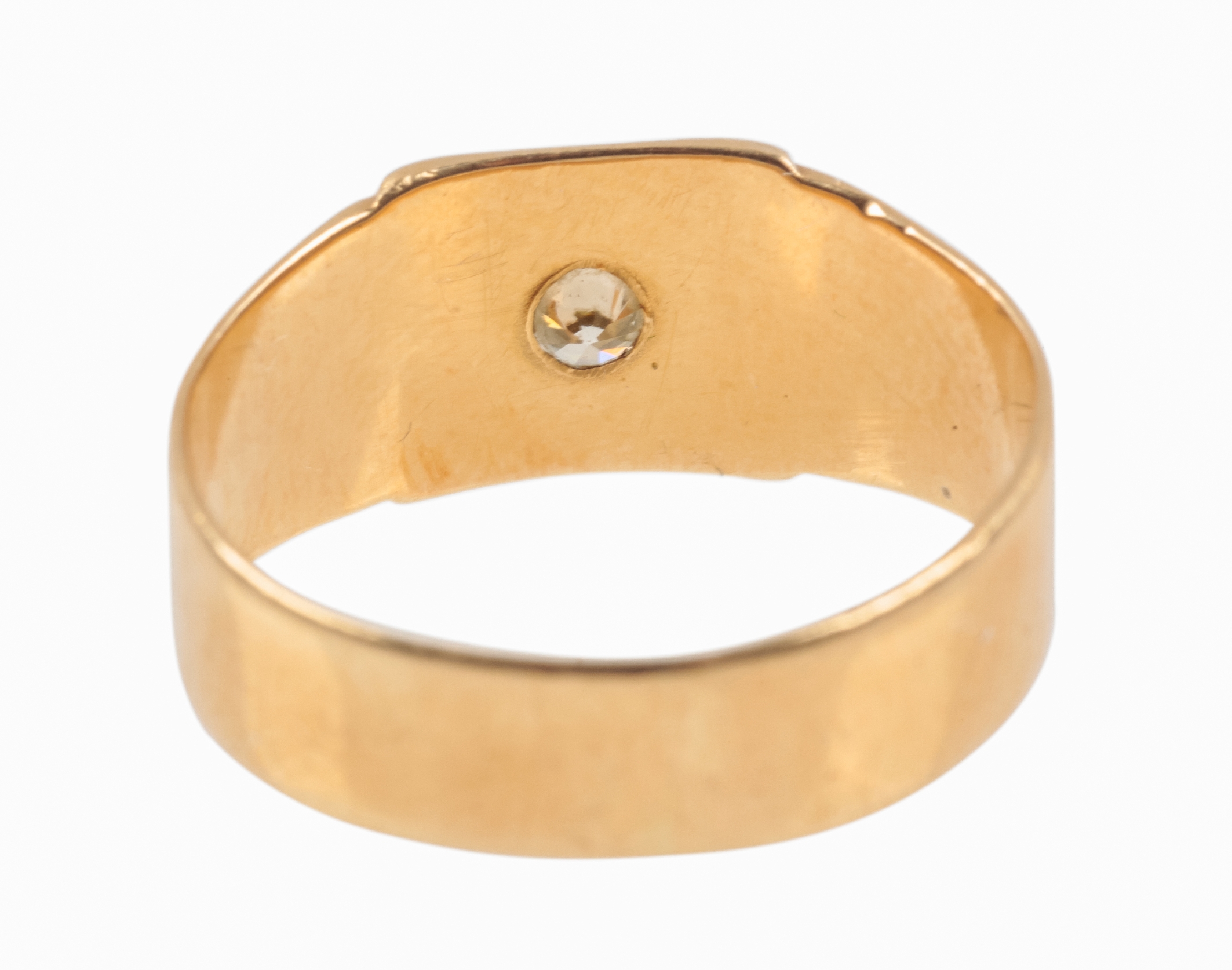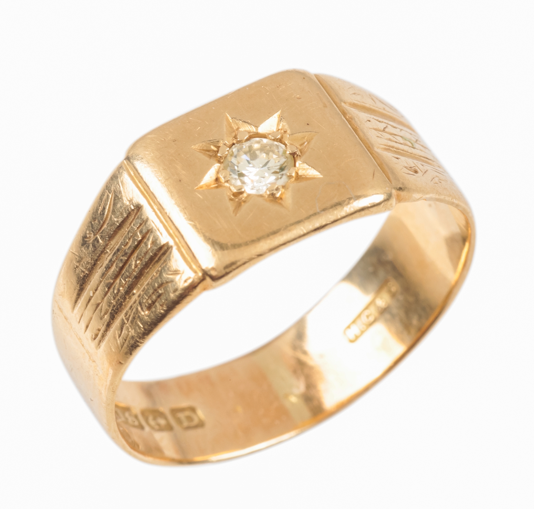 with line engraved shoulder decoration, the shank hallmarked, ring size P, c. 4.2 grams, boxed