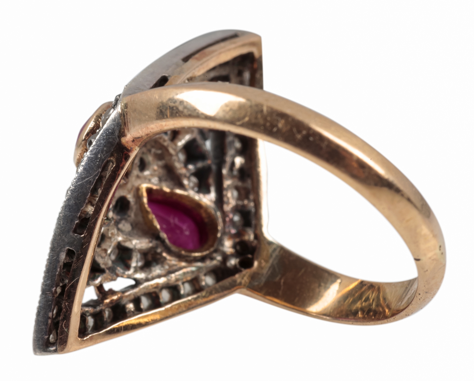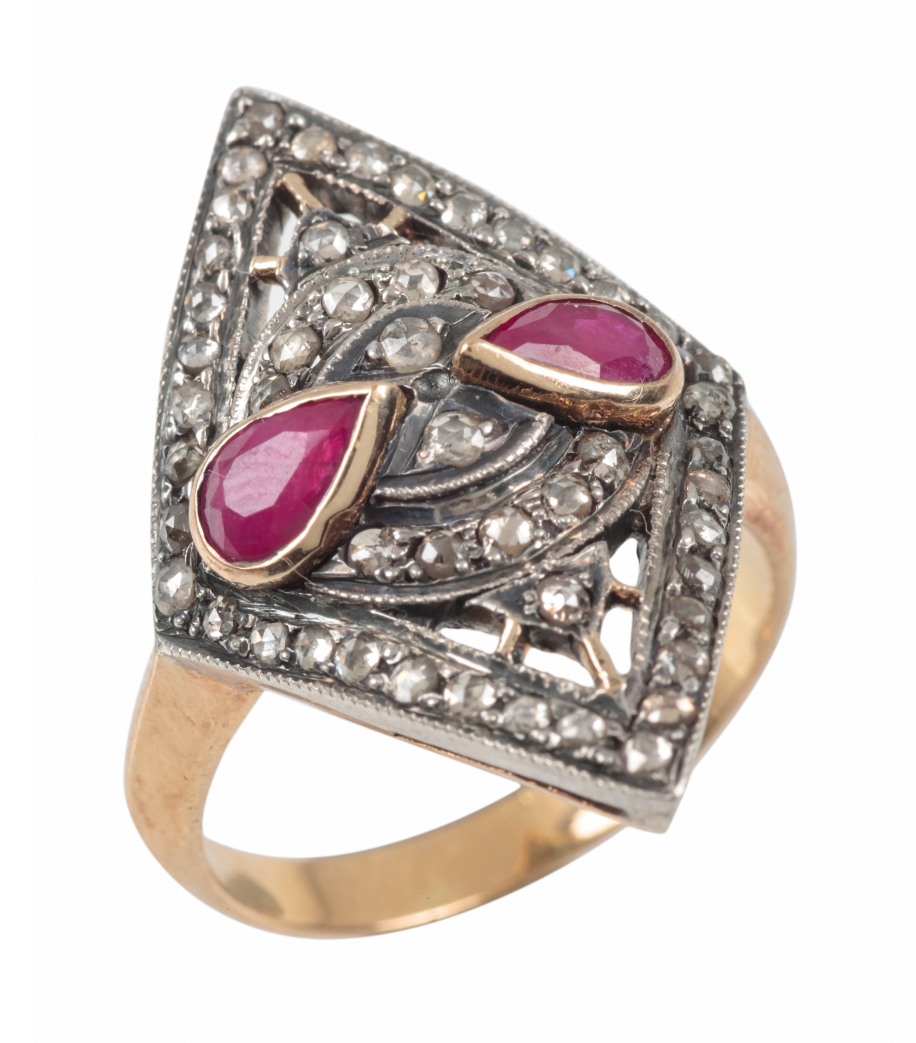 of diamond form set with two pear cut rubies and rose cut diamonds, unmarked, surface testing as 14ct, ring size O 1/2, 6.3 grams, in Rio de Janeiro ring box