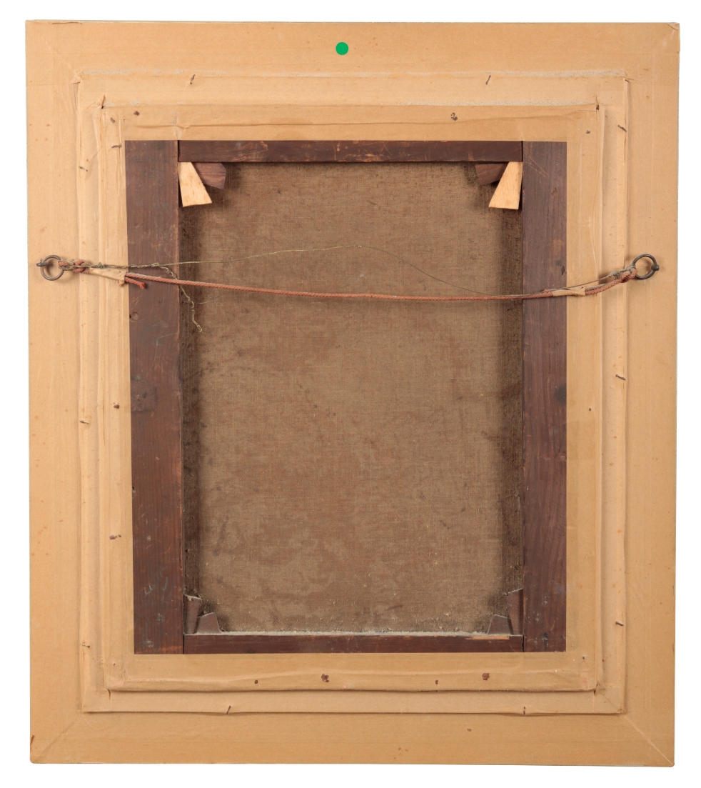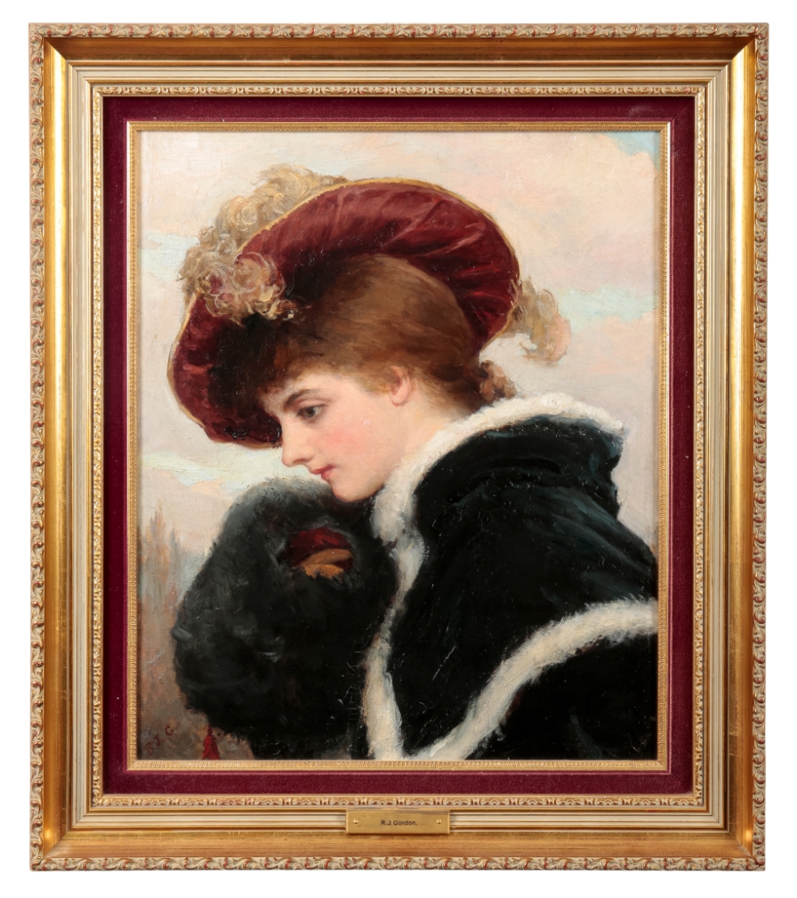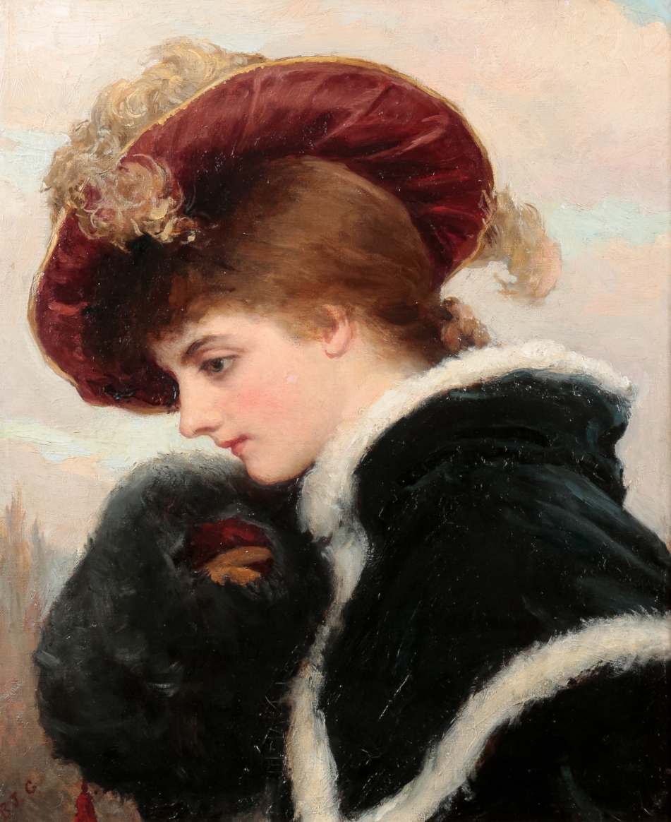 depicted in profile, wearing a brimmed hat and fur, initialled lower left, oil on canvas, 44cm x 36cm