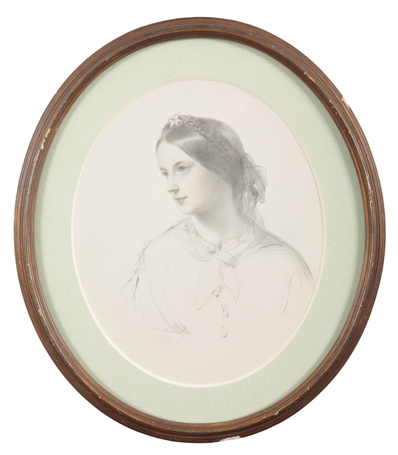1854, depicted shoulder-length, a ribbon in her hair, signed and dated lower left, pencil with watercolour and chalks on paper (an oval), 25cm x 20cm