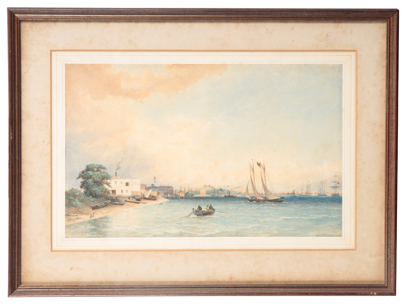 The watercolour bears some areas of wear, including foxing/time staining throughout and some fading to the colours, as well as isolated areas of spotting. However, the frame and mounting appear to bear far greater water damage than the watercolour itself. The watercolour would benefit immensely from being reframed and re-glazed. Please see additional images available on request.