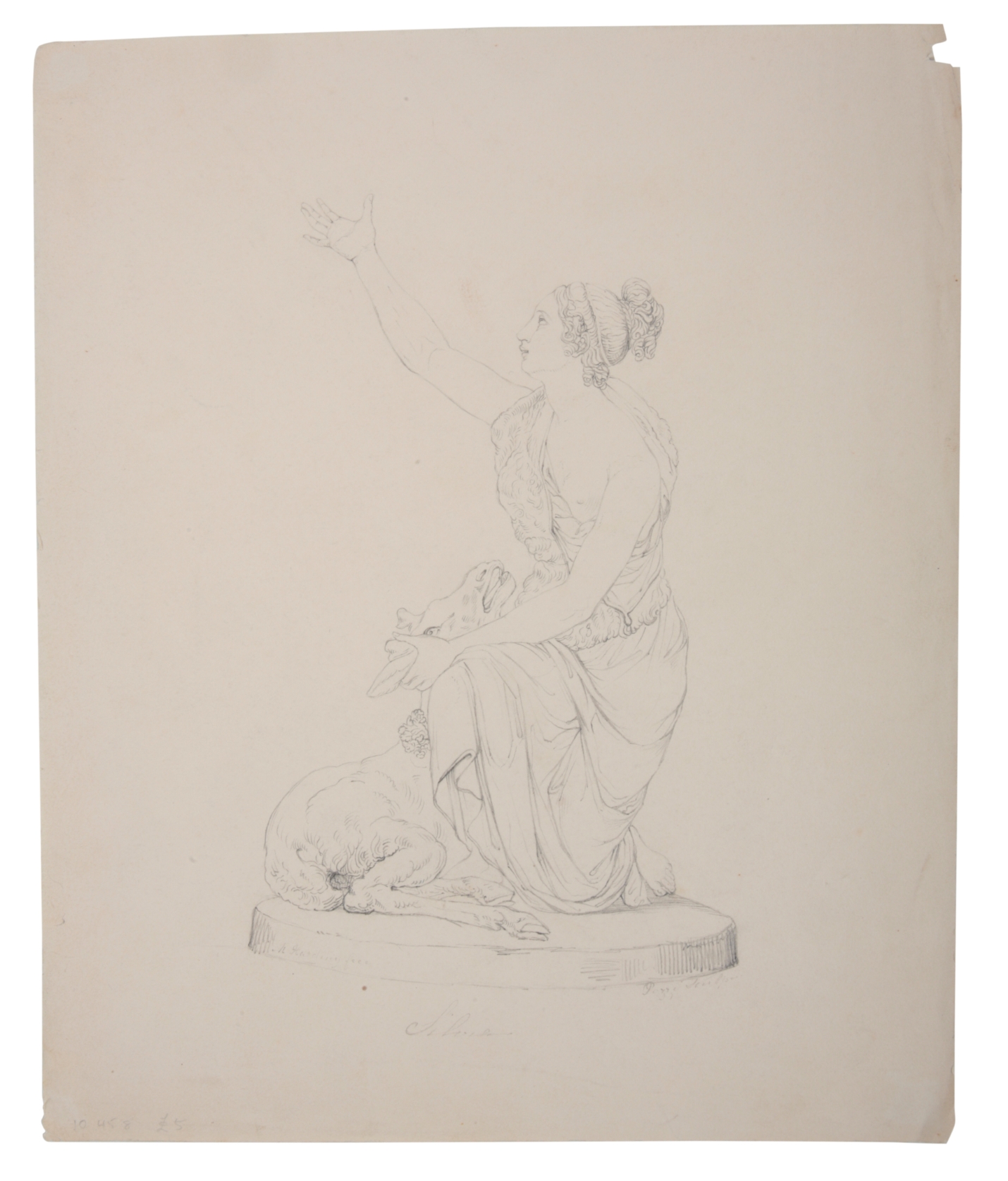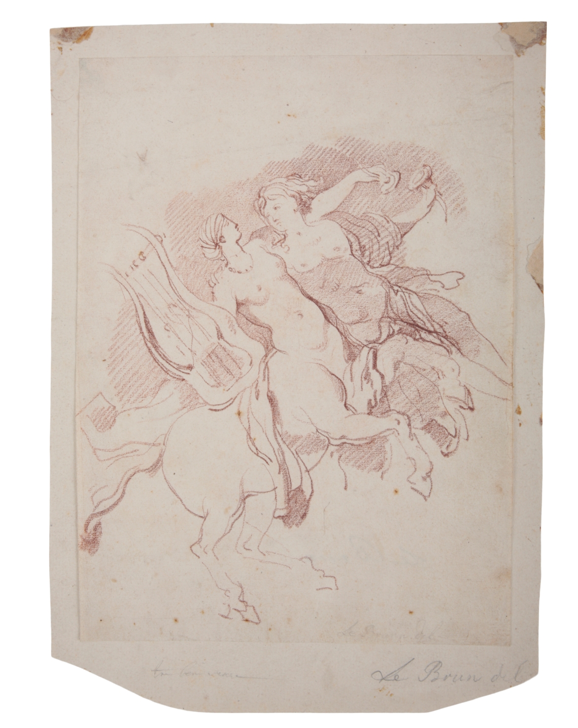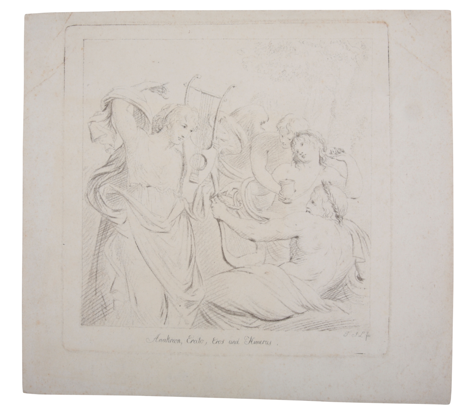 in the manner of a frieze, pen and ink on paper laid to card, diameter 38.5cm; together with two drawings and an etching depicting classical subjects (4)