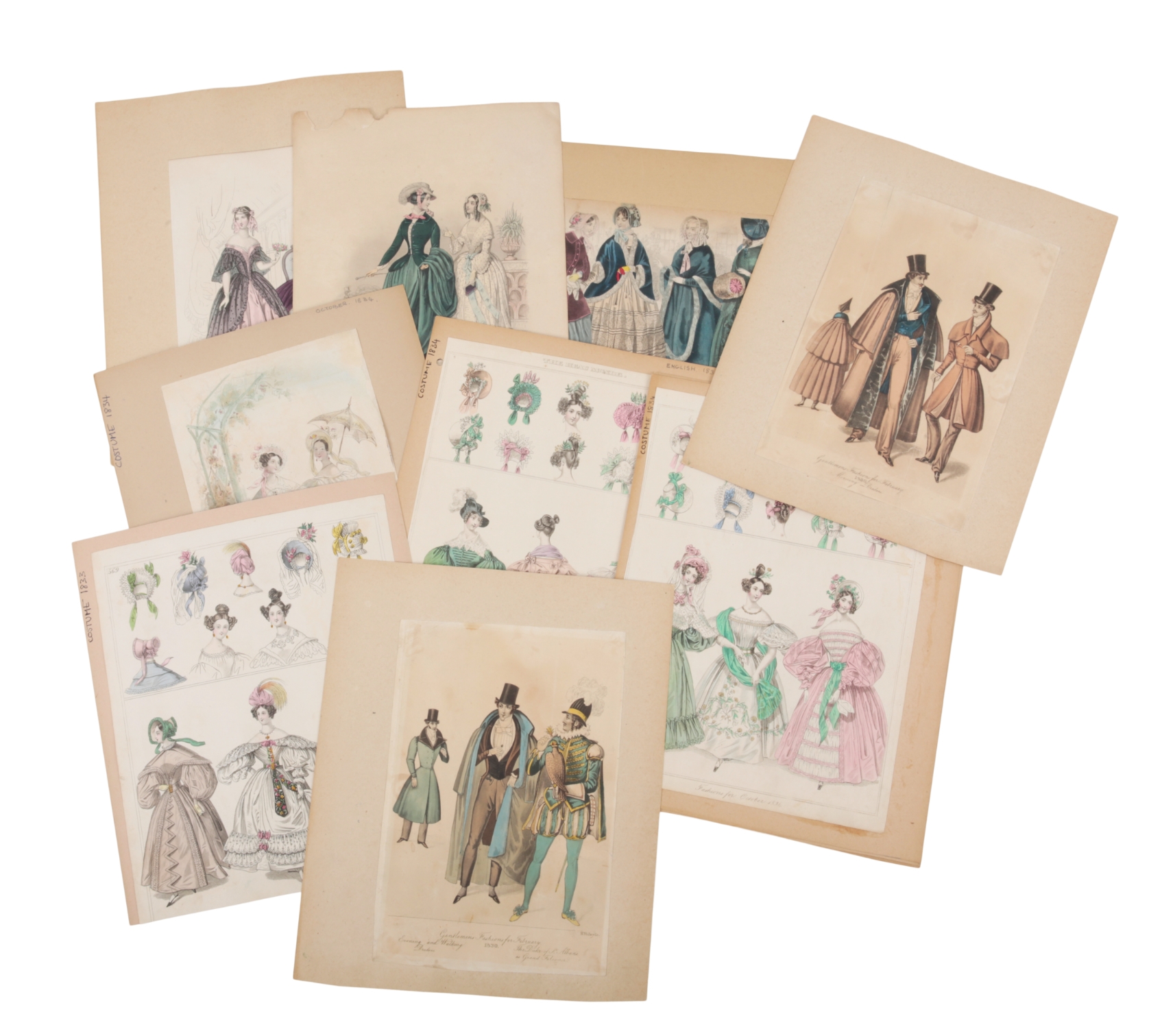 fashion plates with hand colouring, laid to card, typically 15cm x 26cm (a lot)