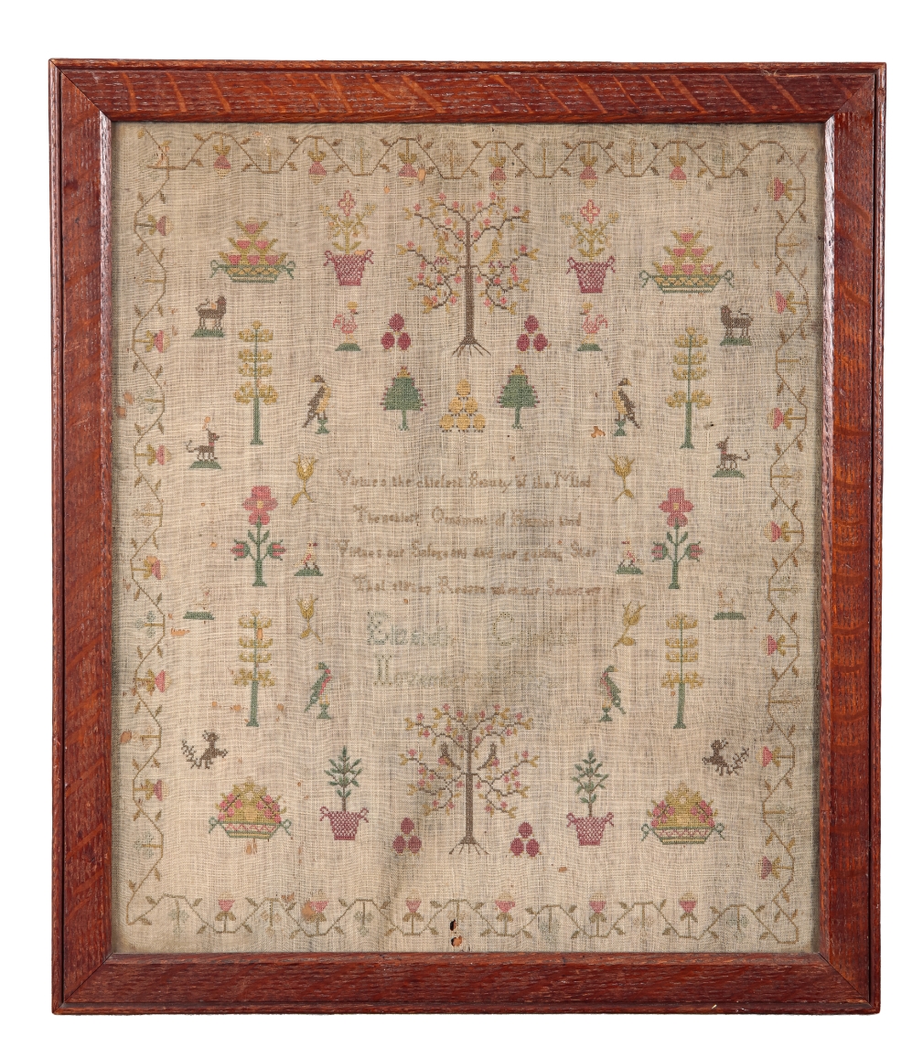 worked by 'Elizabeth Coleman, November 23, 1797', the polychrome threads with symmetrical design of scattered topiary, flowers, birds and animals, all contained within a meandering geometric border of foliage, 36cm x 31cm