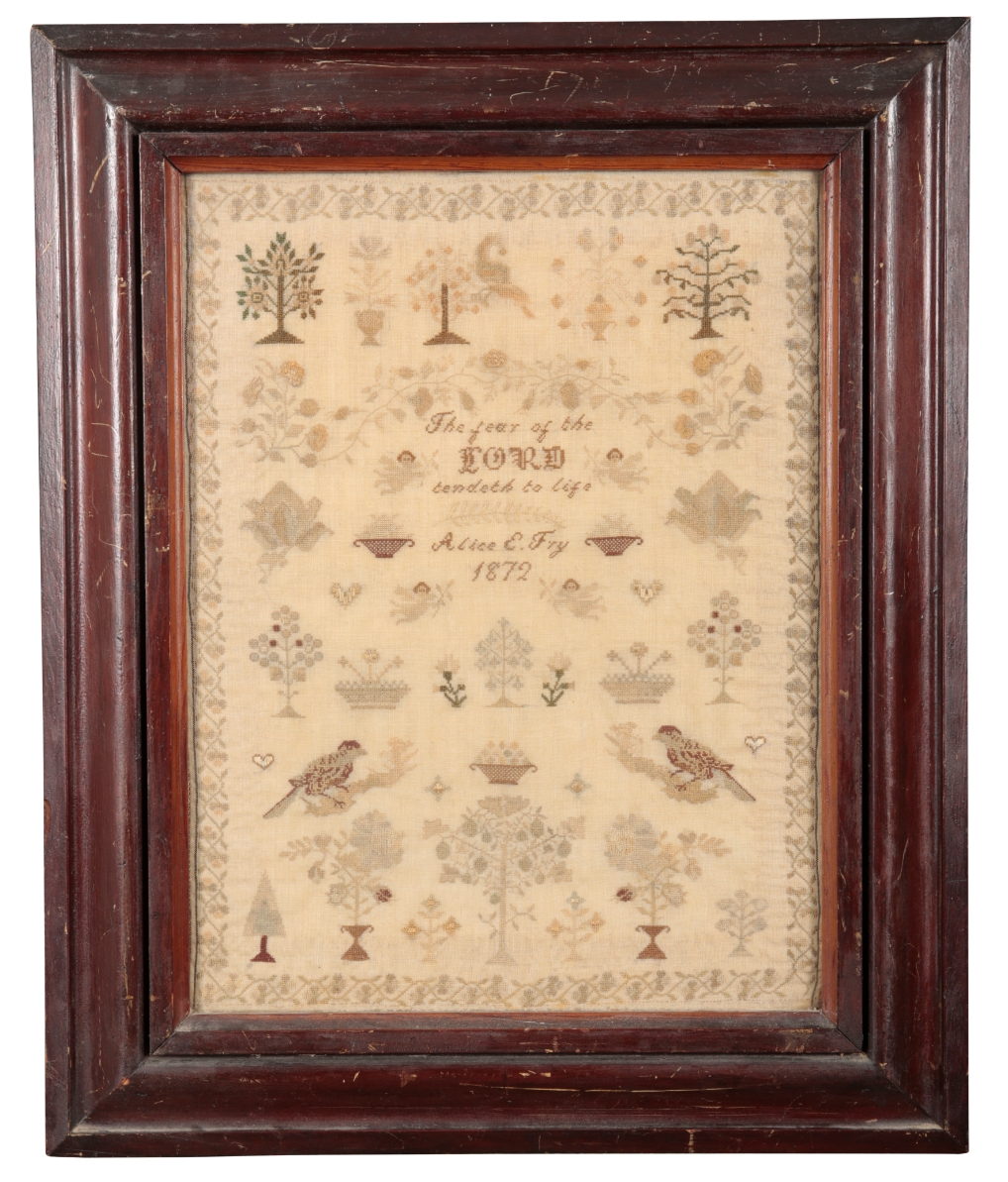 worked by 'Alice E. Fry, 1872', the pale coloured threads with scattered flowers, trees, birds and hearts, with central religious verse flanked by four angels, all contained within meandering floral and foliate border, 43cm x 33cm