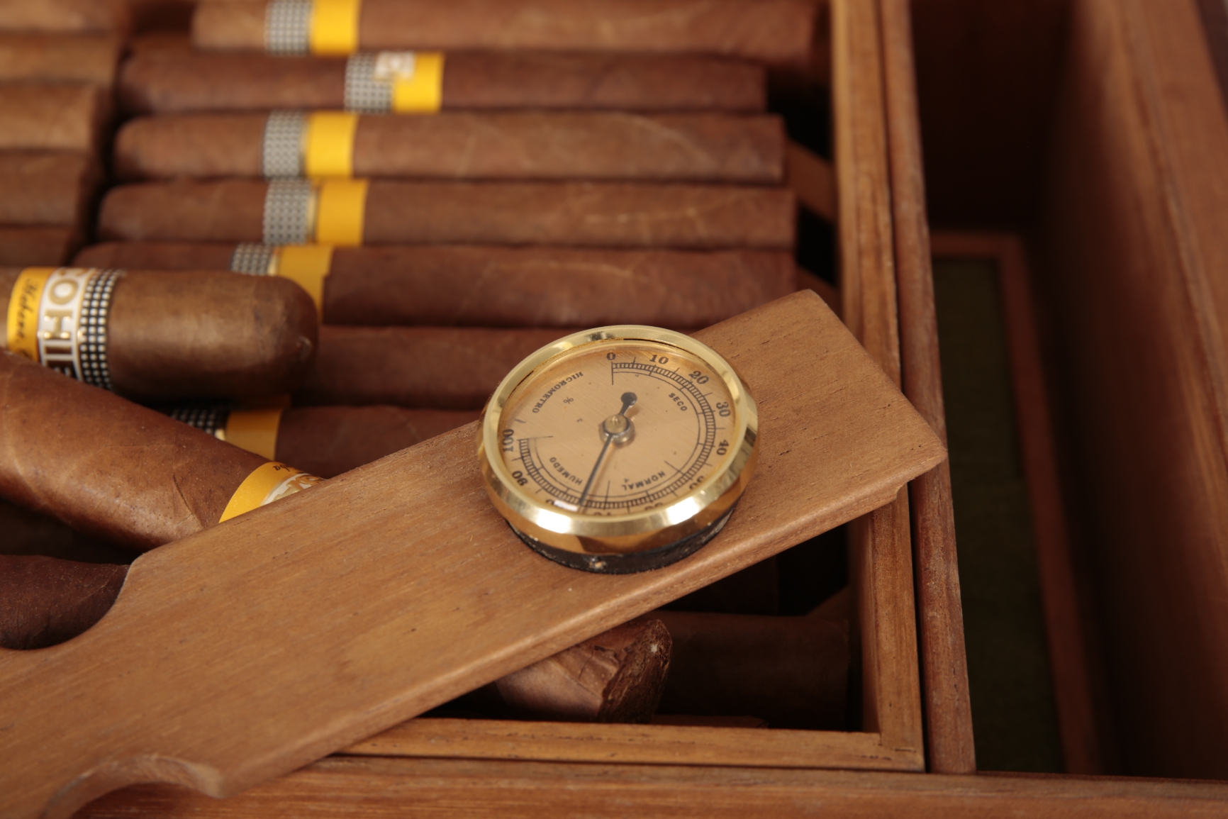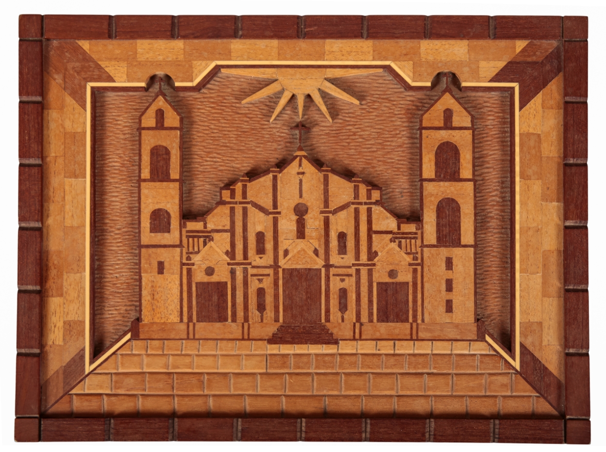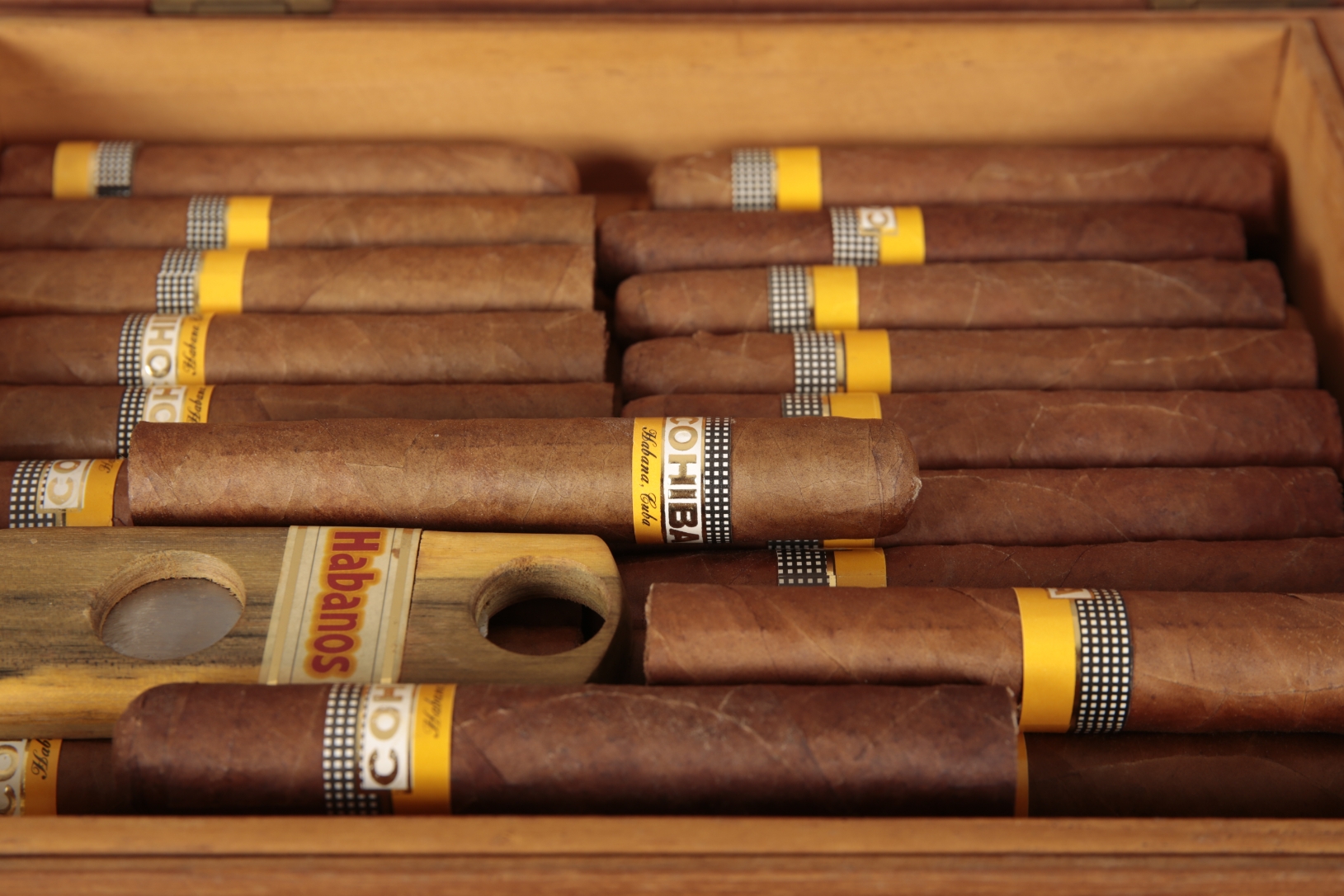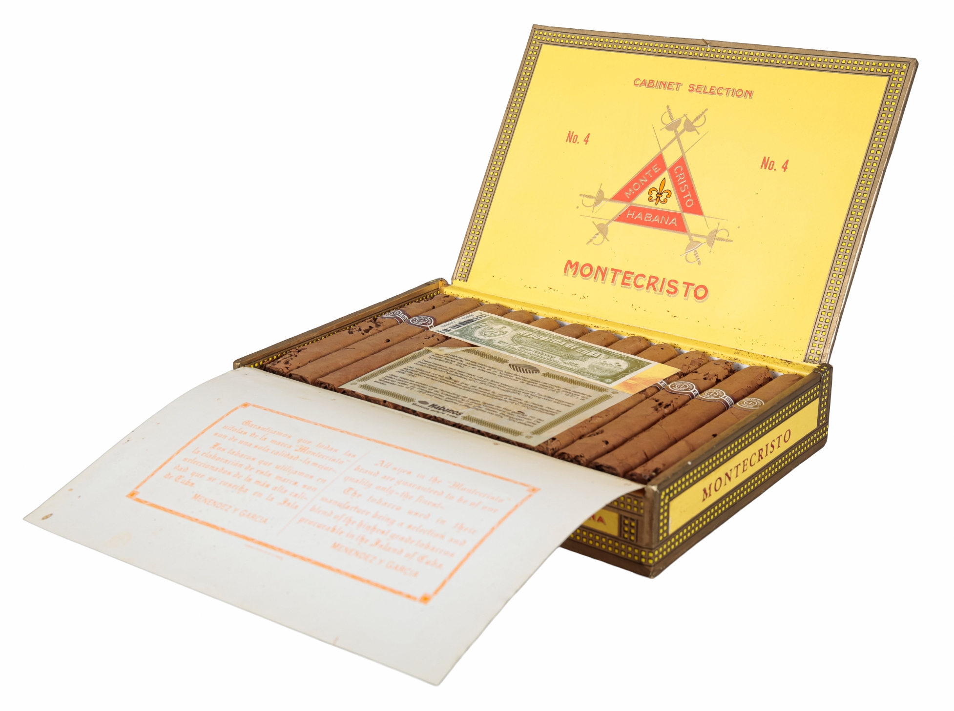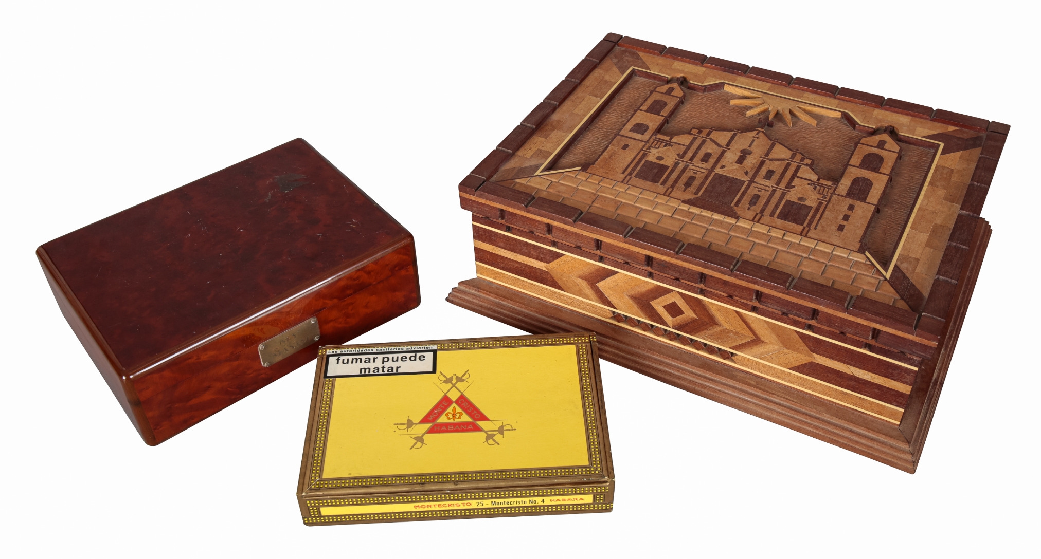 stamped to the inside of the cover, a plaque to the front inscribed 'My Maxim', containing old unlabelled cigars, 25cm wide; together with a marquetry humidor, decorated with a church or cathedral, containing multiple Cohiba cigars, 40cm wide x 31cm deep; and a box of old opened Montecristo No. 4s (3)
