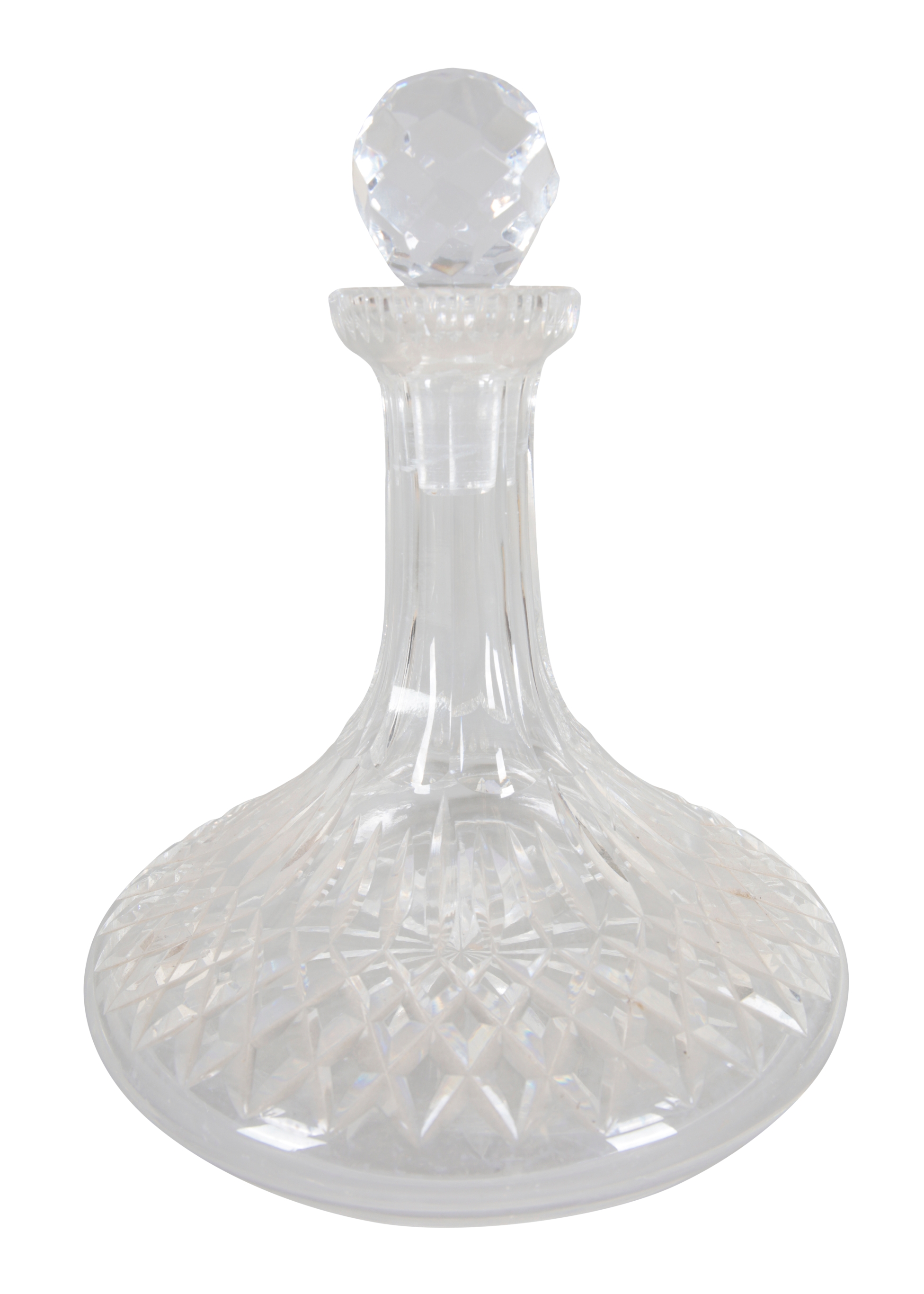 20th century, fitted with three cut glass square decanters, 32cm high x 35cm wide x 13cm deep; together with a cut glass ship's decanter, with a wide flate base, 23cm high (2)