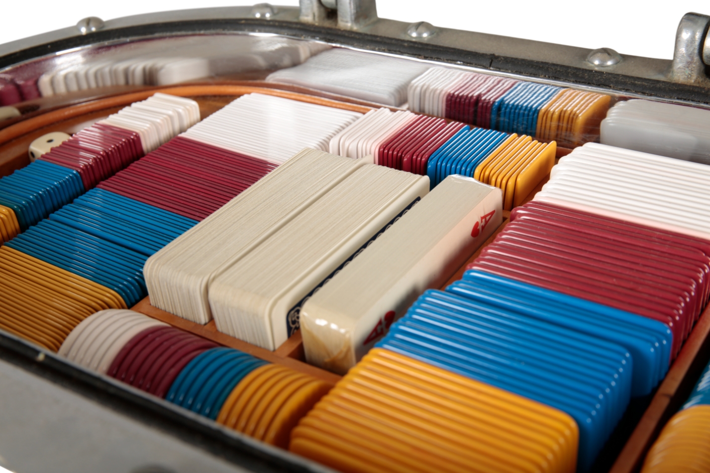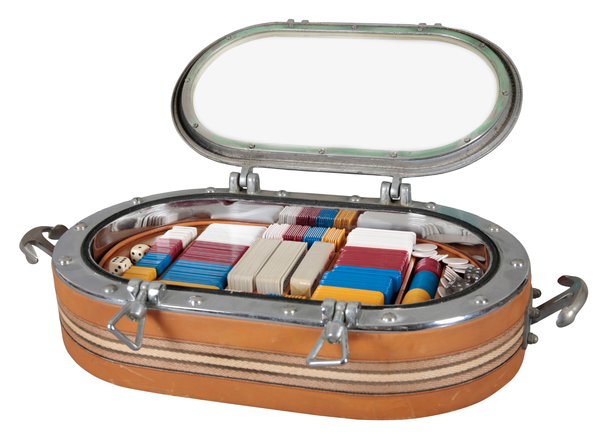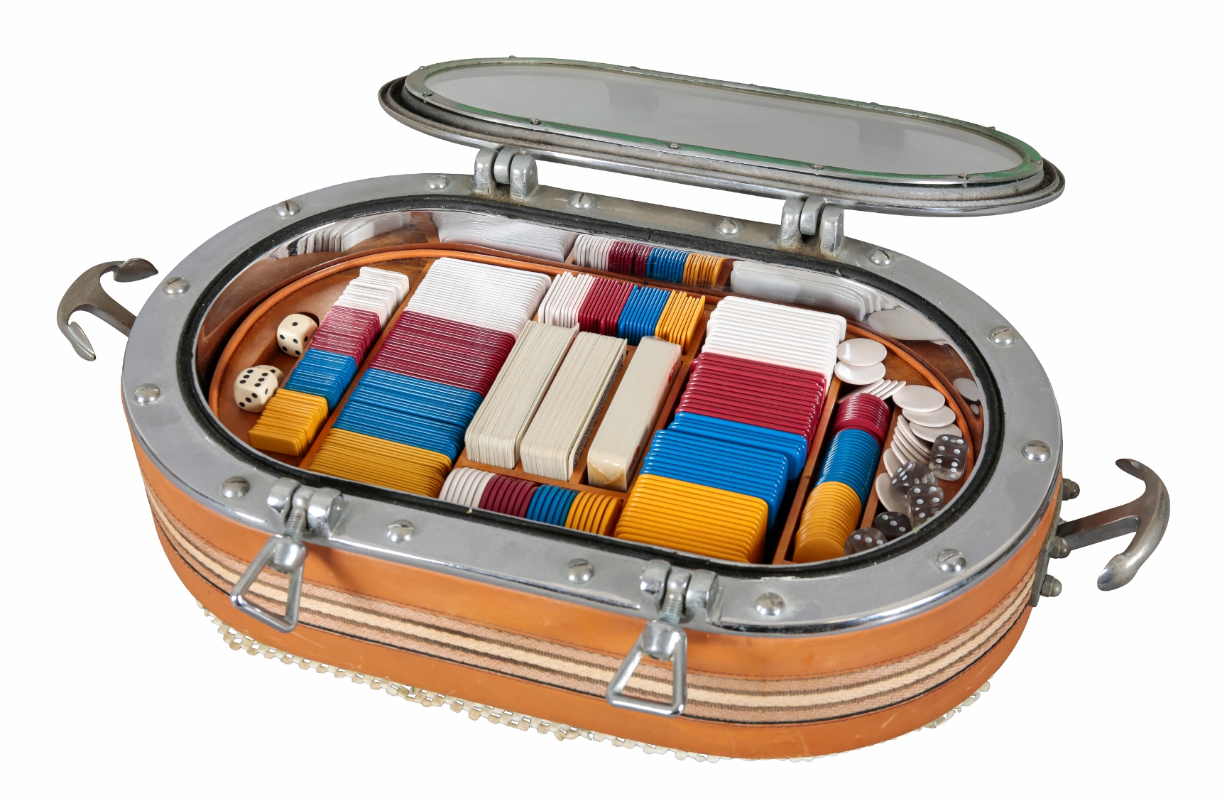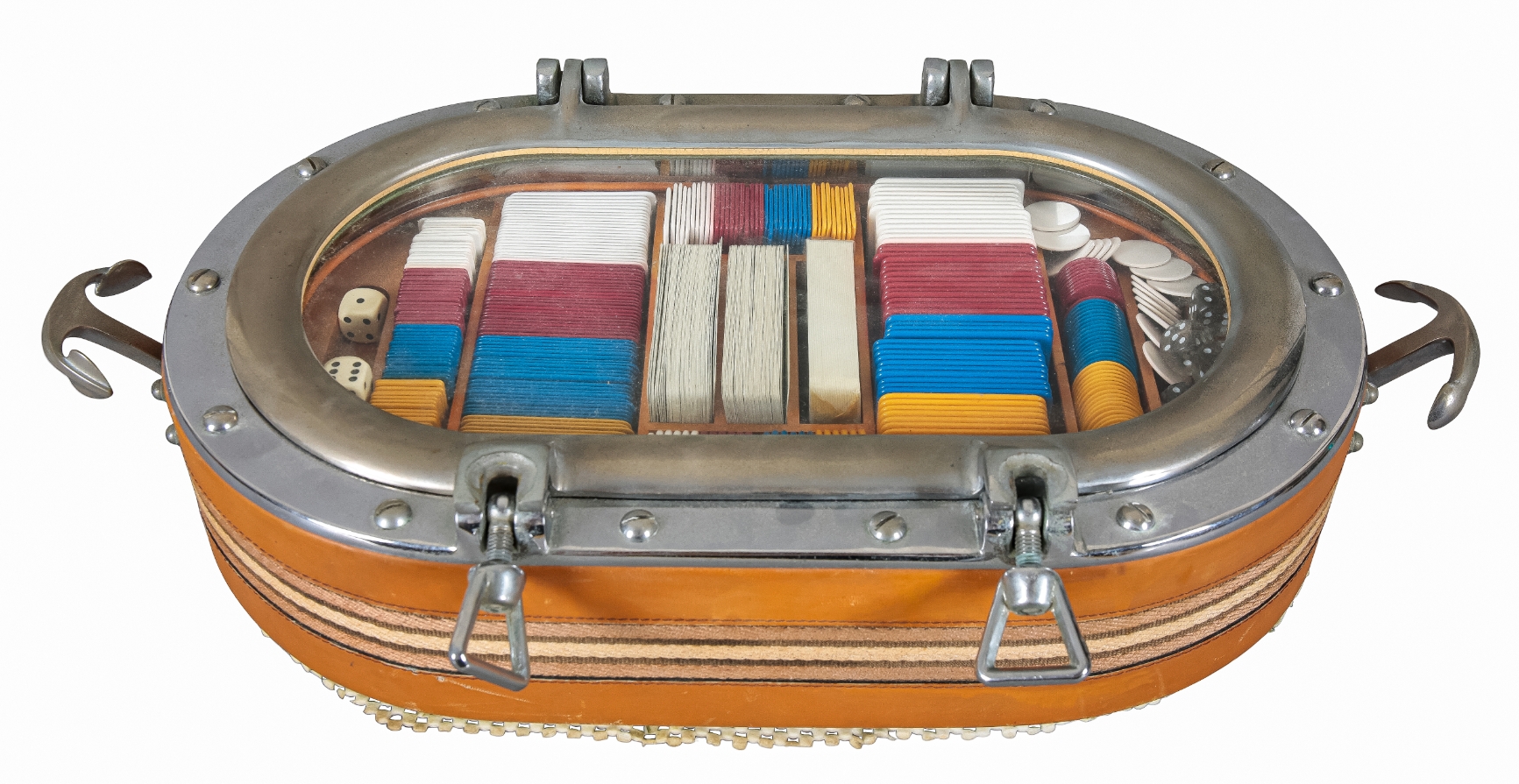 20th century, bound in leather and striped fabric, the glazed cover opening to an interior fitted with cards, chips and dice, anchor form handles to each side, 53cm wide x 27cm deep