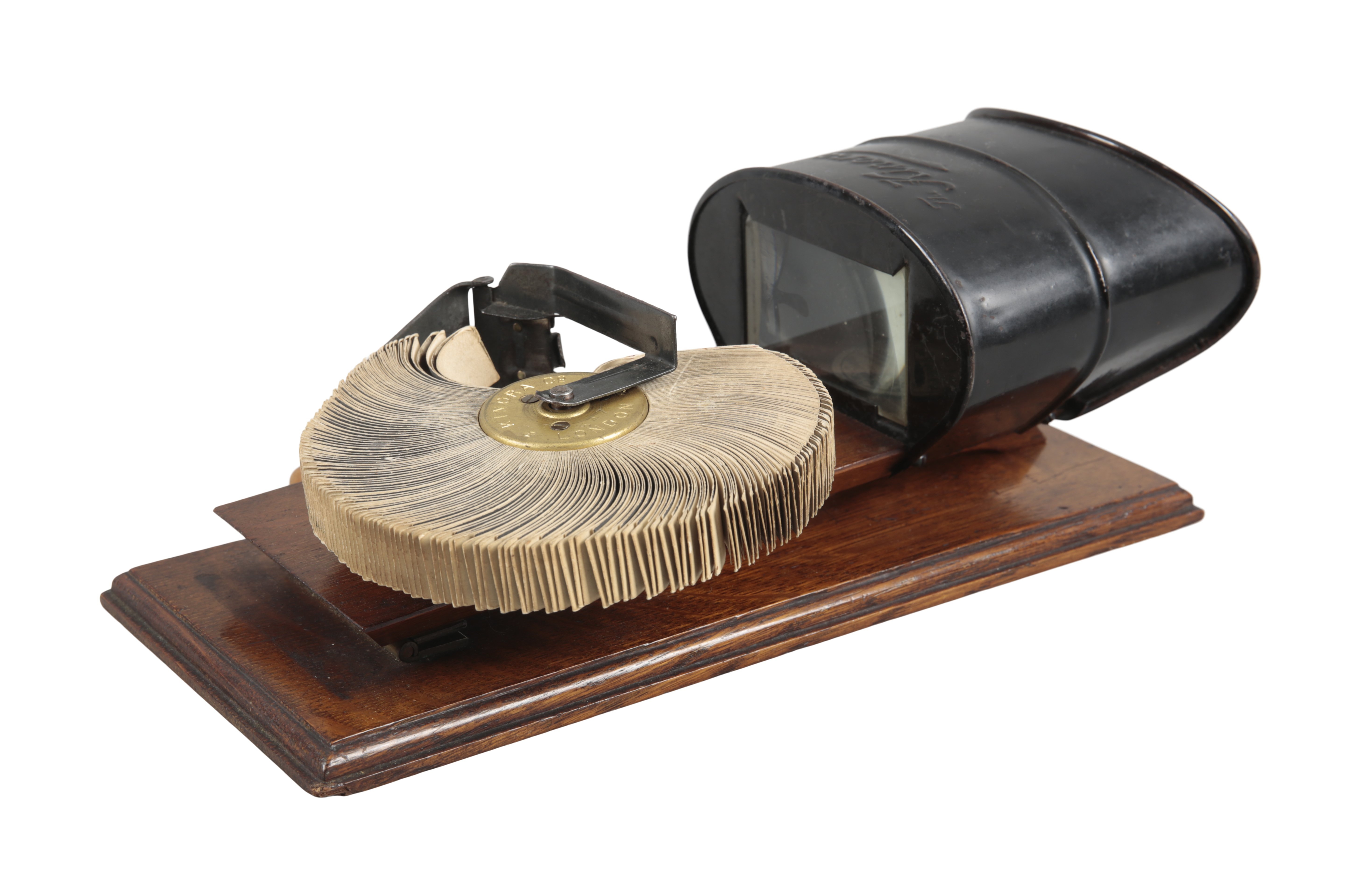 early 20th century, the steel viewer hood embossed 'Kinora' and with metal patent plaque to oak platform, 12cm high x 31cm wide x 13cm deep; together with six reels of flip card picture films (lacking card cases) stamped with ‘Kinora Co. Ltd.’ to the central metal cores, numbered 435 (magician swallowing sword), 526 (launch of a boat), 547 (elephants in water), 4396 (gardener with hose), 4413 (World War I soldiers marching to war), 4419 (by-plane taking off and landing), each reel 12.5cm diameter (7)