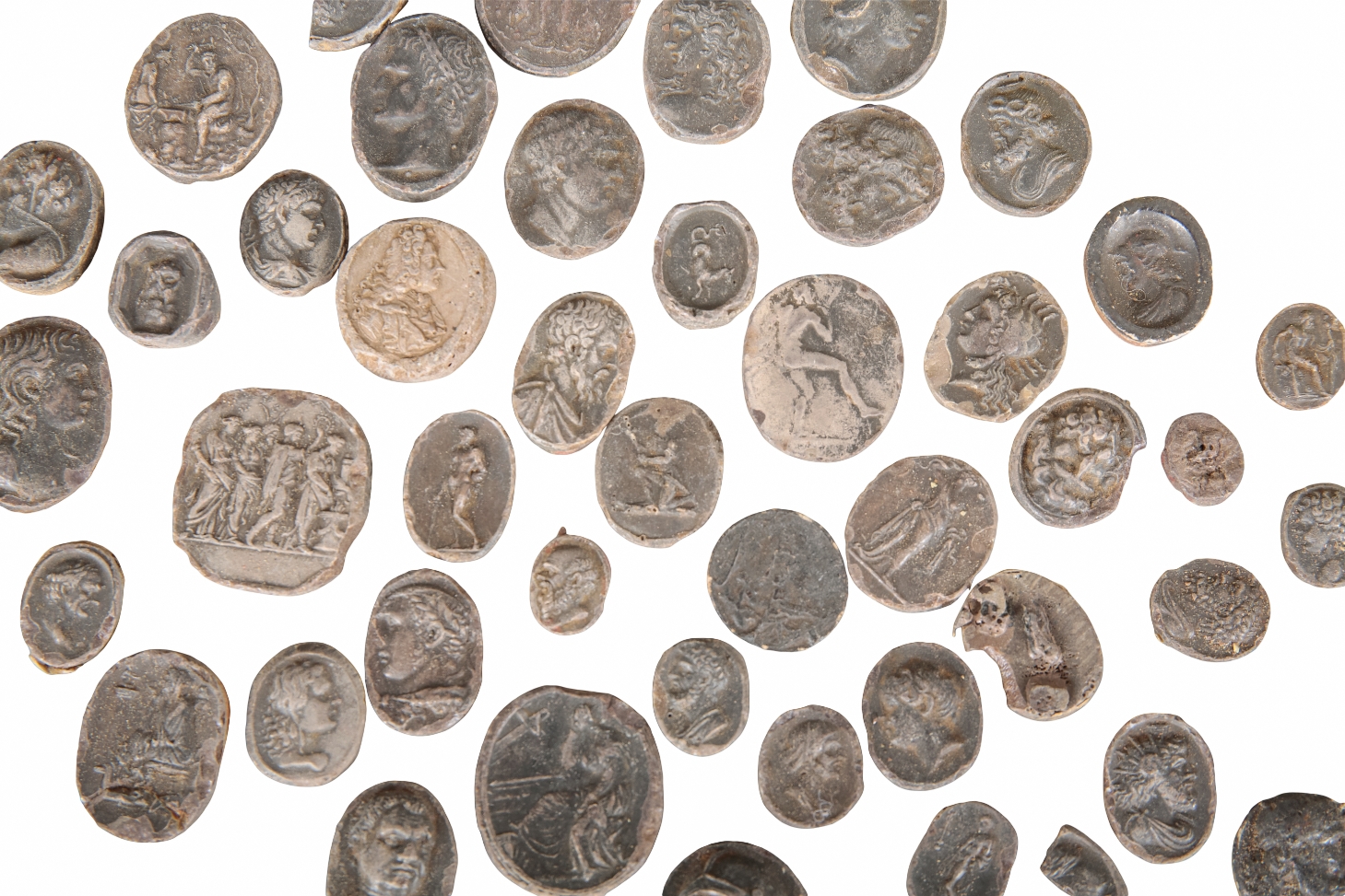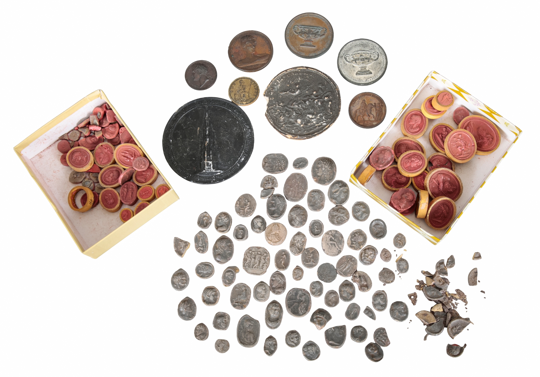 19th century and later, including a large group of plaster cameos depicting neoclassical scenes or profile studies, a large group of red wax cameos, again including portrait busts and classical figures, further wax cameos; together with a small collection of metal medallions (a lot)
