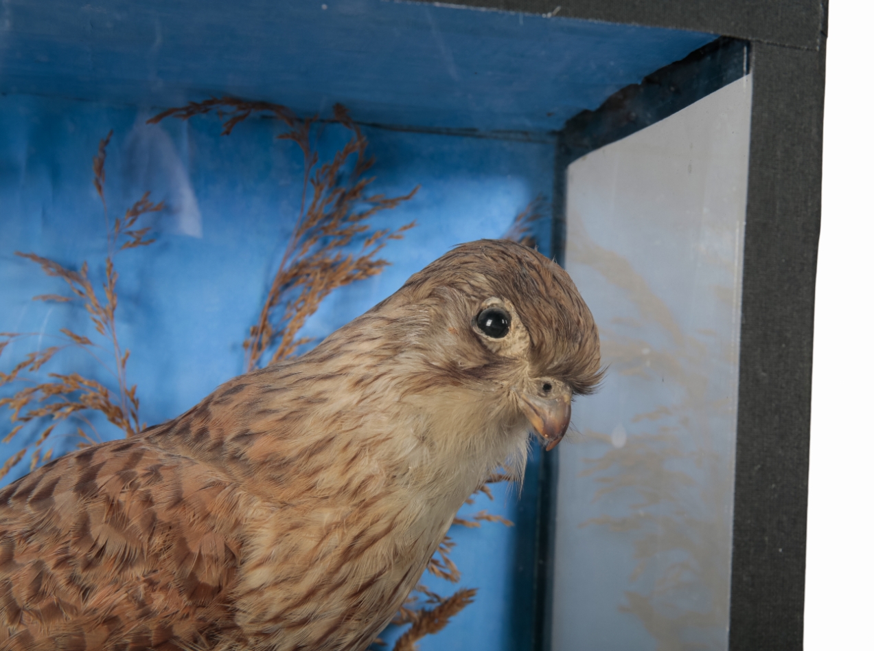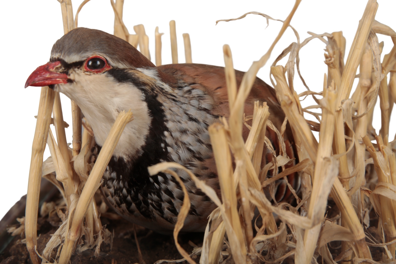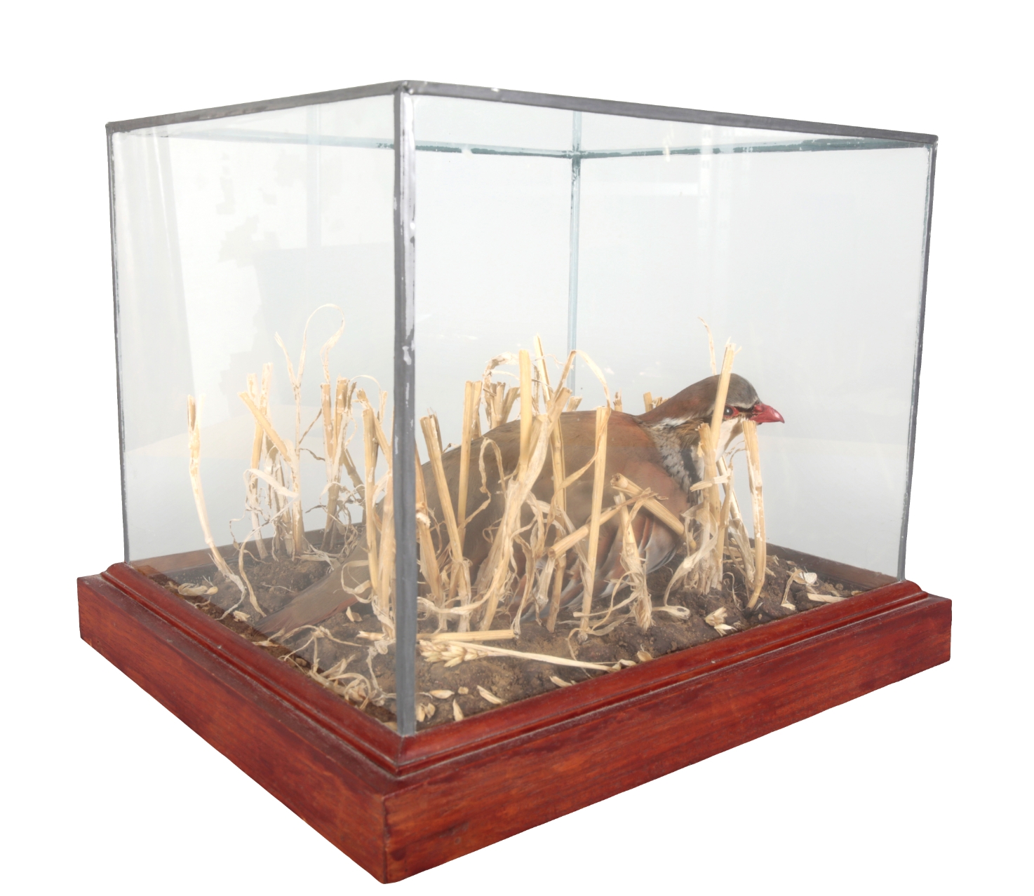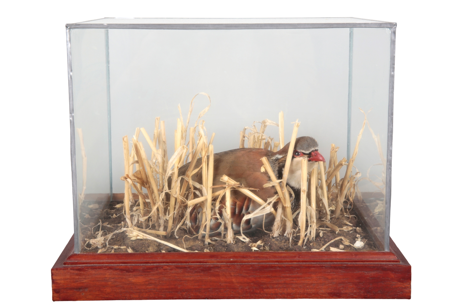 in an oak case, set in a naturalistic setting, 34cm x 32cm; together with a taxidermy weasel and hawk in a glaze-fronted case, set in a naturalistic setting, 50cm x 36cm; and a red legged partridge in a glazed square display case, set in a naturalistic setting, 25cm x 32cm (3)