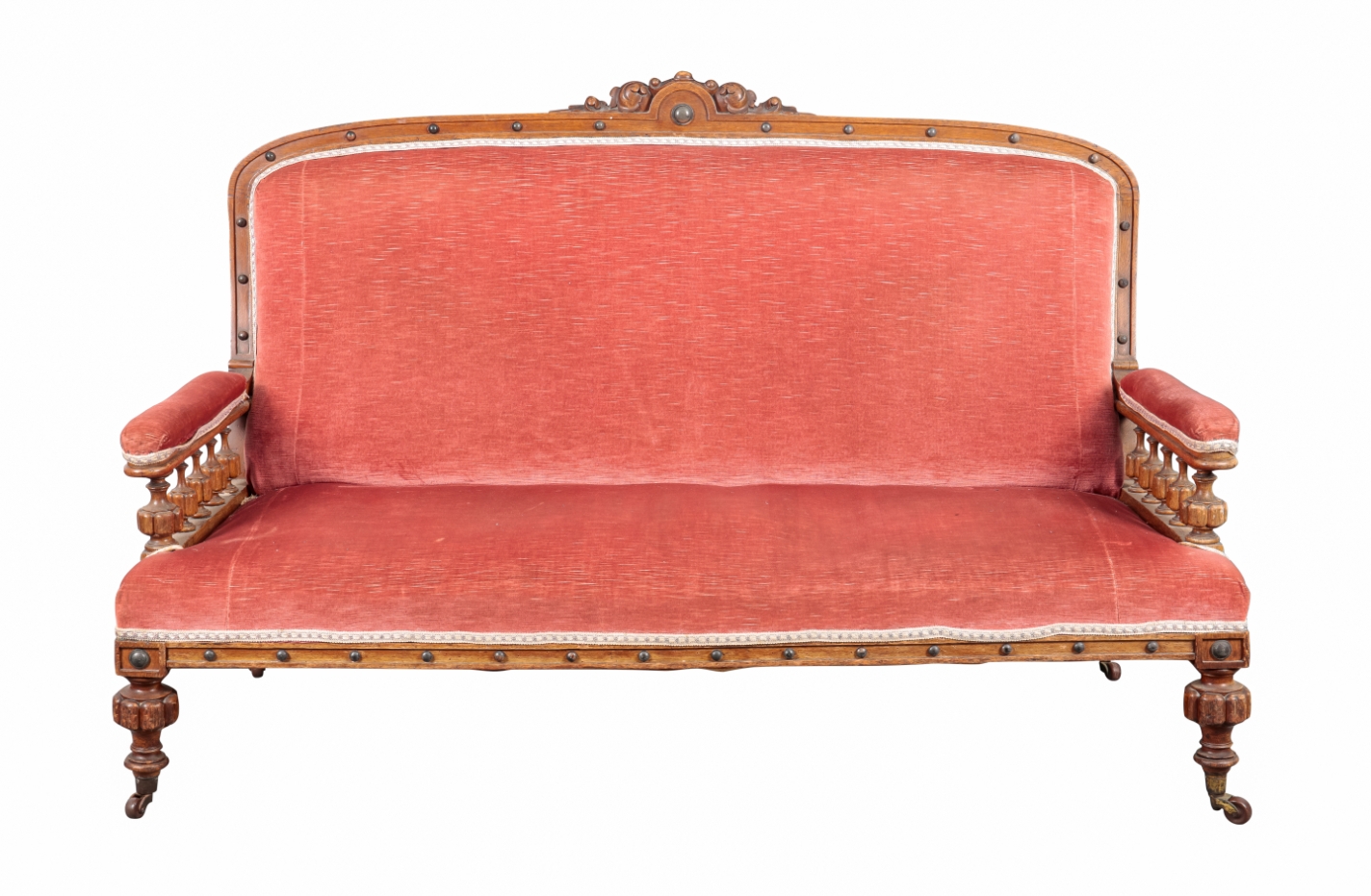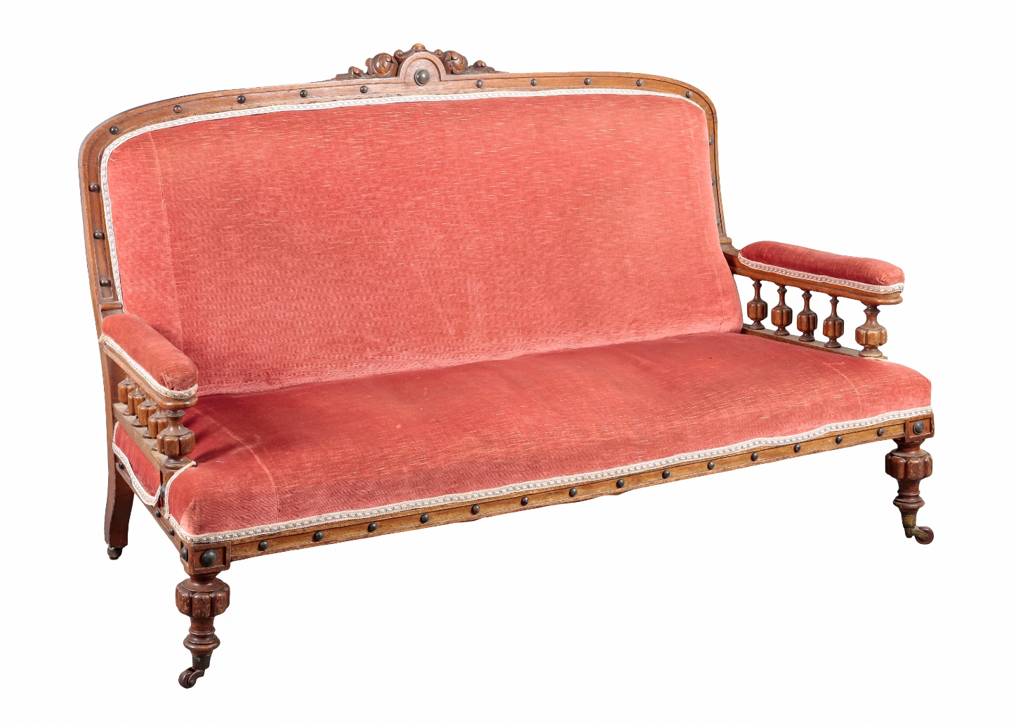 with leaf carved cresting, the arched back with studded details, spindle turned open arms, with stuffed seat covered in pink dralon, on bulbous turned legs and brown ceramic castors, 103cm high x 165cm wide x 70cm deep