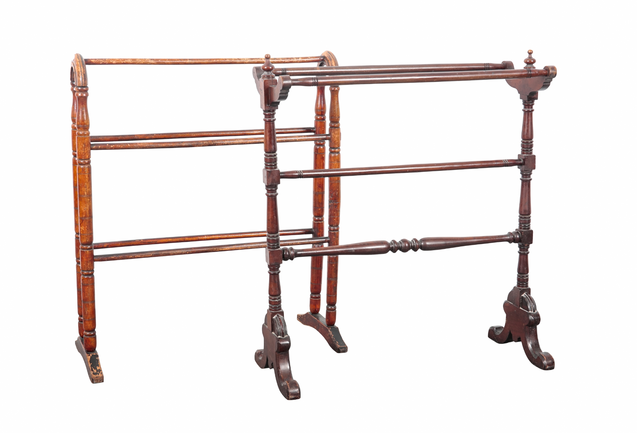 with urn finials above turned supports, 80cm high x 73cm wide; together with another similar, 79cm high x 67cm wide (2)