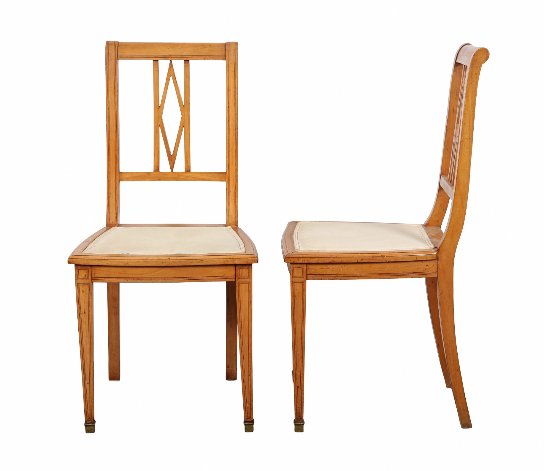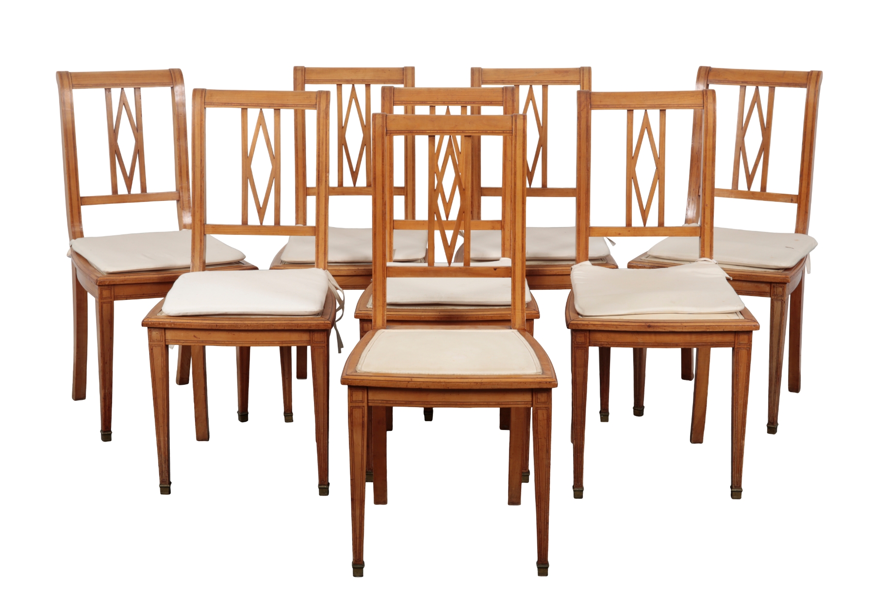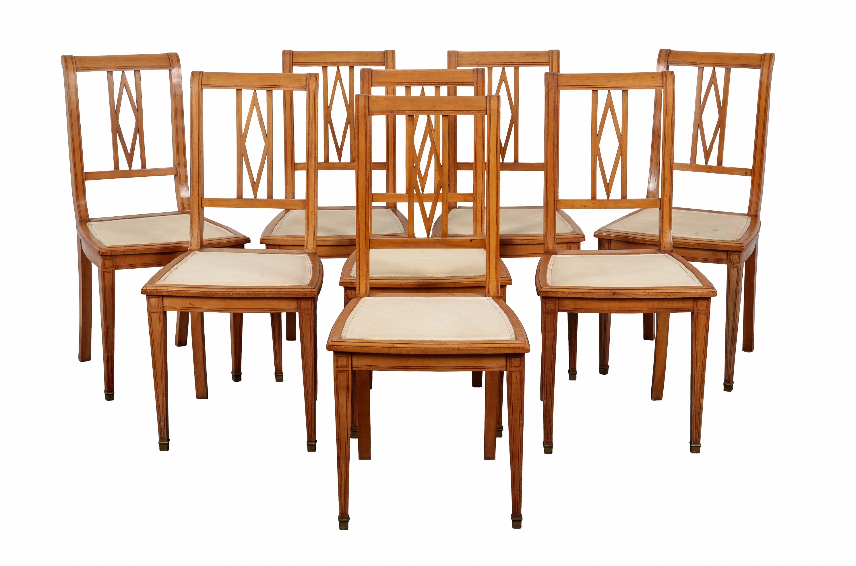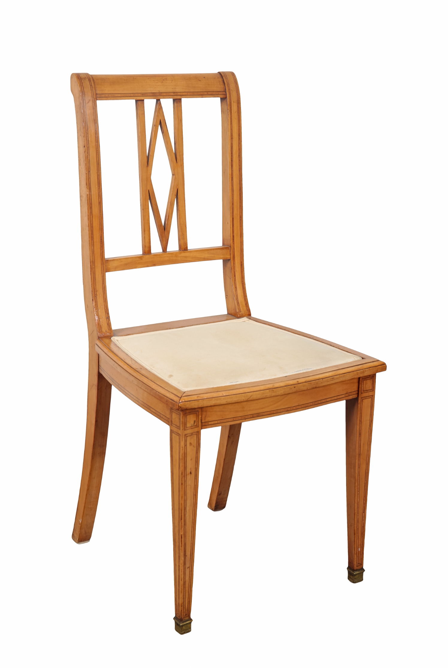 A number are relatively loose at the joins and have a delicate structure. There are some surface marks and scratches throughout consistent with age and use. The cushions and stuffed seat are covered in pale fabric which is faded and has some marks.