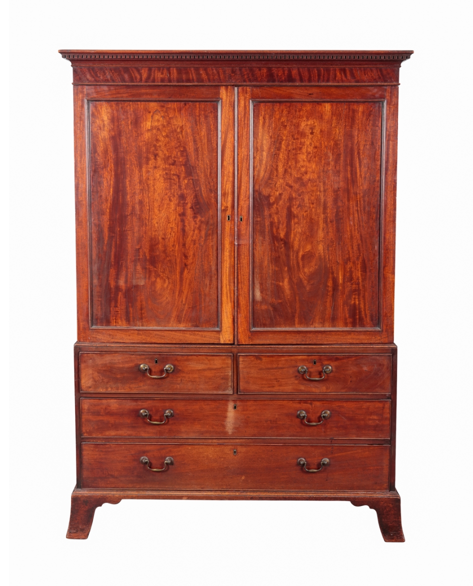 the upper section with a dentil moulded cornice over cupboards opening to a vacant interior fitted with a rail, the base with two short faux drawers and two long graduated drawers, on splayed bracket feet, 181.5cm high x 127cm wide x 59cm deep
