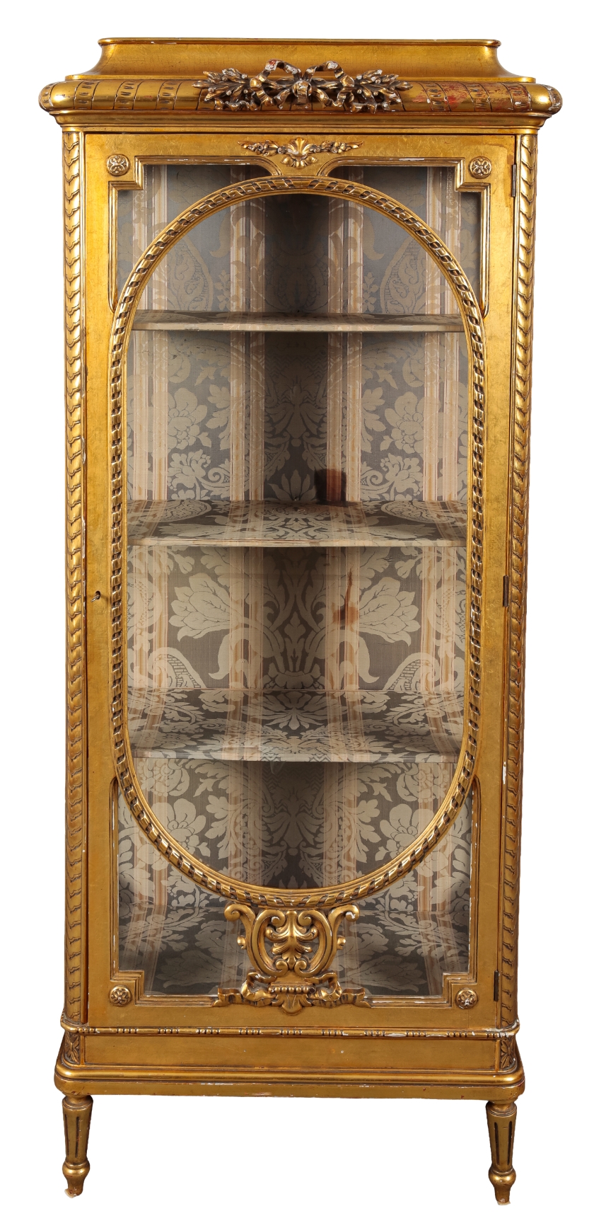 19th century, with ribbon cresting and scale mounts, fitted with three fabric lined shelves enclosed by a single door, on turned, tapered and fluted legs, 171cm high x 73cm wide x 44cm deep