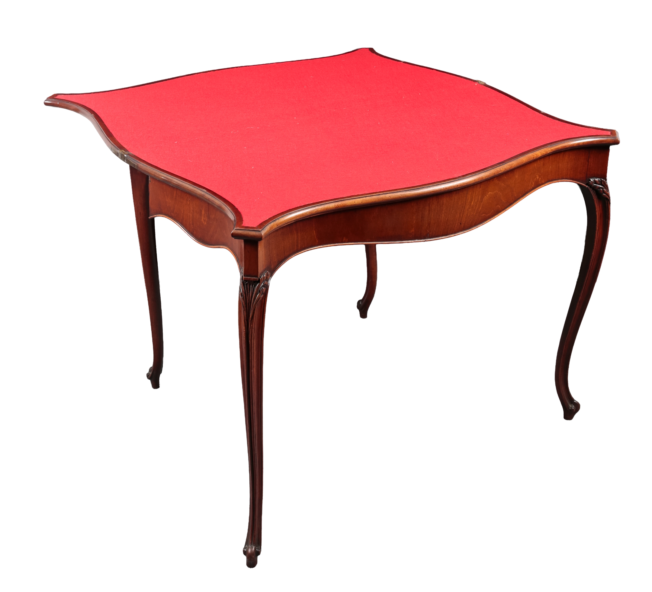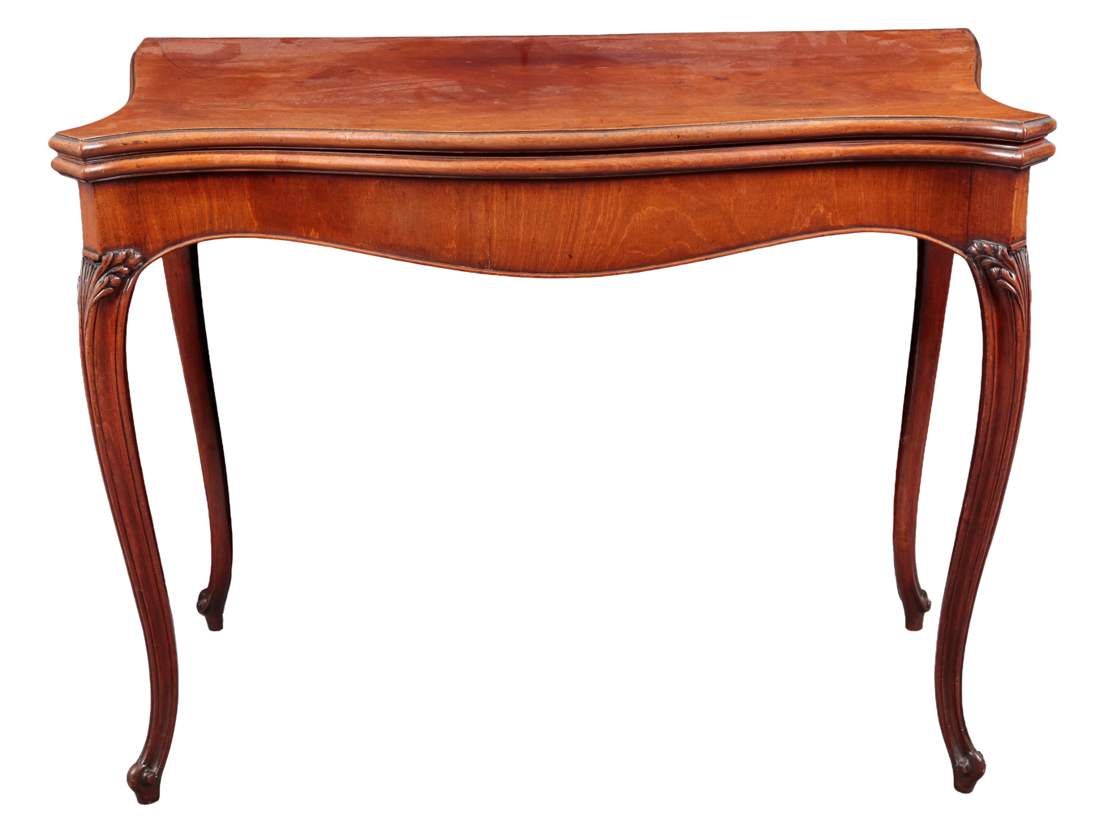 in French Hepplewhite taste, the serpentine top opening to a red baize lined interior, on slender carved cabriole legs ending in scroll feet, 74cm high x 95cm wide x 47cm deep