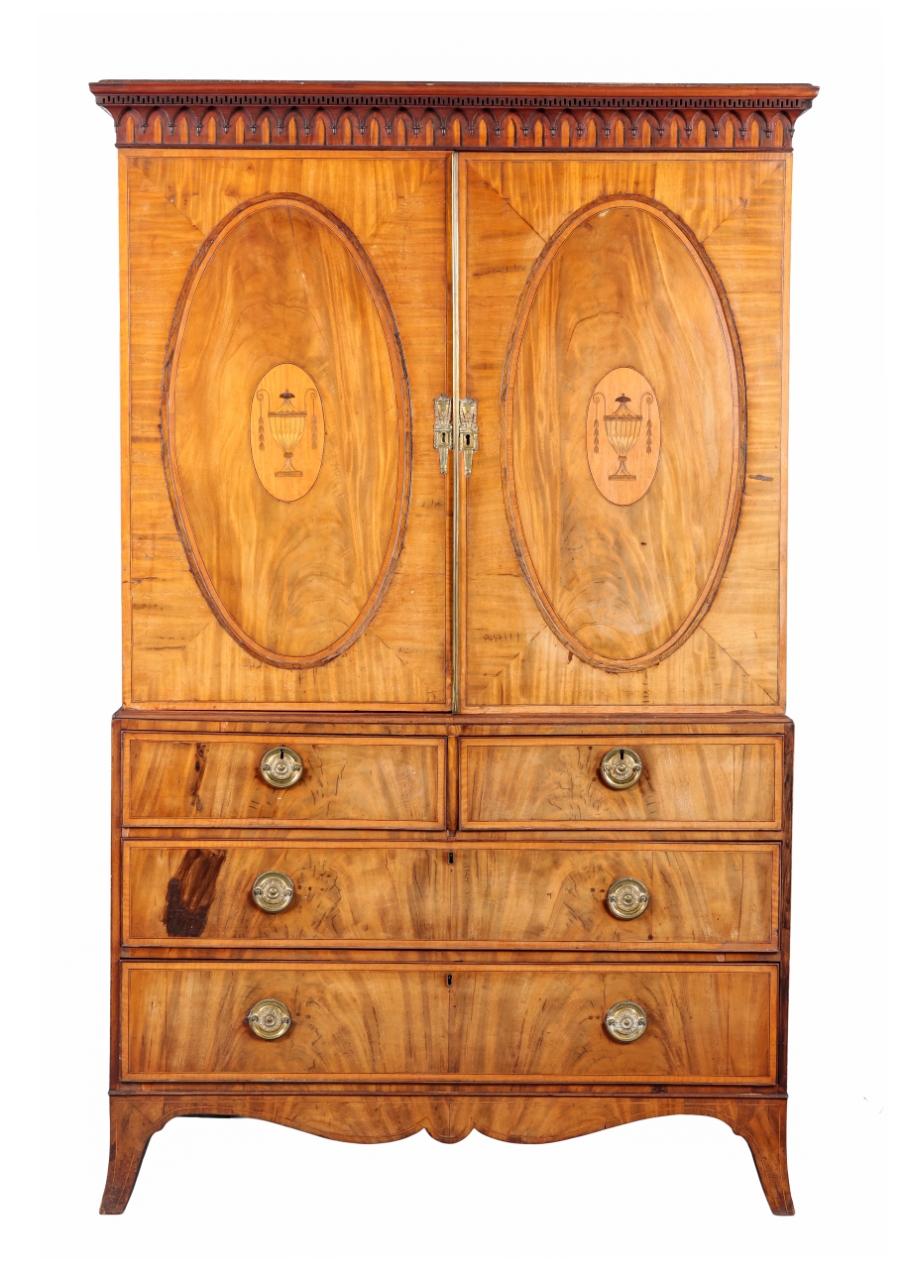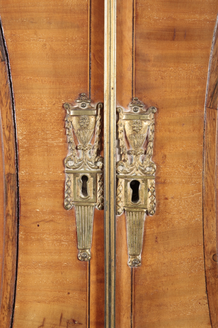 Two large dark marks to the bottom section. Handles replaced. Surface wear and discolouration throughout, as well as some small chips and losses to the veneers. Wear overall consistent with age and use. Structurally ok. An element of moulding from the base detached but present.