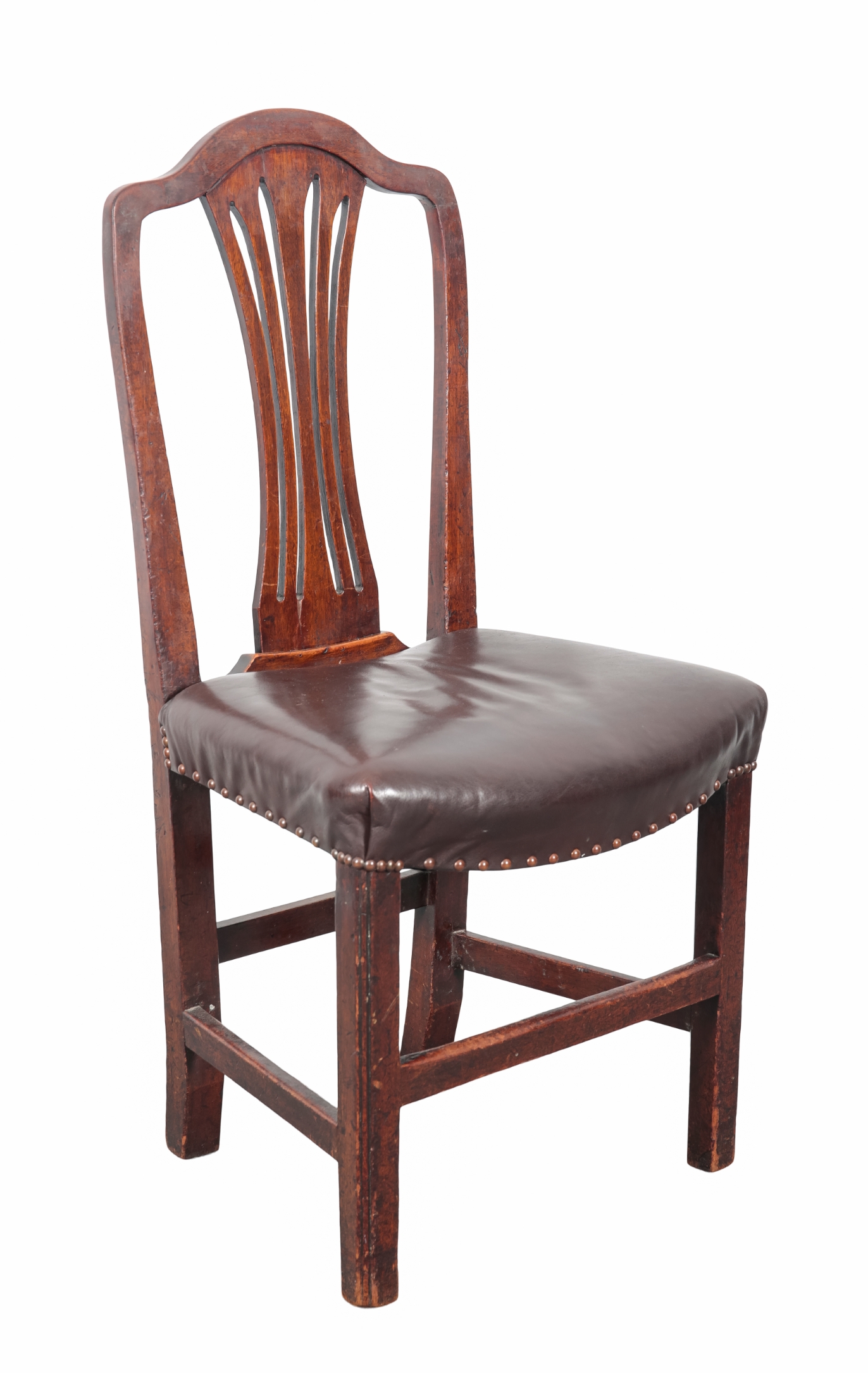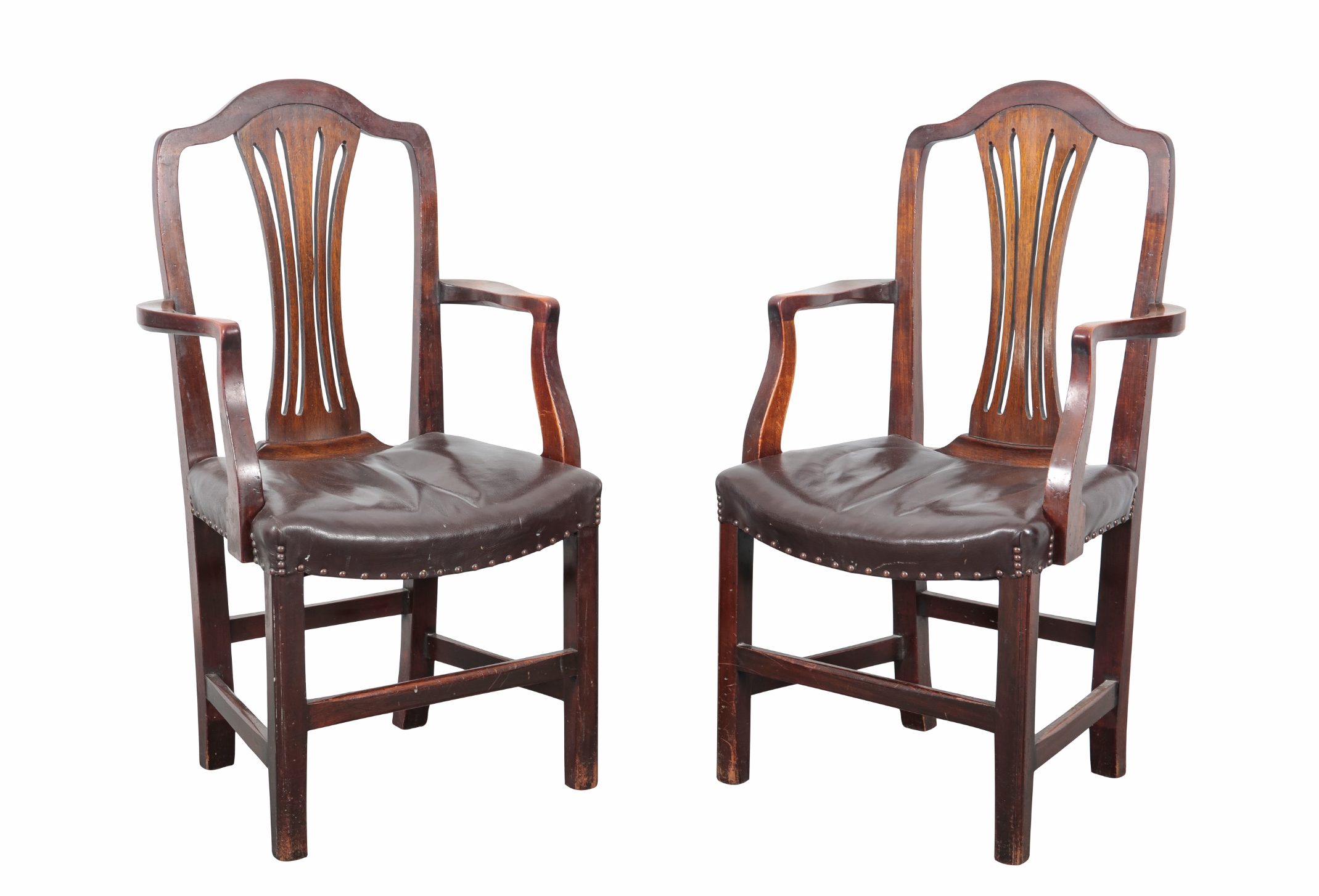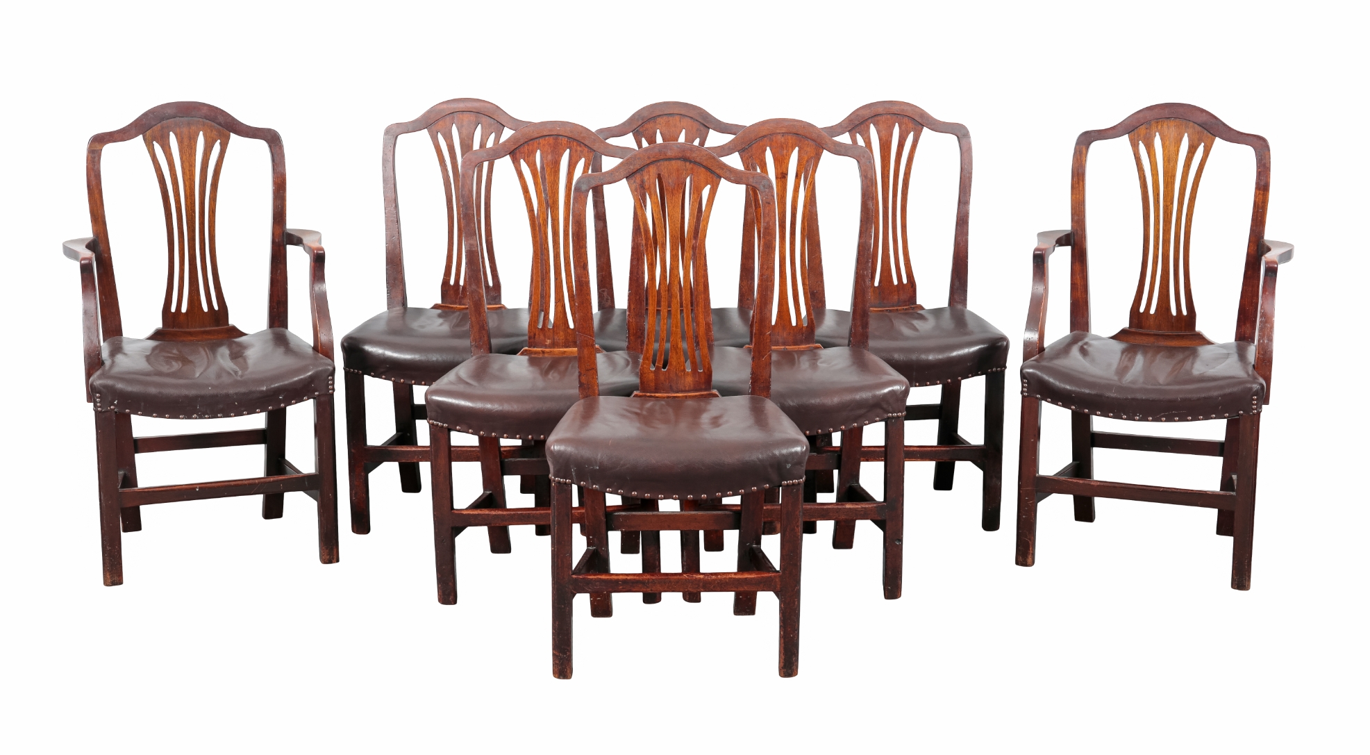 with shaped cresting rails over pierced back splats, the leather covered stuffed seats on moulded square legs joined by stretchers, including two armchairs, 99.5cm high x 56.5cm wide, and six side chairs 98cm high (8)