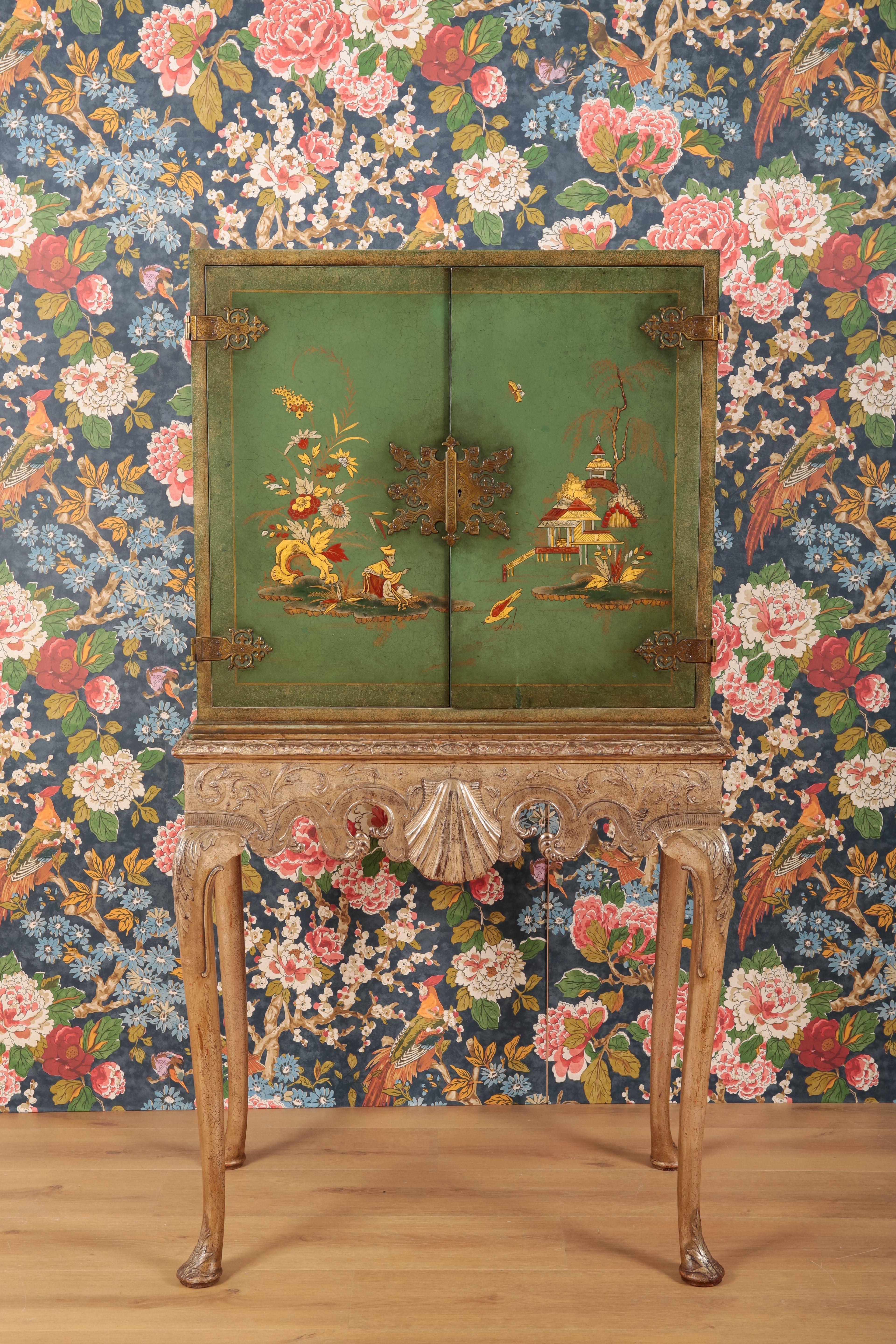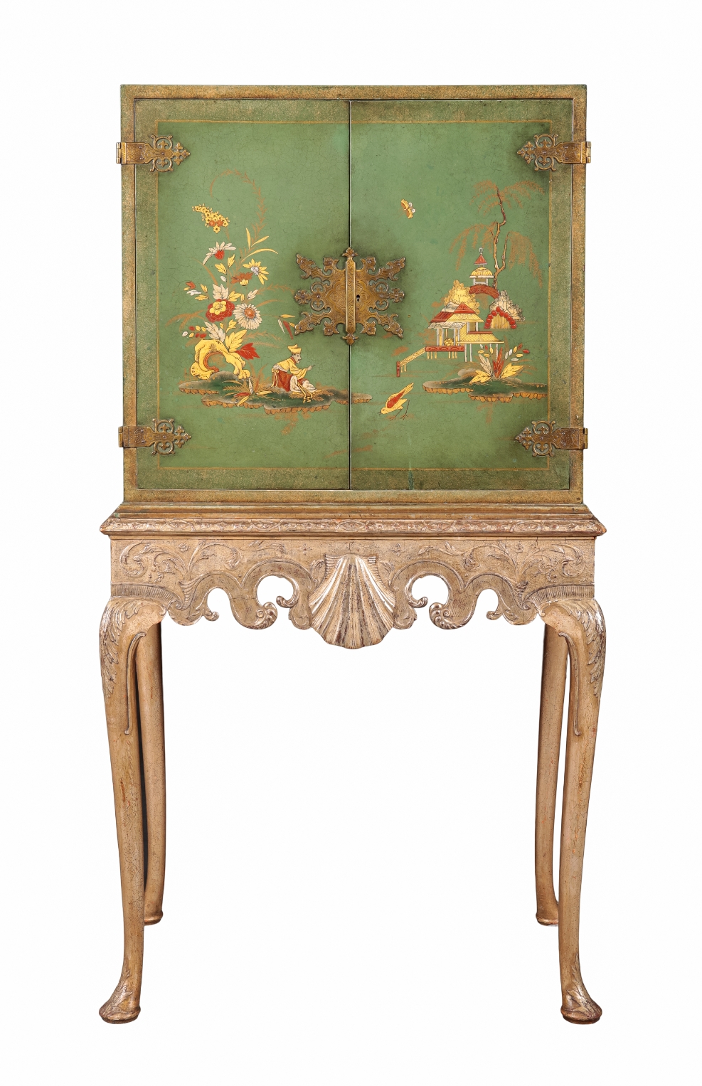The cabinet is in very good condition throughout considering age and storage. There is a repair to the apron of the right flank. The stand has some splits in the wood. There are some areas of paint loss throughout, mostly noticeable to the legs. Some use related marks where the doors meet each other and the structure. Small surface split to the brushing slide. Minor knocks and surface wear commensurate with age.
