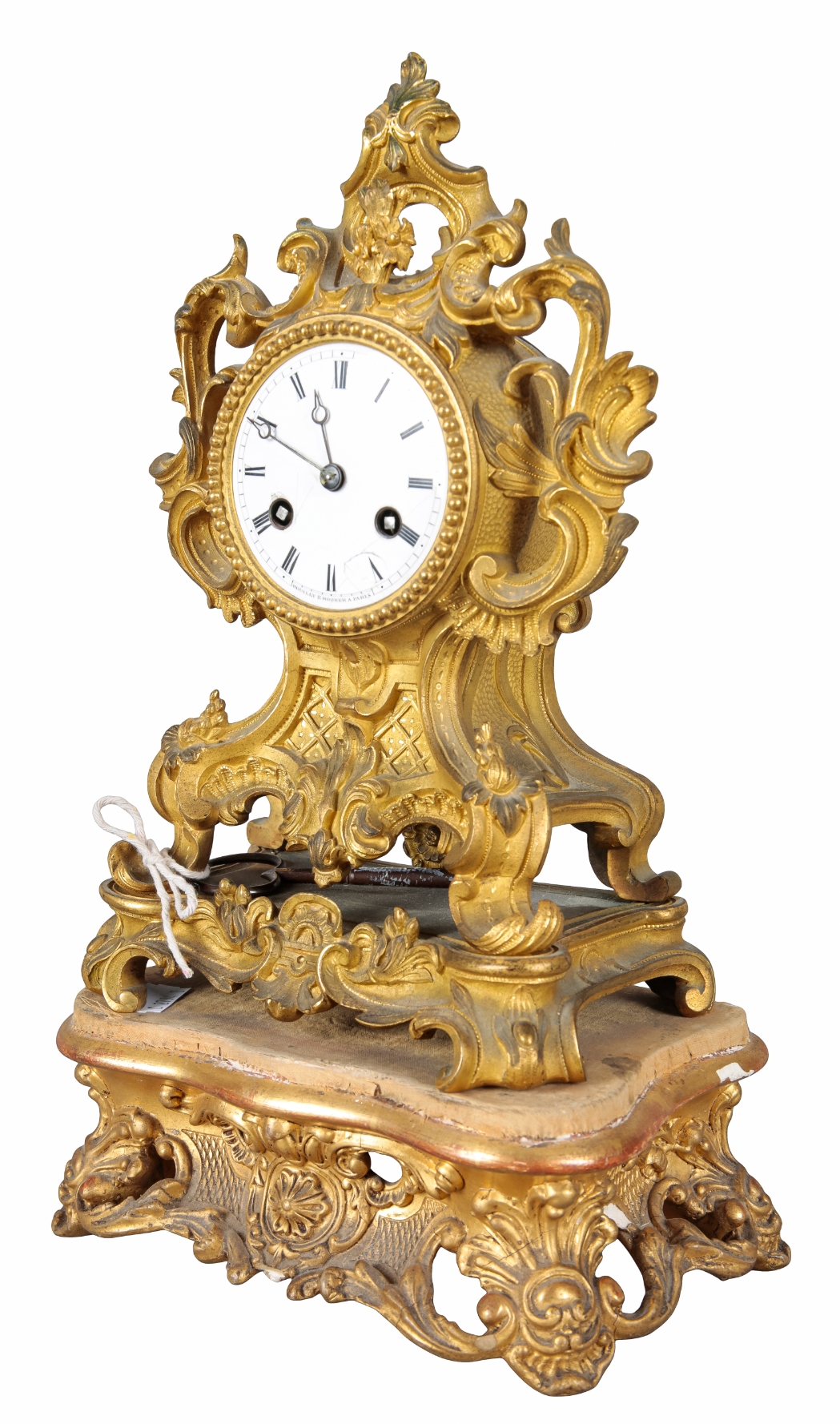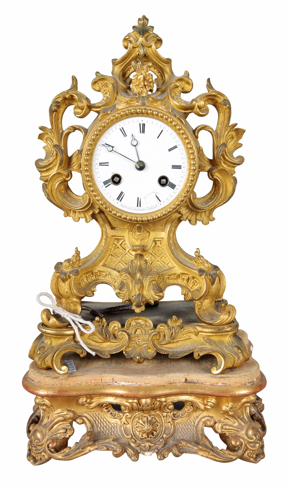 19th century, the two train movement striking on a bell, the white enamel dial with Roman numerals, the case with pierced rococo scrolls and floral cresting, 26cm high, on a giltwood stand bearing an old label to the underside, 33cm high overall (2)