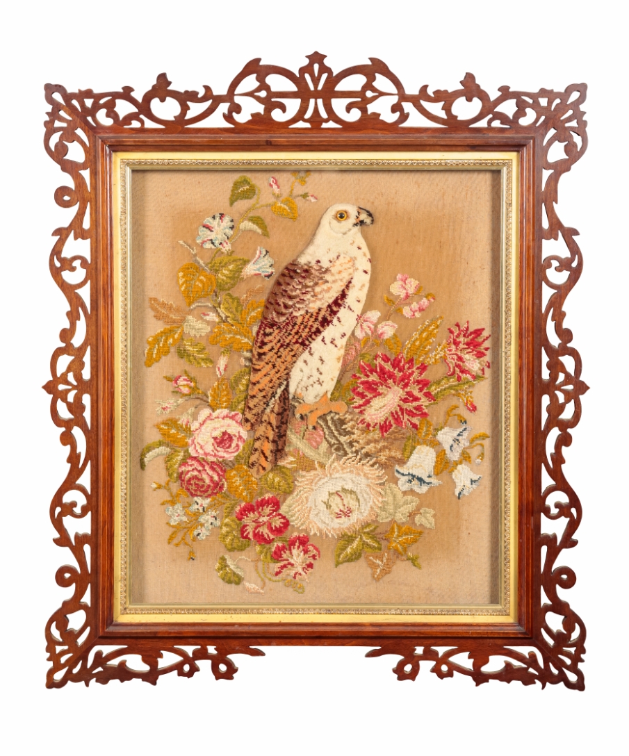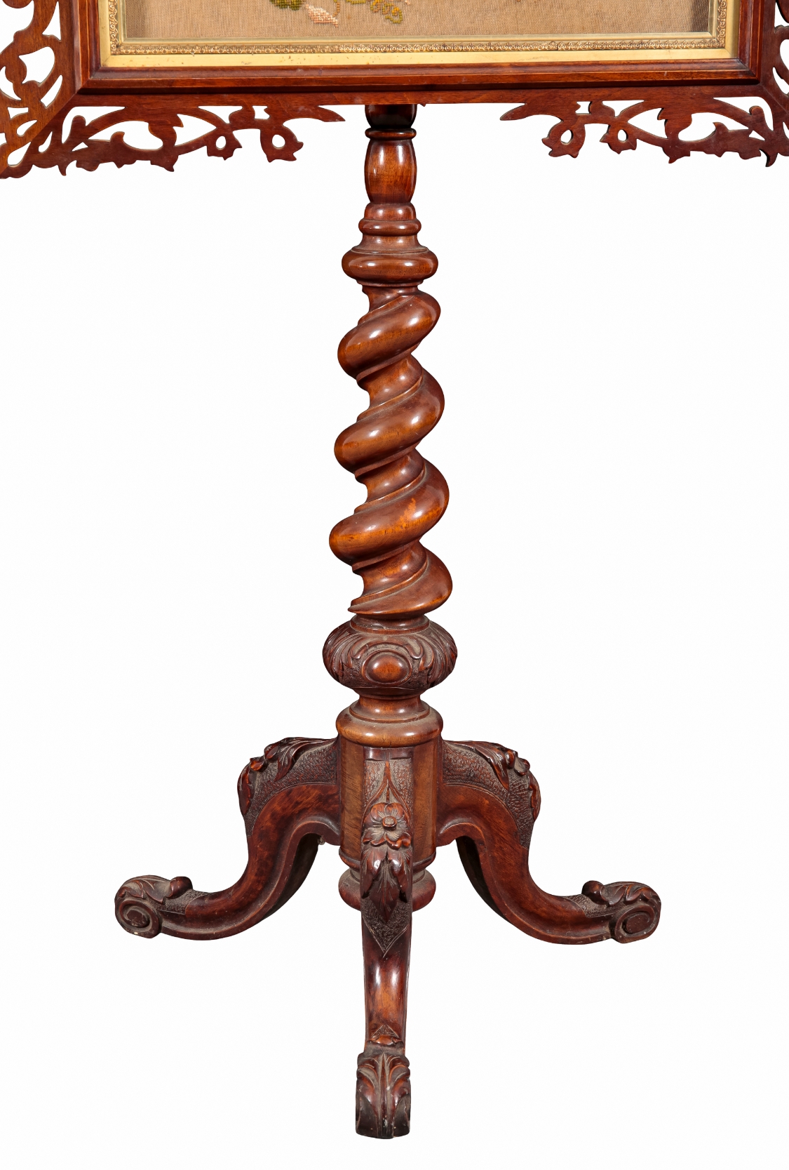the woven tapestry screen depicting a sparrowhawk amongst flowers, glazed and framed in a pierced surround, the tripod stand with urn finial, wrythen stem and leaf carved cabriole legs, 181cm high x 68cm wide