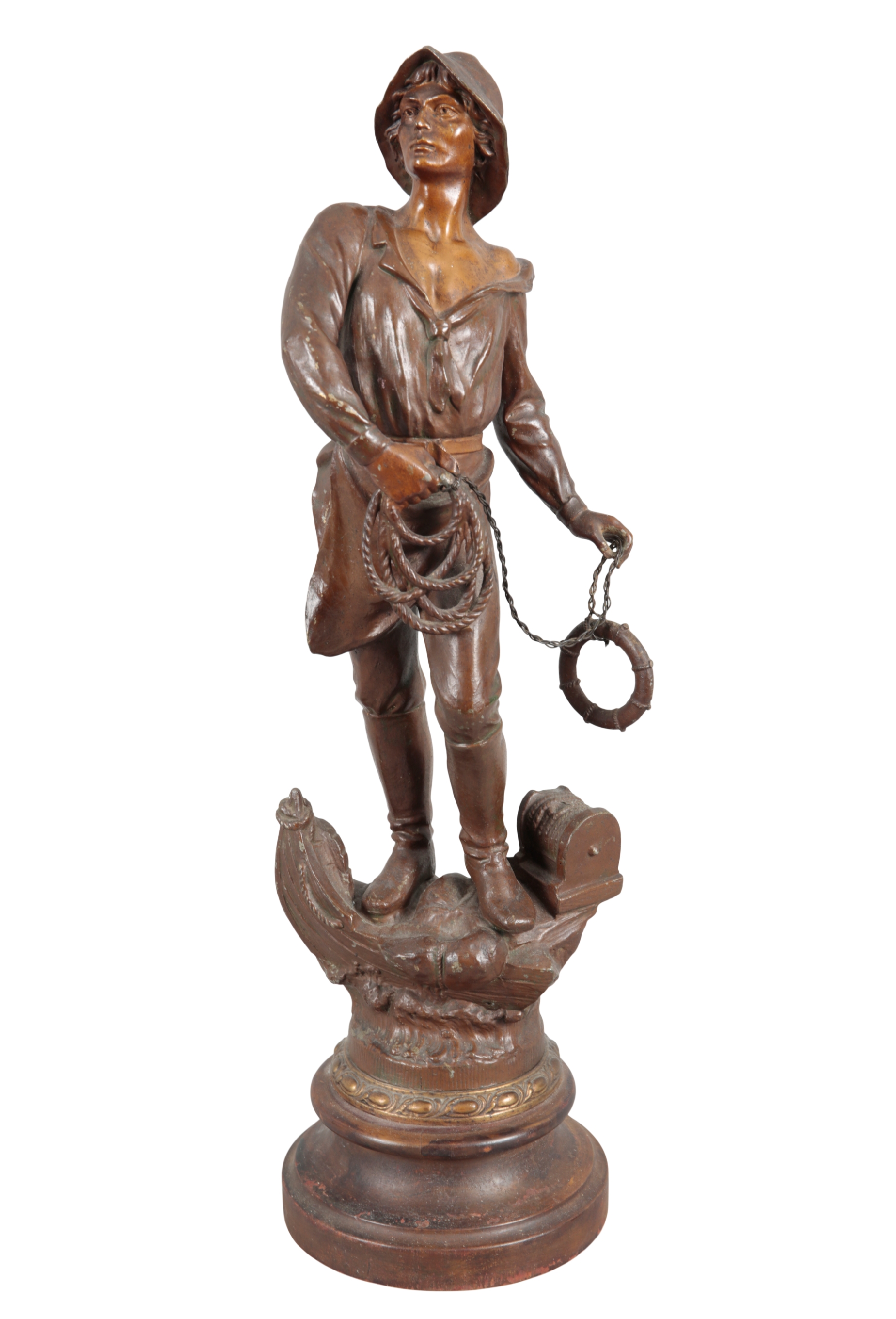 20th century, depicting a railworker holding a pair of iron clamps, a train and tunnel in the base, and a maritime shiphand, holding a lifebuoy, atop a ship's deck, 53cm high (2)