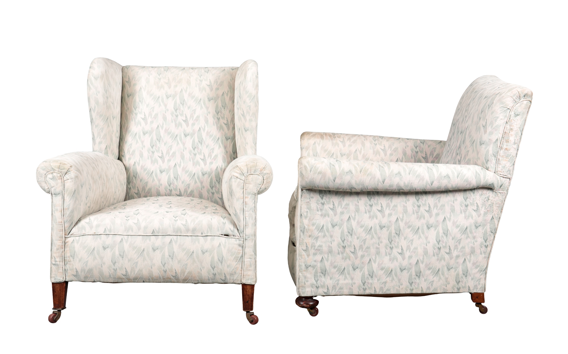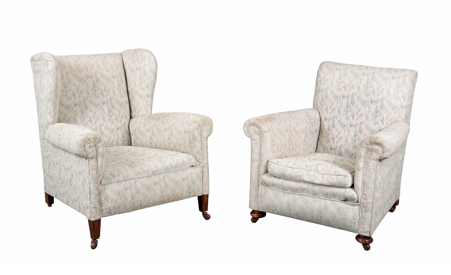 both covered in a pale floral design fabric, one wingback with square tapered front legs, 92cm high x 84cm wide, the other with bun feet, 85cm high x 83cm wide (2)