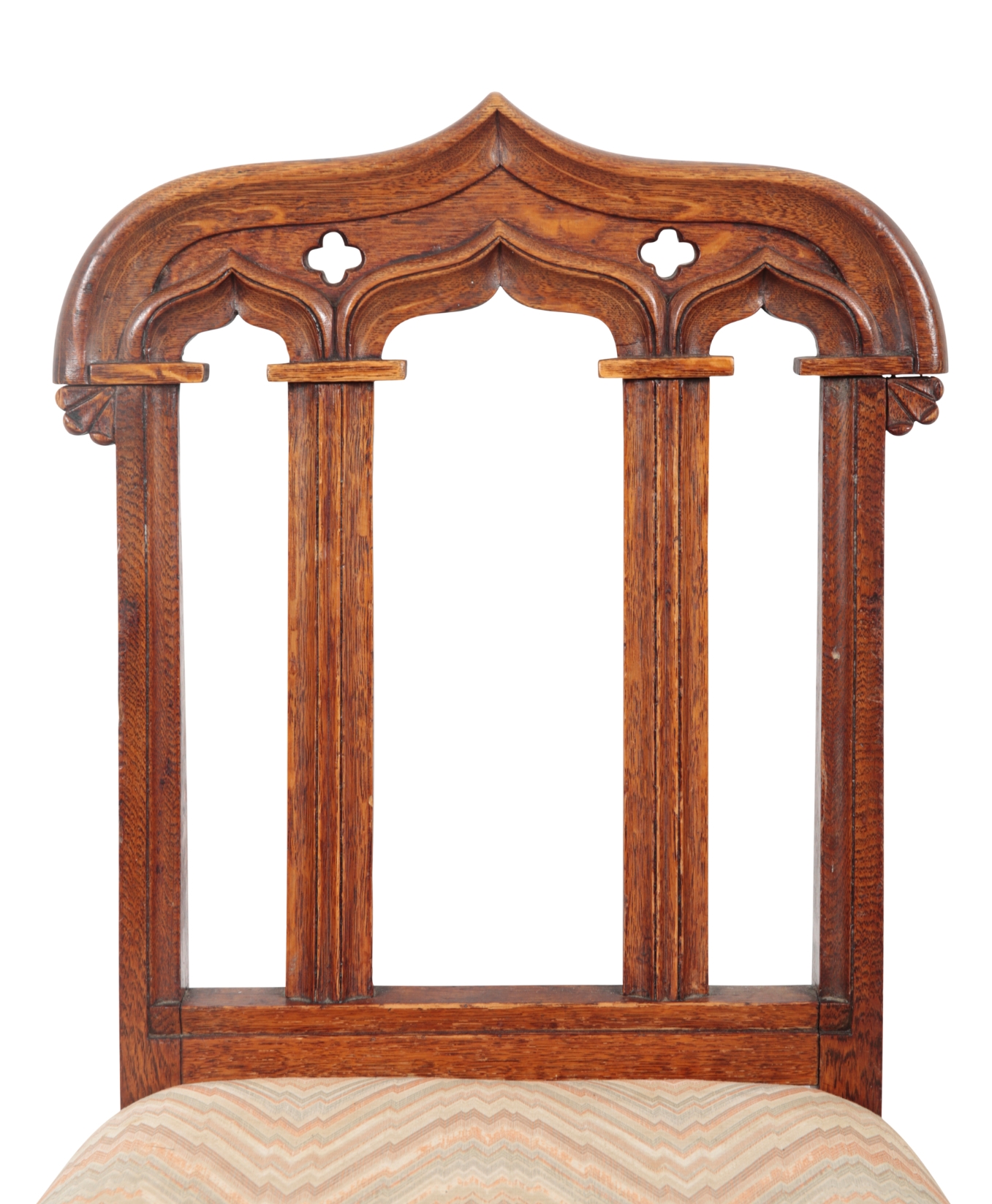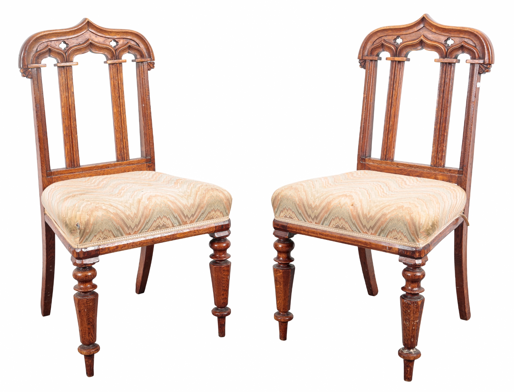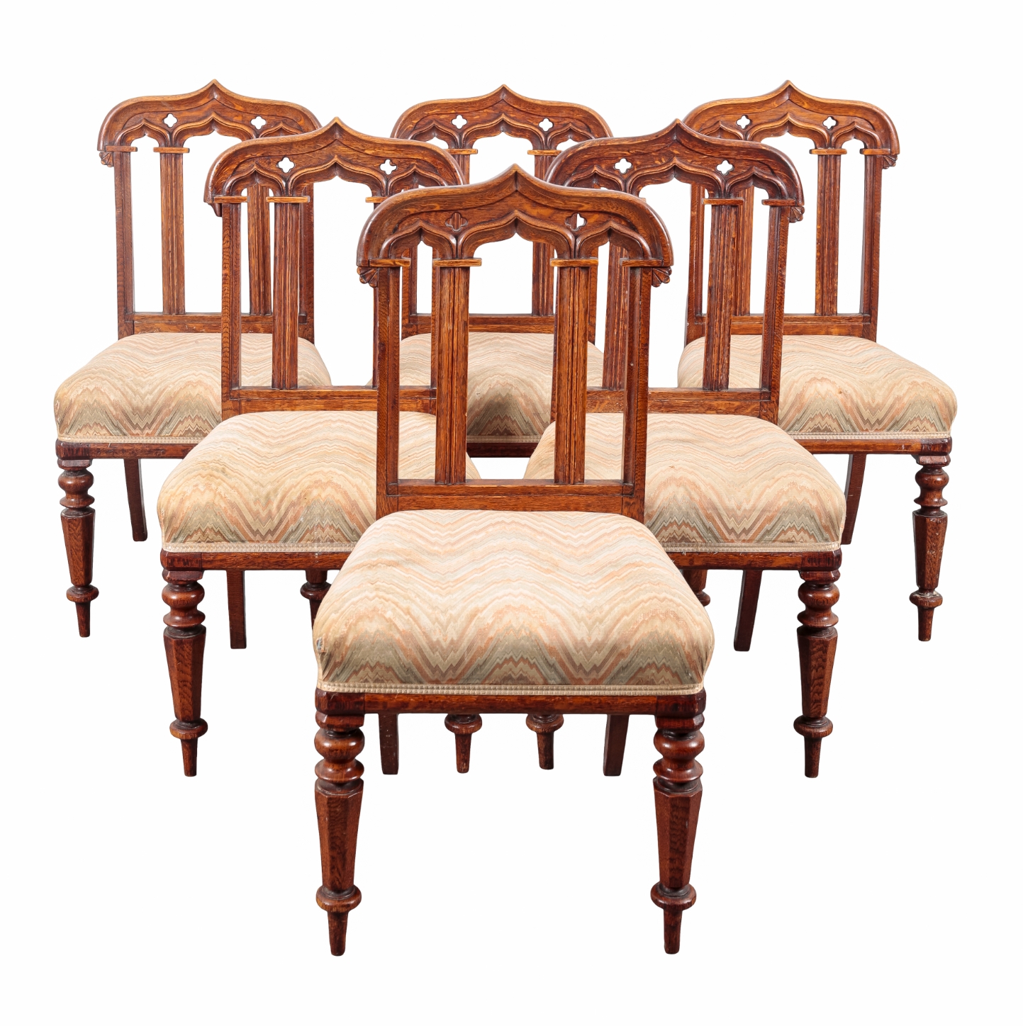 the shaped crestings pierced with quatrefoils over gothic arched backs with moulded vertical splats, the stuffed seats with wavy striped cloth covers, on turned and chamfered front legs, 96cm high x 49cm wide (6)