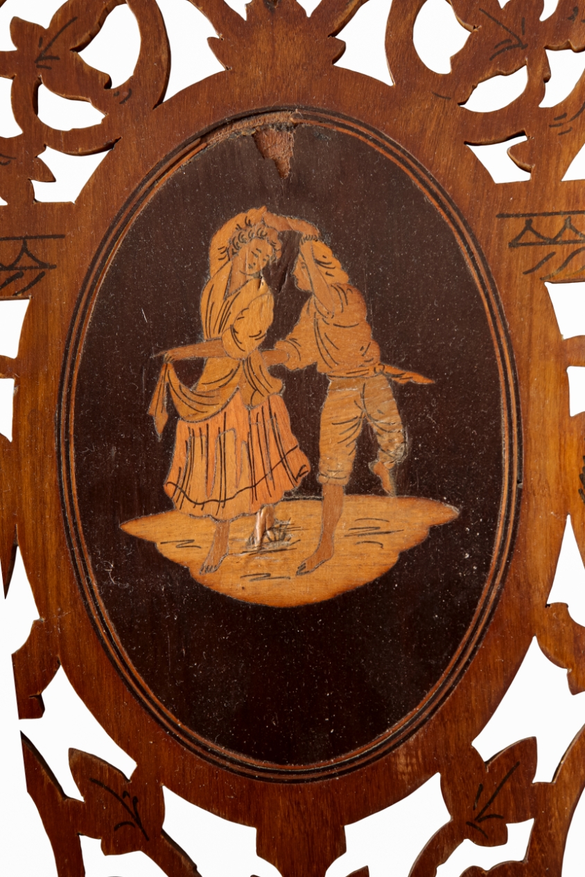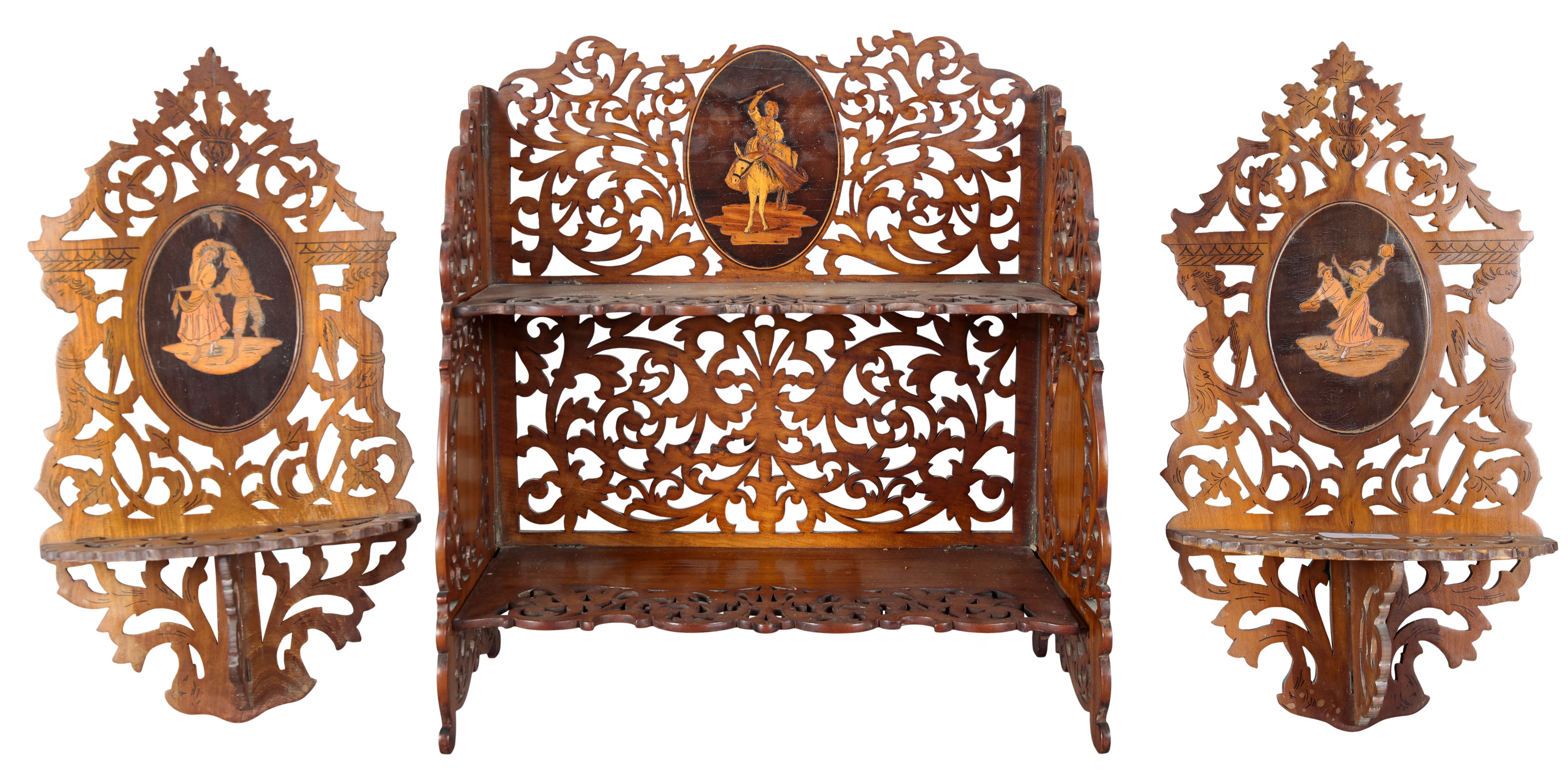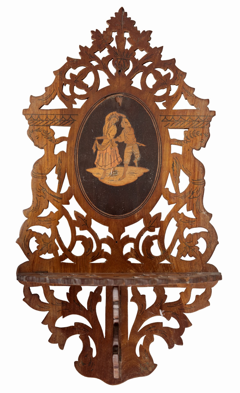 with an oval panel to the cresting inlaid with a figure on a donkey, 38cm high x 35cm wide; together with a pair of similar wall brackets, 20cm (3)