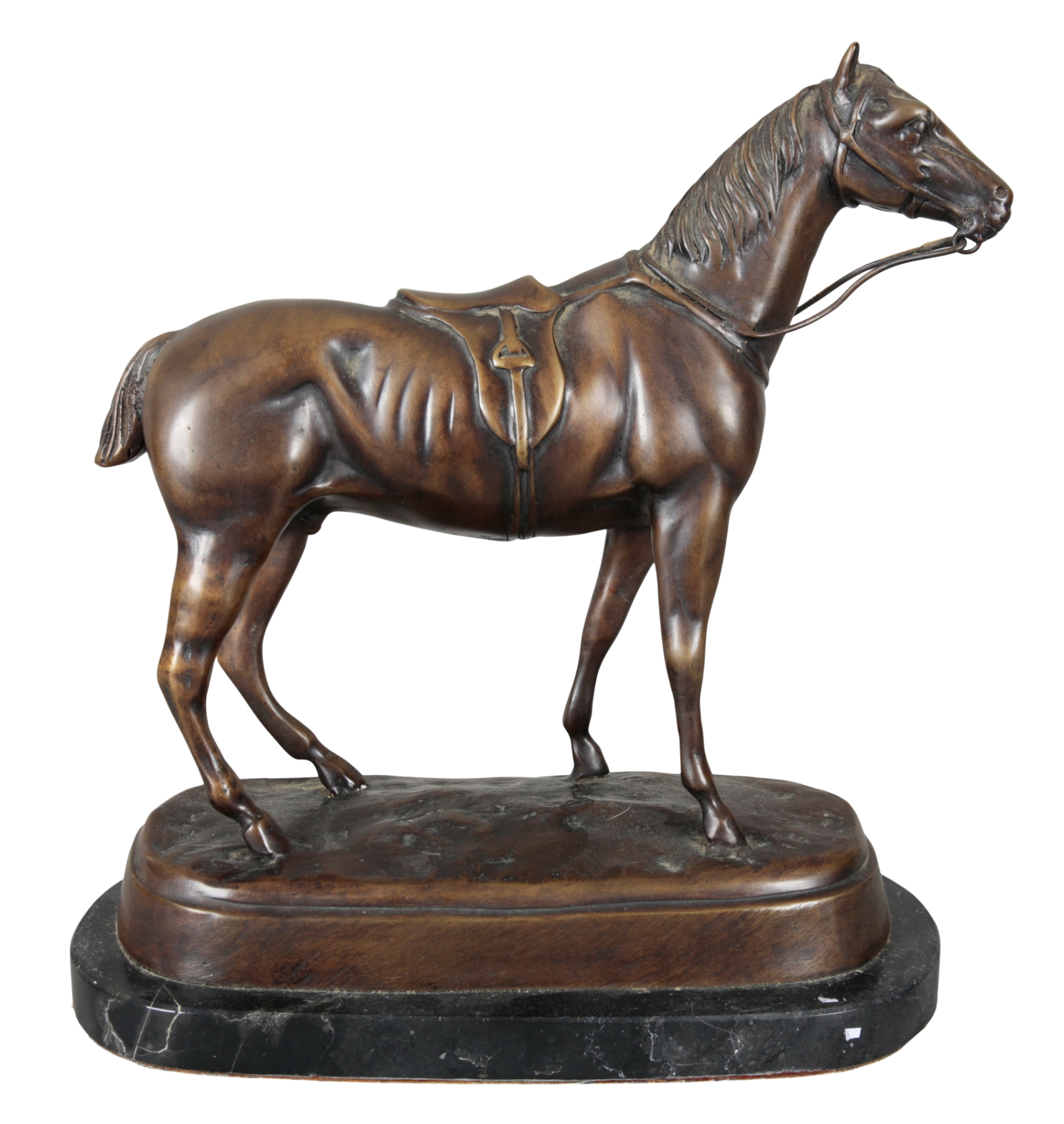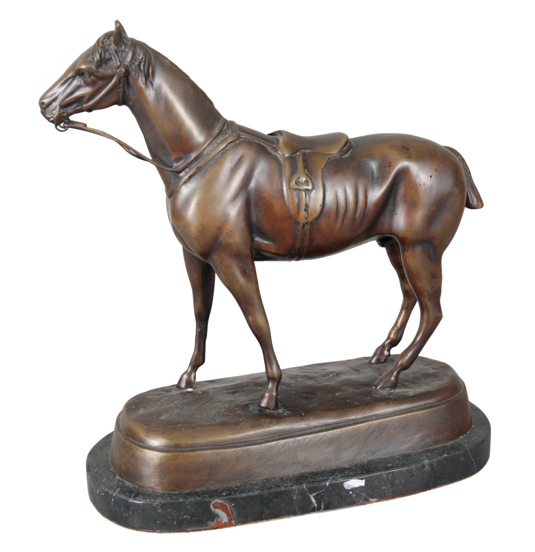 20th century, figured naturistically wearing saddle and reins, on a marble plinth base, 29cm high x 27cm wide