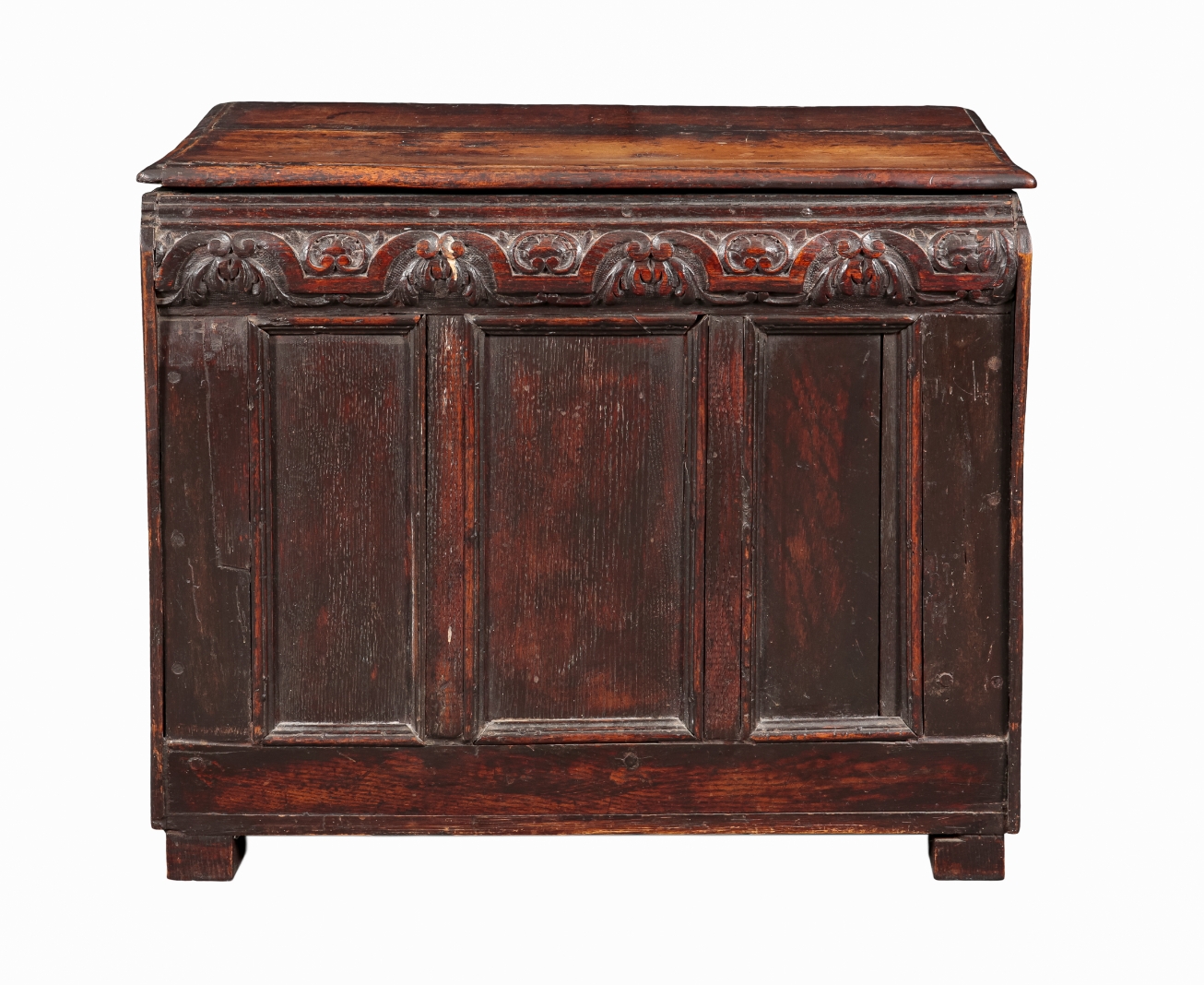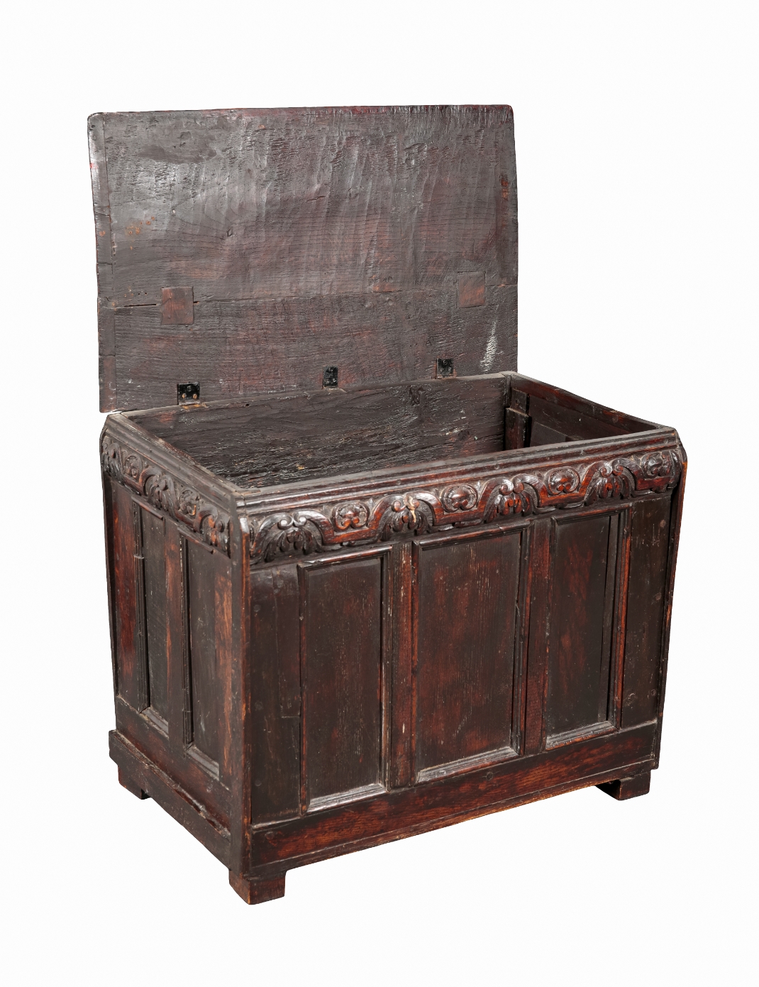 18th century and later, the hinged top opening to a vacant interior, with a foliate carved frieze and panelled sides, 61cm high x 74cm wide x 45cm deep