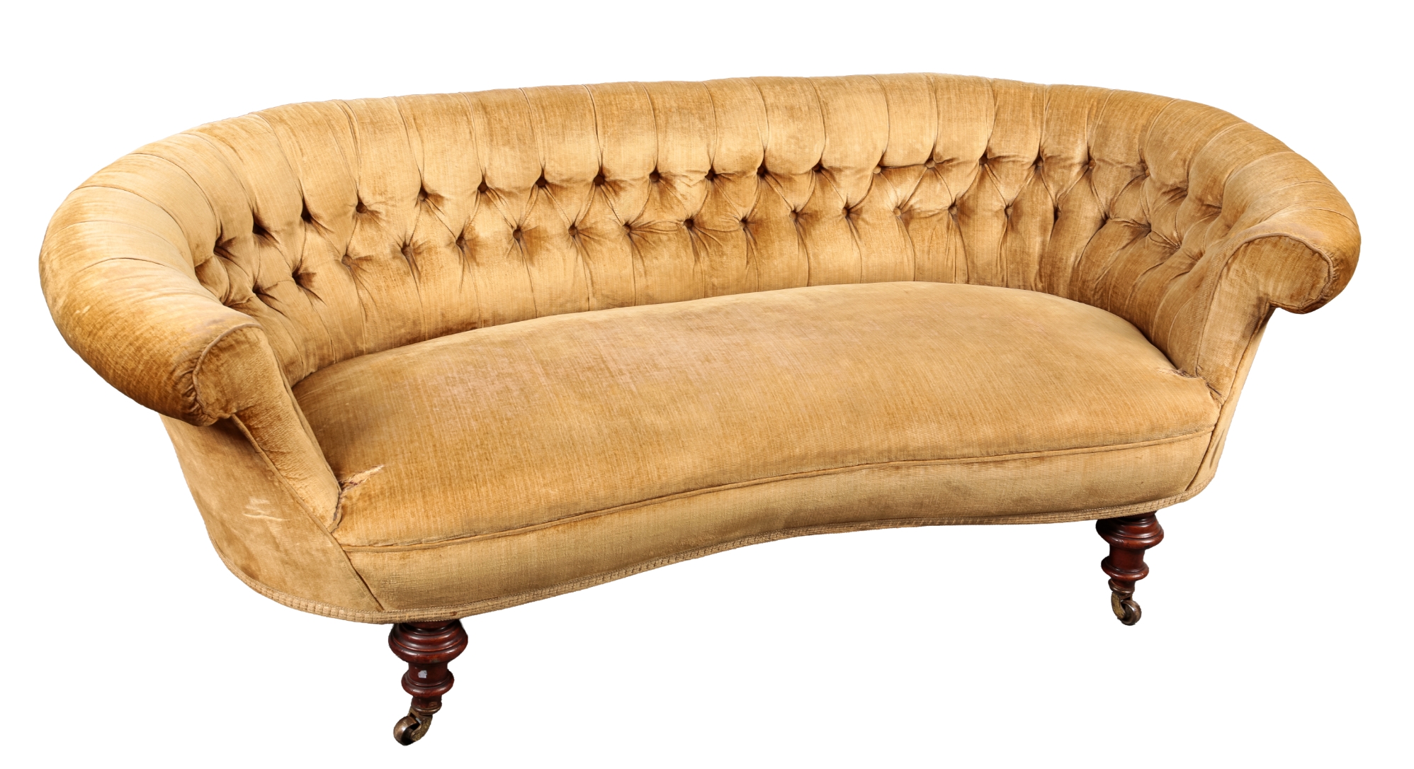 with button back gold velvet covers, on turned front legs and outswept rear legs terminating in castors, 65cm high x 172cm wide x 80cm deep
