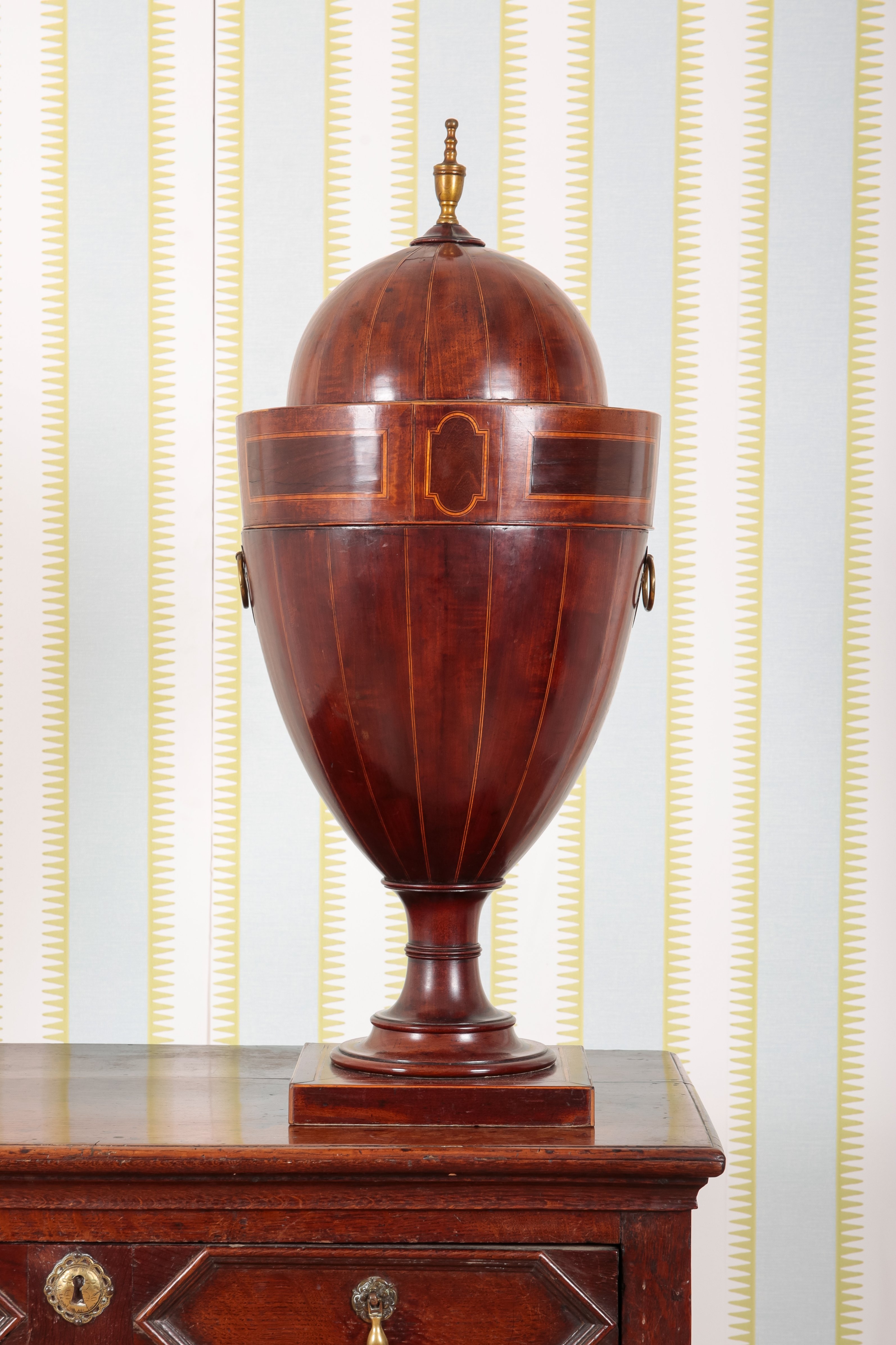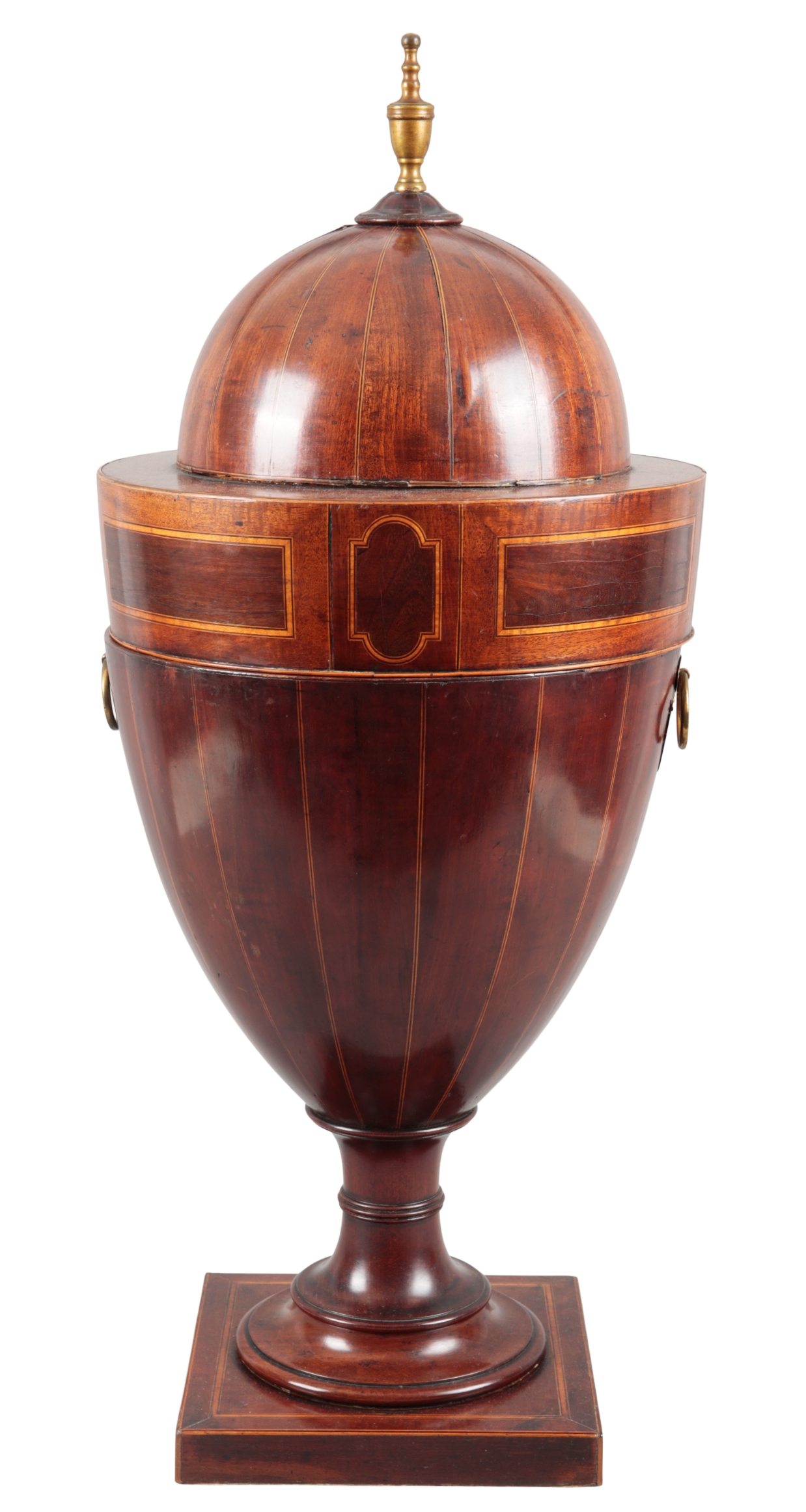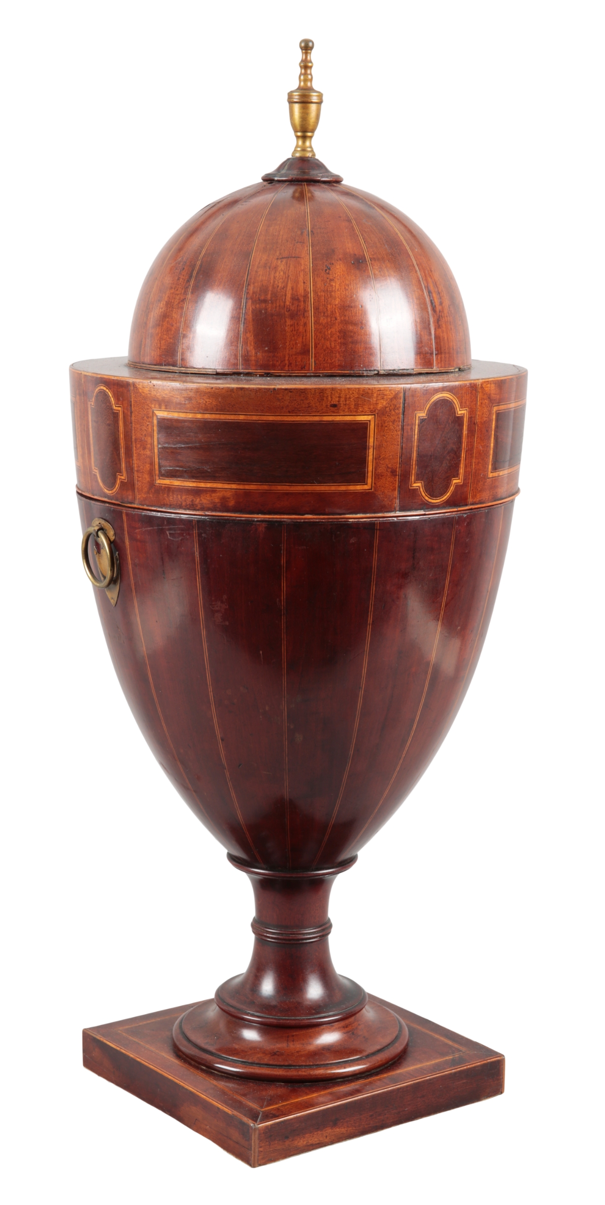 AN IMPRESSIVE GEORGE III MAHOGANY AND SATINWOOD STRUNG CUTLERY URN