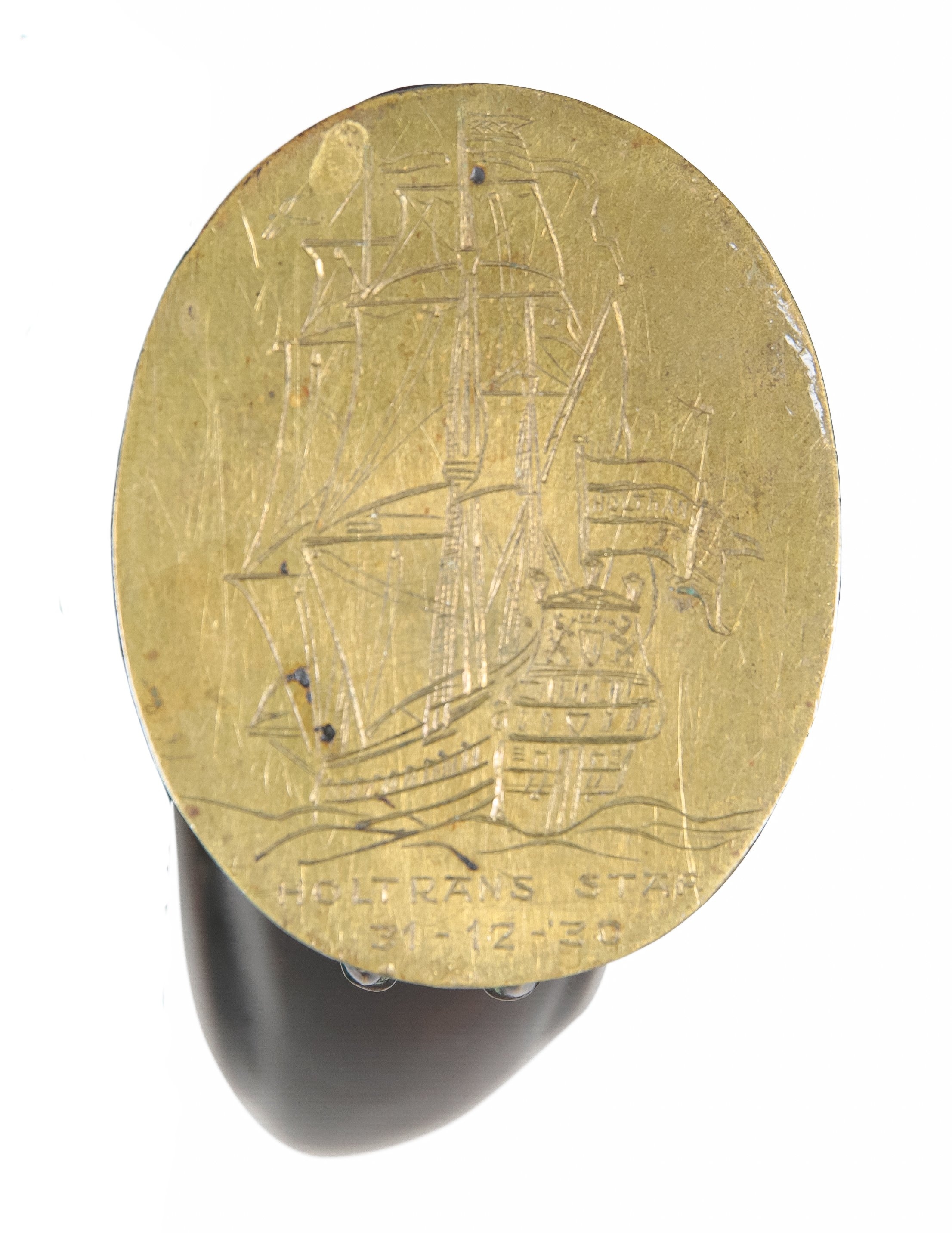early 20th century, modelled on a circular plinth base etched to the underside with an image of a sailing ship flying a flag 'Holtrans', further inscribed 'HOLTRANS STAF 31-12-'30', 9.5cm high