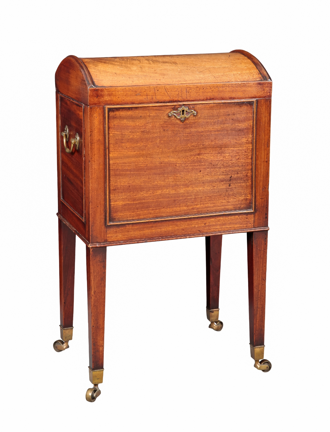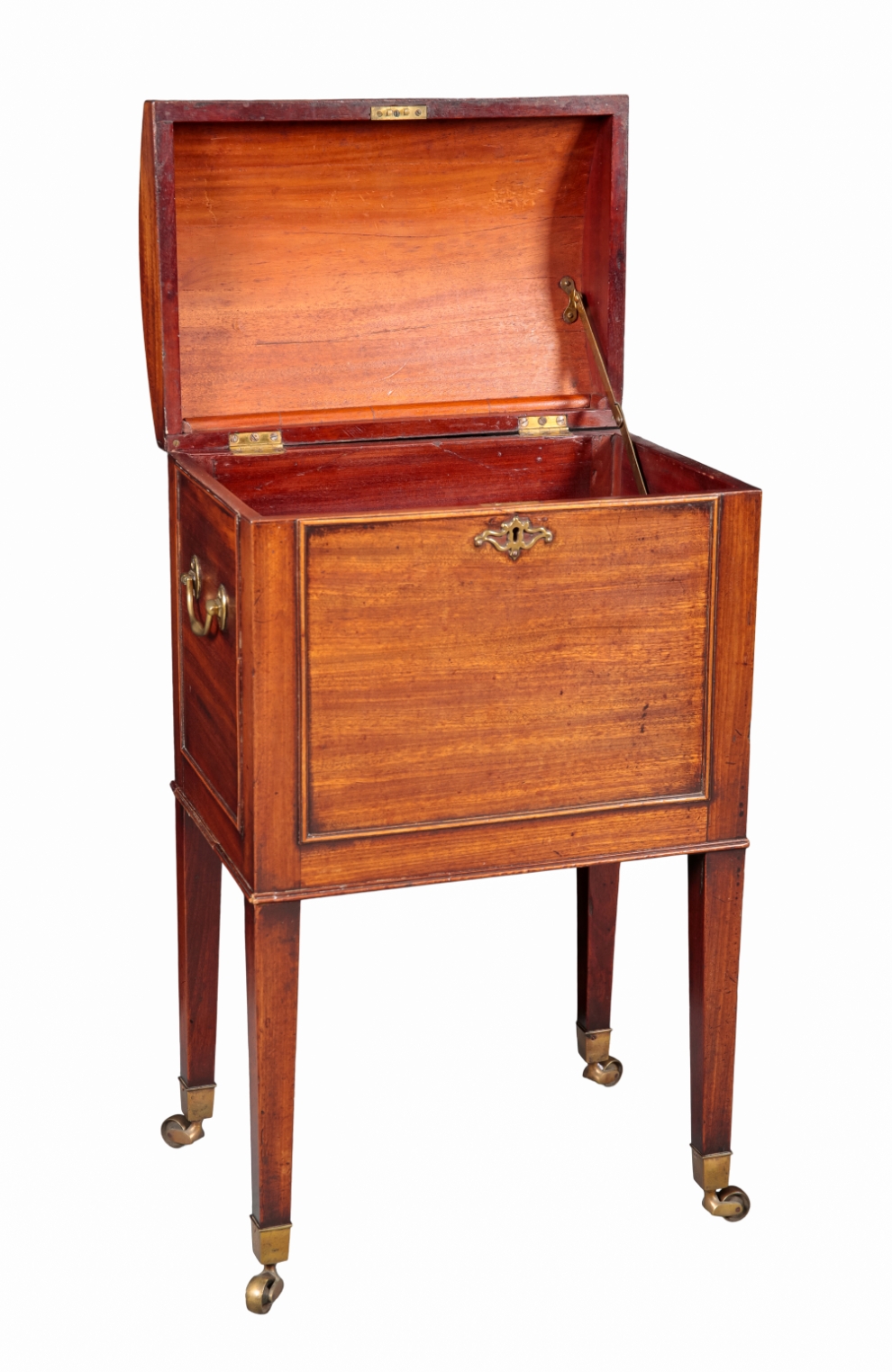 the domed top opening to reveal a partitioned baized-lined interior, brass swing handles to the sides, on tapered square legs terminating in brass castors, 75cm high x 42cm wide x 30cm deep